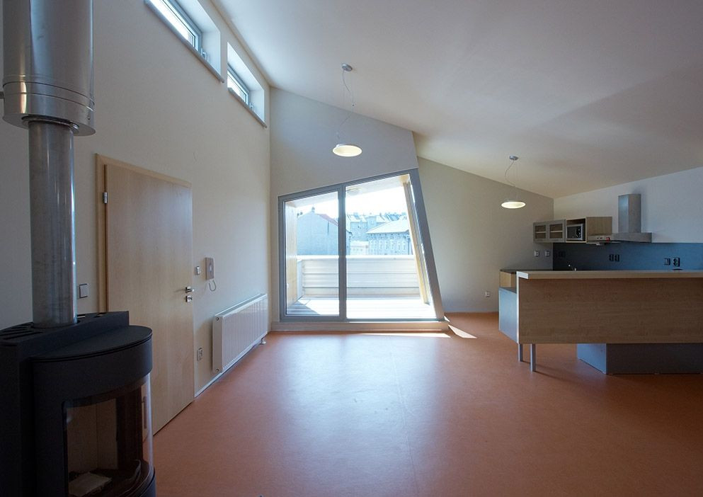 Stavbu můžeme chápat jako dřevostavbu. Především třetí nadzemní podlaží tuto charakteristiku naplňuje. Podlaží je zakončeno pilovou střechou, která svým tvarem koresponduje s nedalekými továrnami. Jsou v něm umístěny neobvyklé okenní otvory s dvěma bytovými jednotkami. Pilová střecha vpouští do velkorysých bytových prostor „bazilikální" osvětlení, což jim přidává na jedinečnosti i kvalitě obytného prostoru. Tímto tvarem poskytuje stavba doslova zážitek z interiéru, který je tvarem střechy unikátní. Romantické podkrovní bydlení tak získává další rozměr.