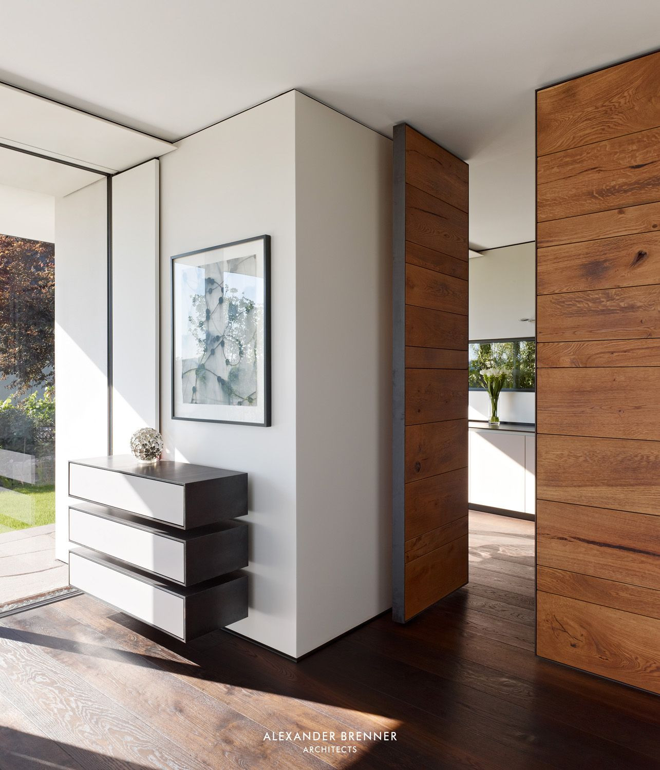 Jedním z přání klientů také bylo, aby si v domě mohli vystavit své umění. Proto do něj architekt umístil světlé a decentní prostory sloužící pouze jako doplněk a něžné pozadí. Podlaha z tmavého dřeva vizuálně propojuje všechny místnosti do jednoho harmonického celku, který ale může být, pokud je třeba, rozdělen. Například mezi kuchyni a jídelnu lze vsunout posuvnou příčku s dveřmi ze stejného dřeva, jaké je použito na podlaze.