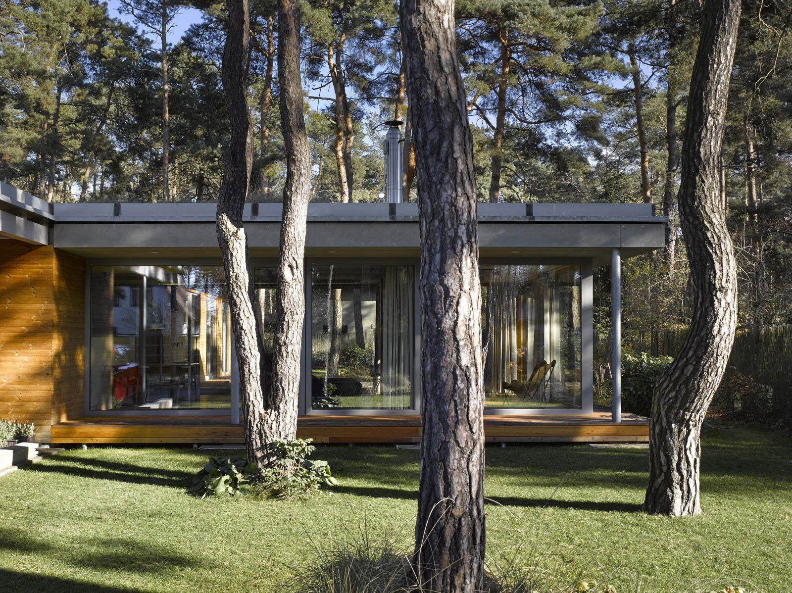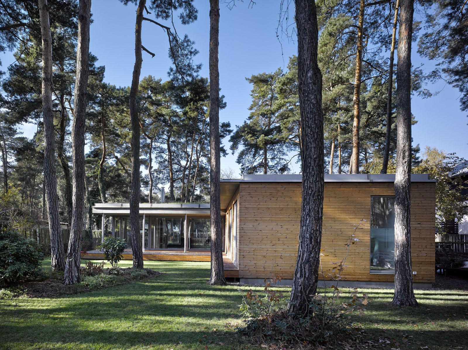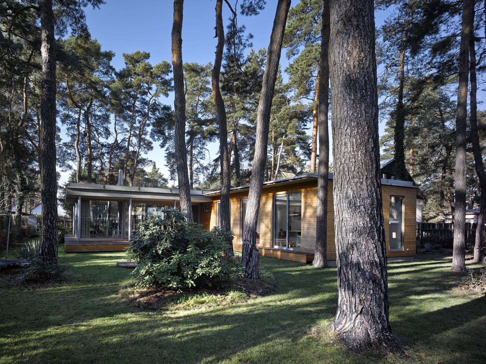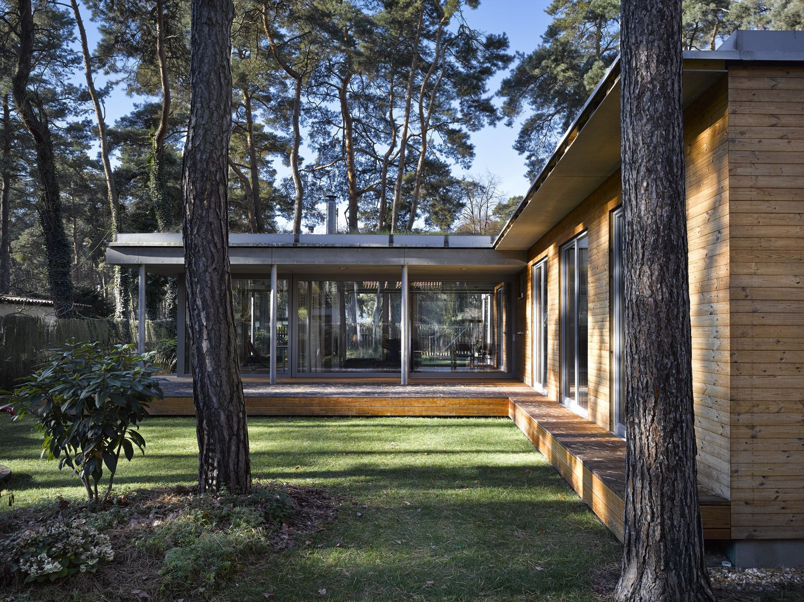 Přízemní rodinný dům prosvítající mezi kmeny stromů. Stírající se hranice mezi tím, co je uvnitř a co venku. Horizontální linie teras a střechy levitující na proskleným pokojem. Tento dům prostě dokazuje, že můžete mít obývací pokoj i uprostřed lesa a v zástavbě. Protiklady neexistují.