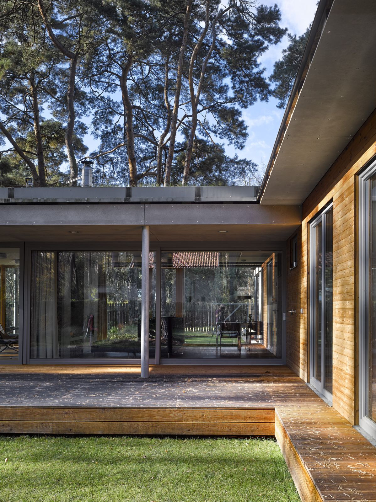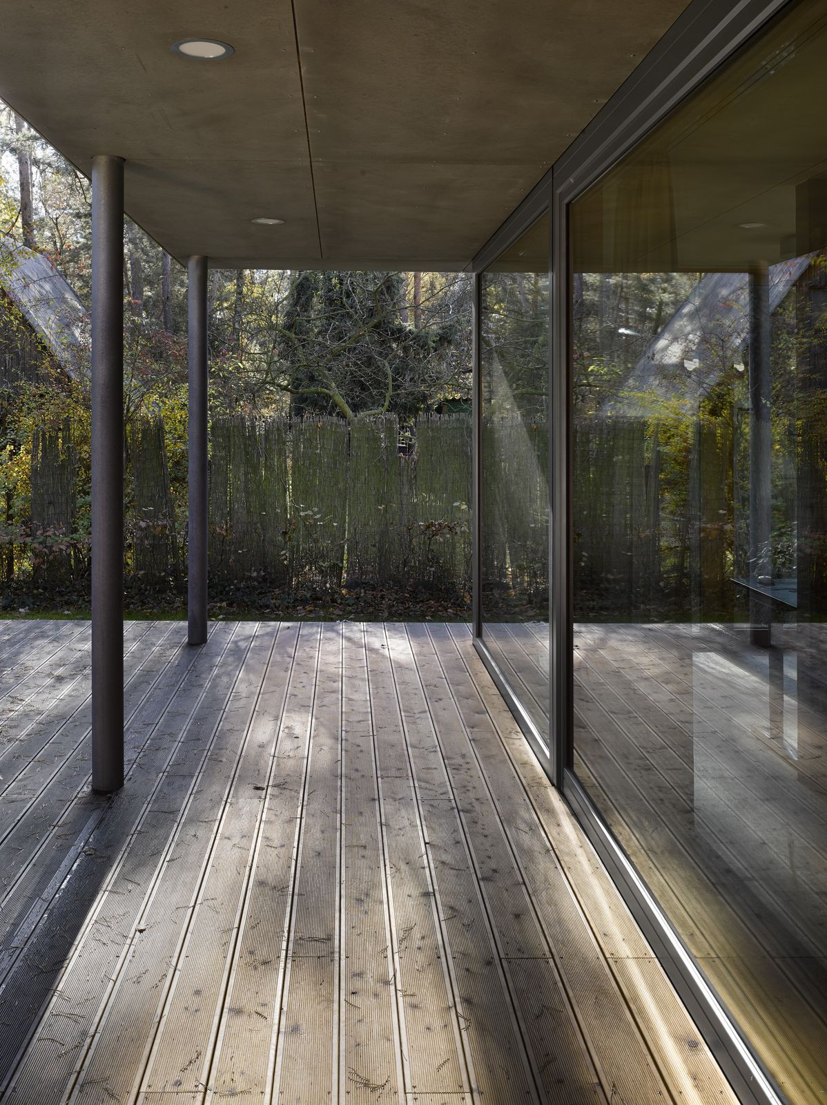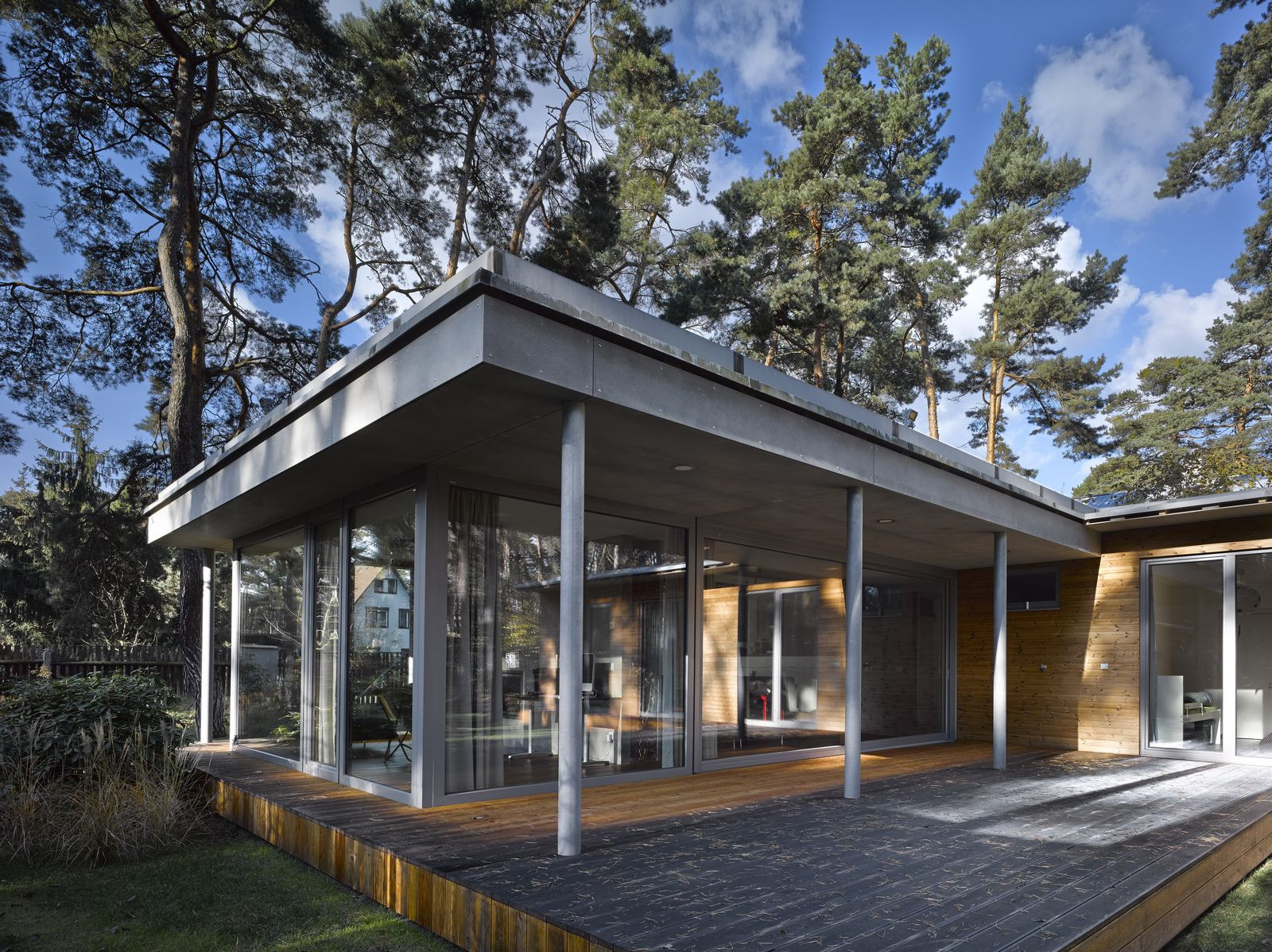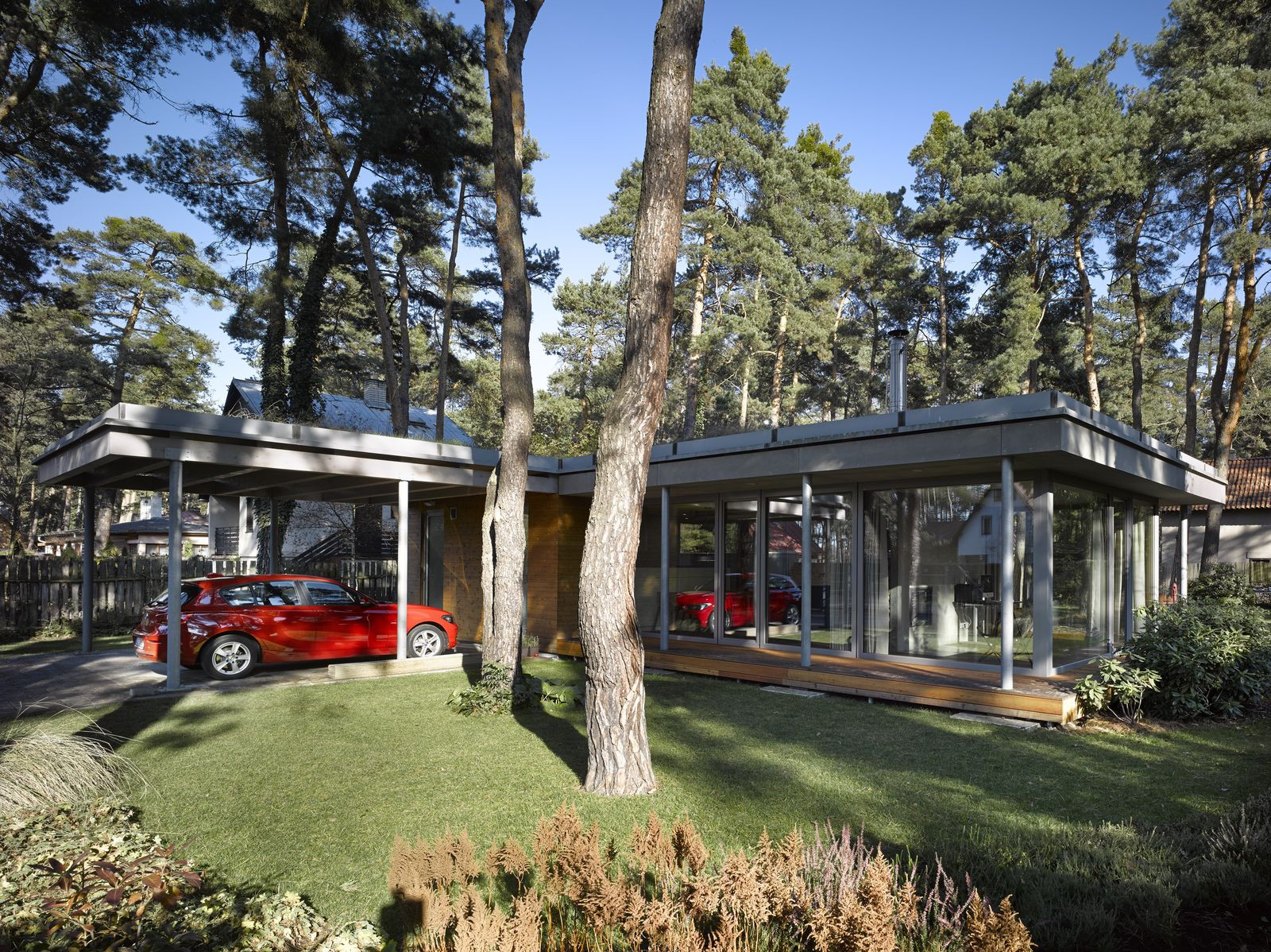 Přízemní rodinný dům prosvítající mezi kmeny stromů. Stírající se hranice mezi tím, co je uvnitř a co venku. Horizontální linie teras a střechy levitující na proskleným pokojem. Tento dům prostě dokazuje, že můžete mít obývací pokoj i uprostřed lesa a v zástavbě. Protiklady neexistují.