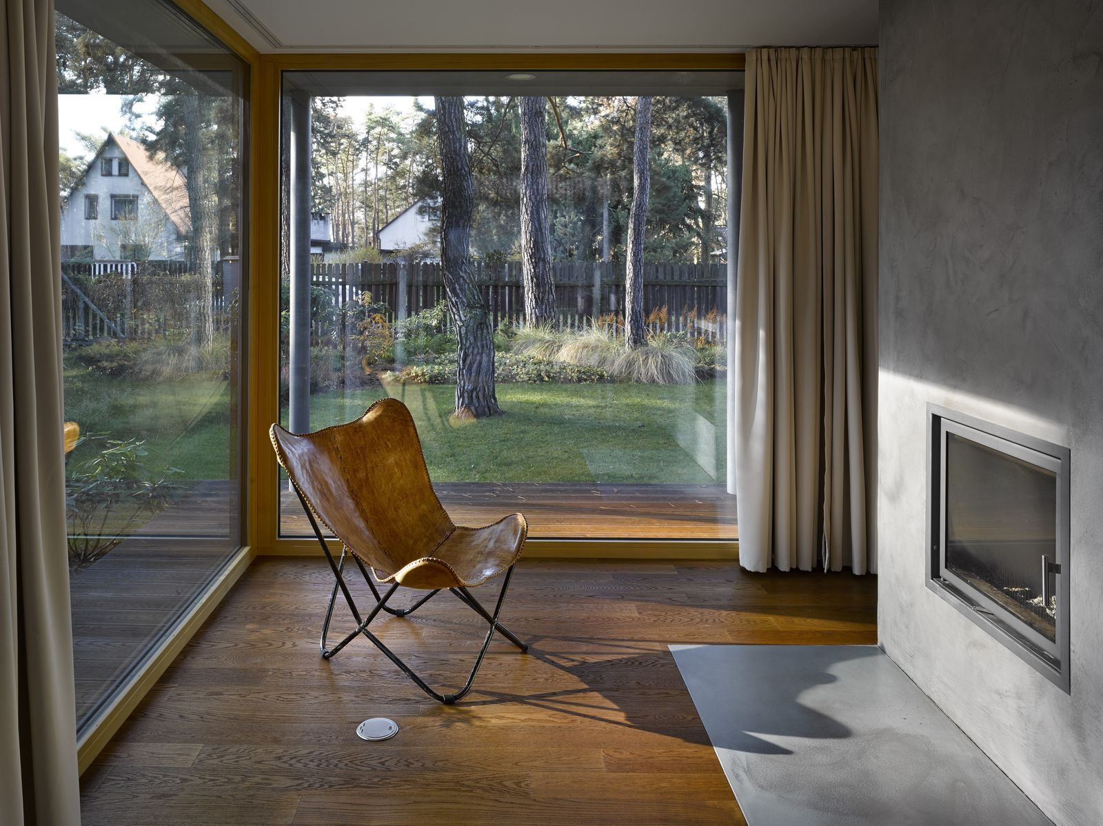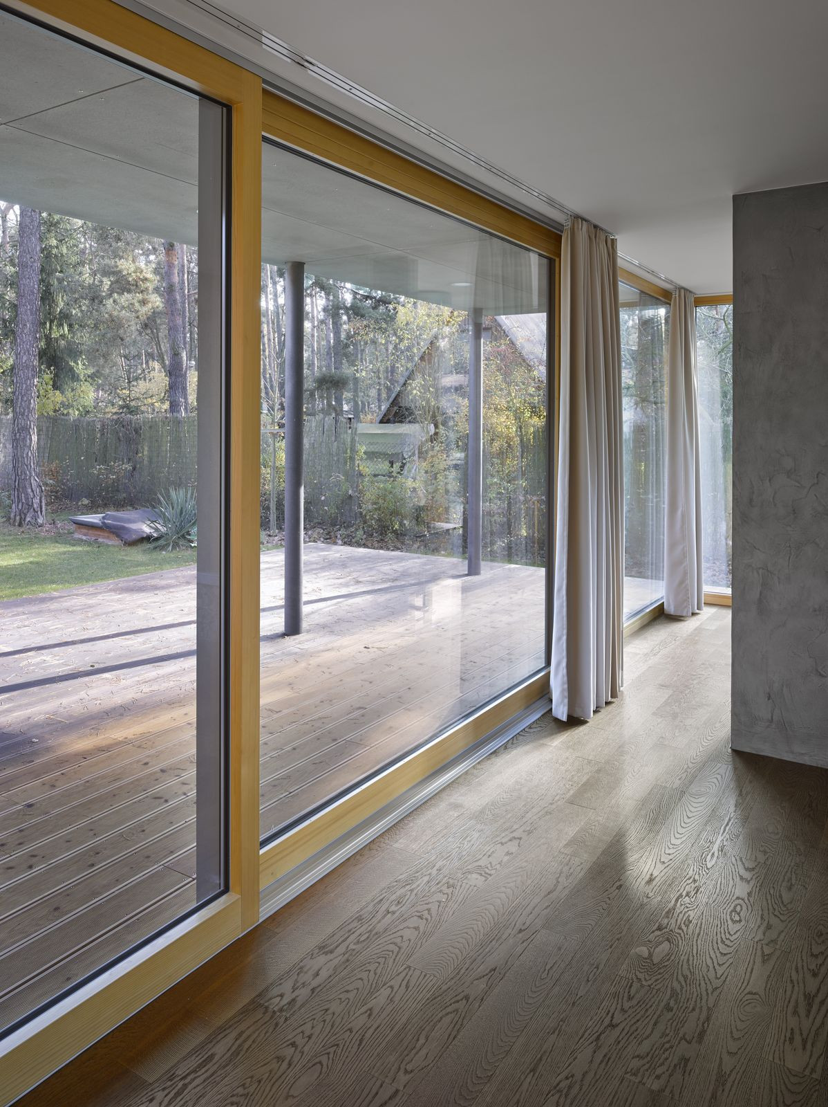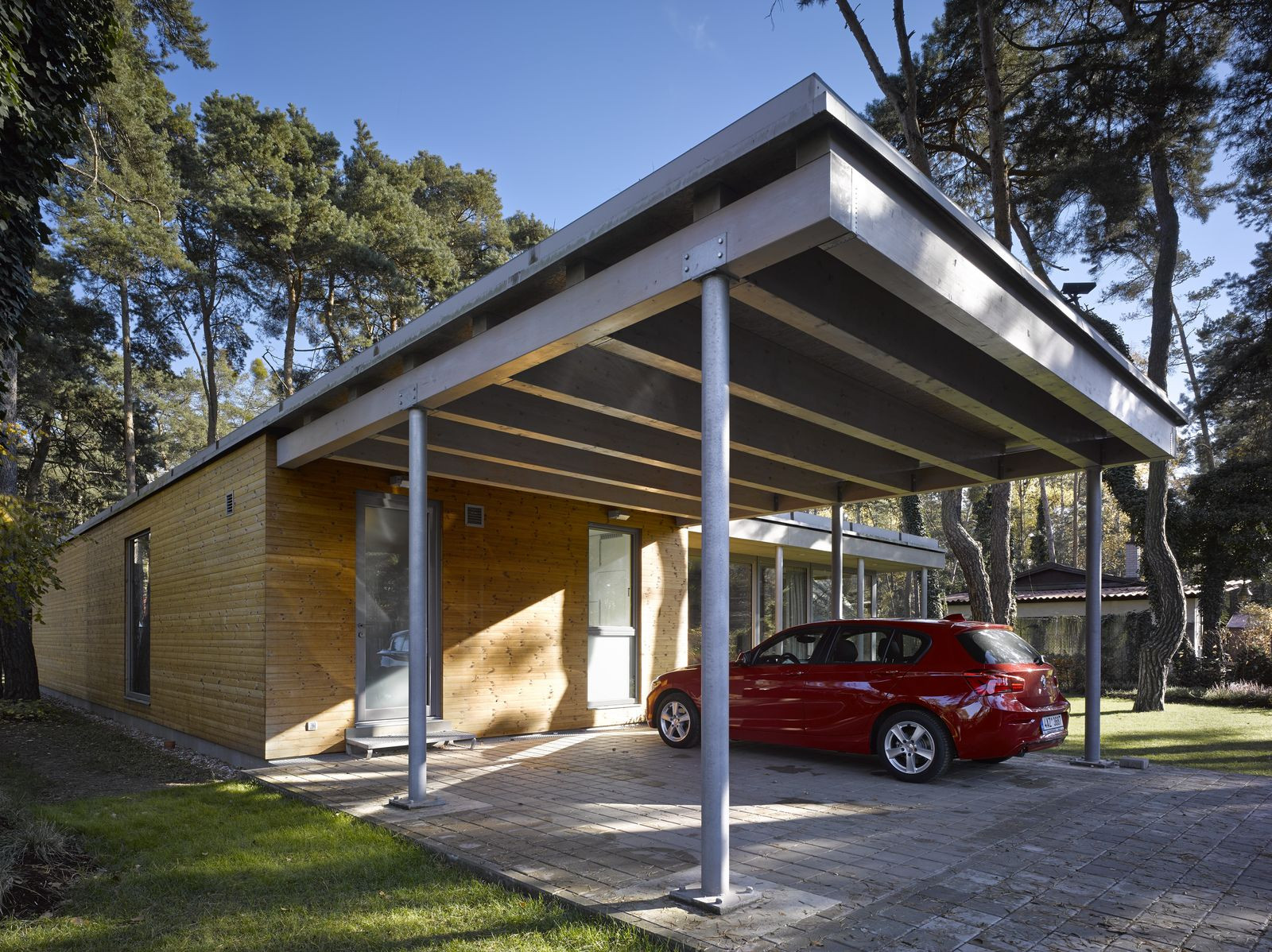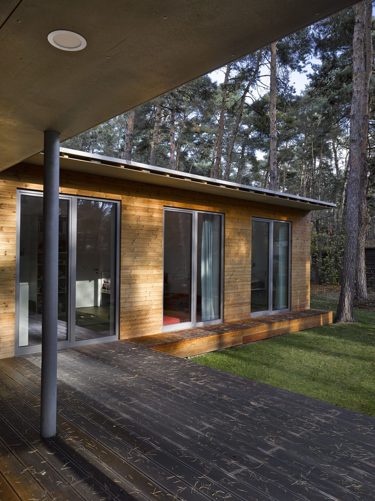 Přízemní rodinný dům prosvítající mezi kmeny stromů. Stírající se hranice mezi tím, co je uvnitř a co venku. Horizontální linie teras a střechy levitující na proskleným pokojem. Tento dům prostě dokazuje, že můžete mít obývací pokoj i uprostřed lesa a v zástavbě. Protiklady neexistují.