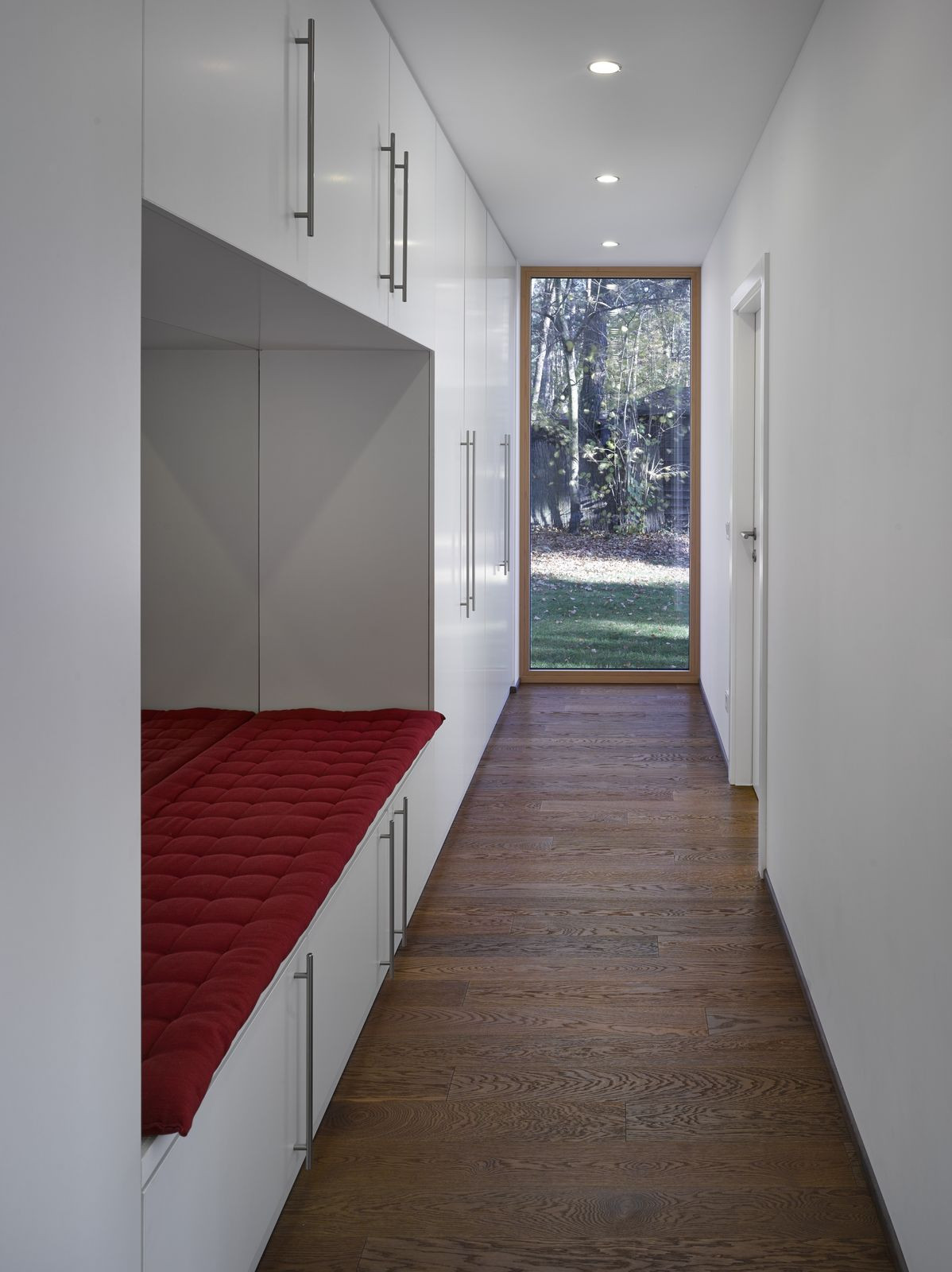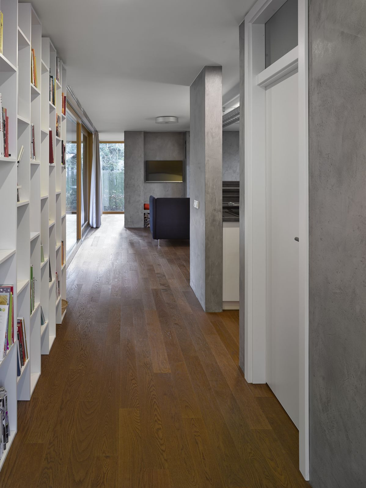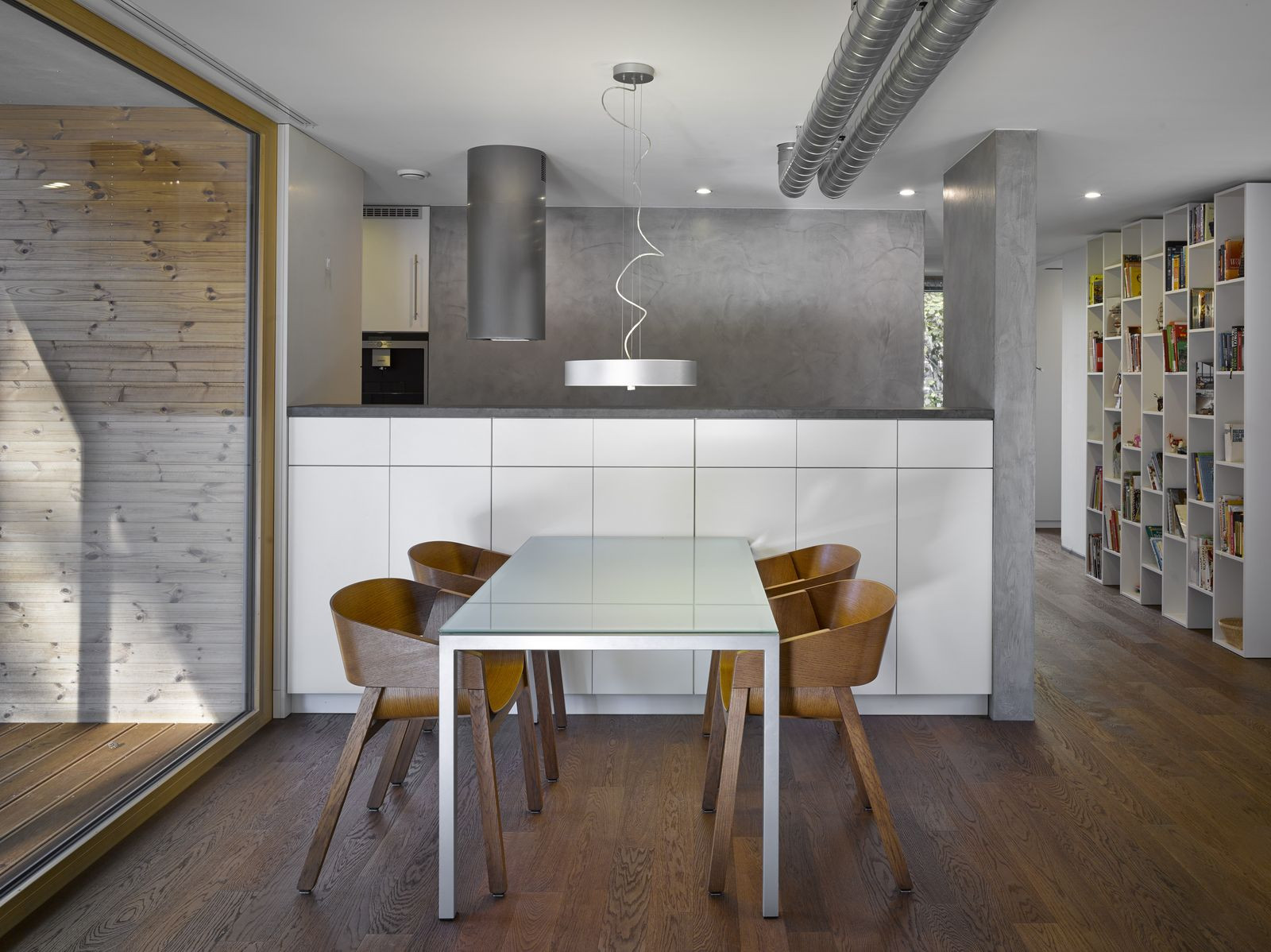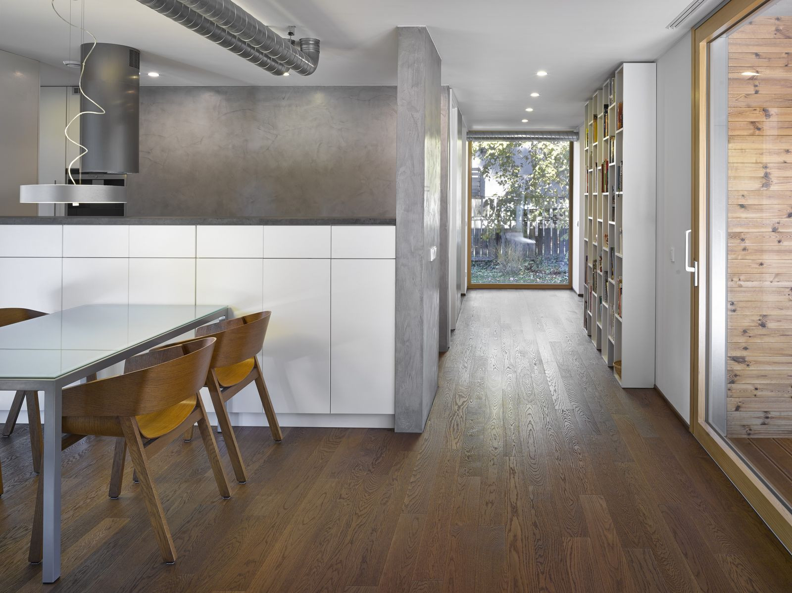 Přízemní rodinný dům prosvítající mezi kmeny stromů. Stírající se hranice mezi tím, co je uvnitř a co venku. Horizontální linie teras a střechy levitující na proskleným pokojem. Tento dům prostě dokazuje, že můžete mít obývací pokoj i uprostřed lesa a v zástavbě. Protiklady neexistují.