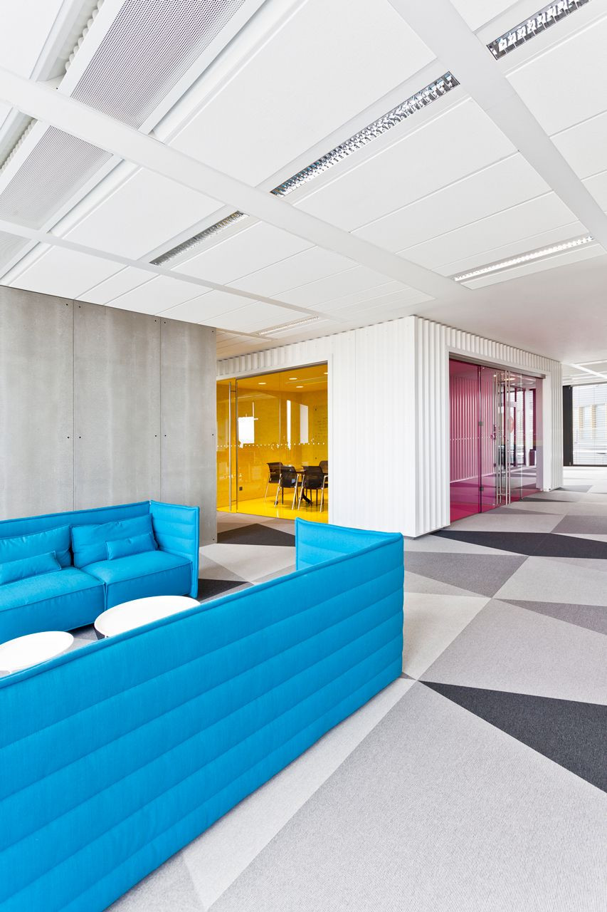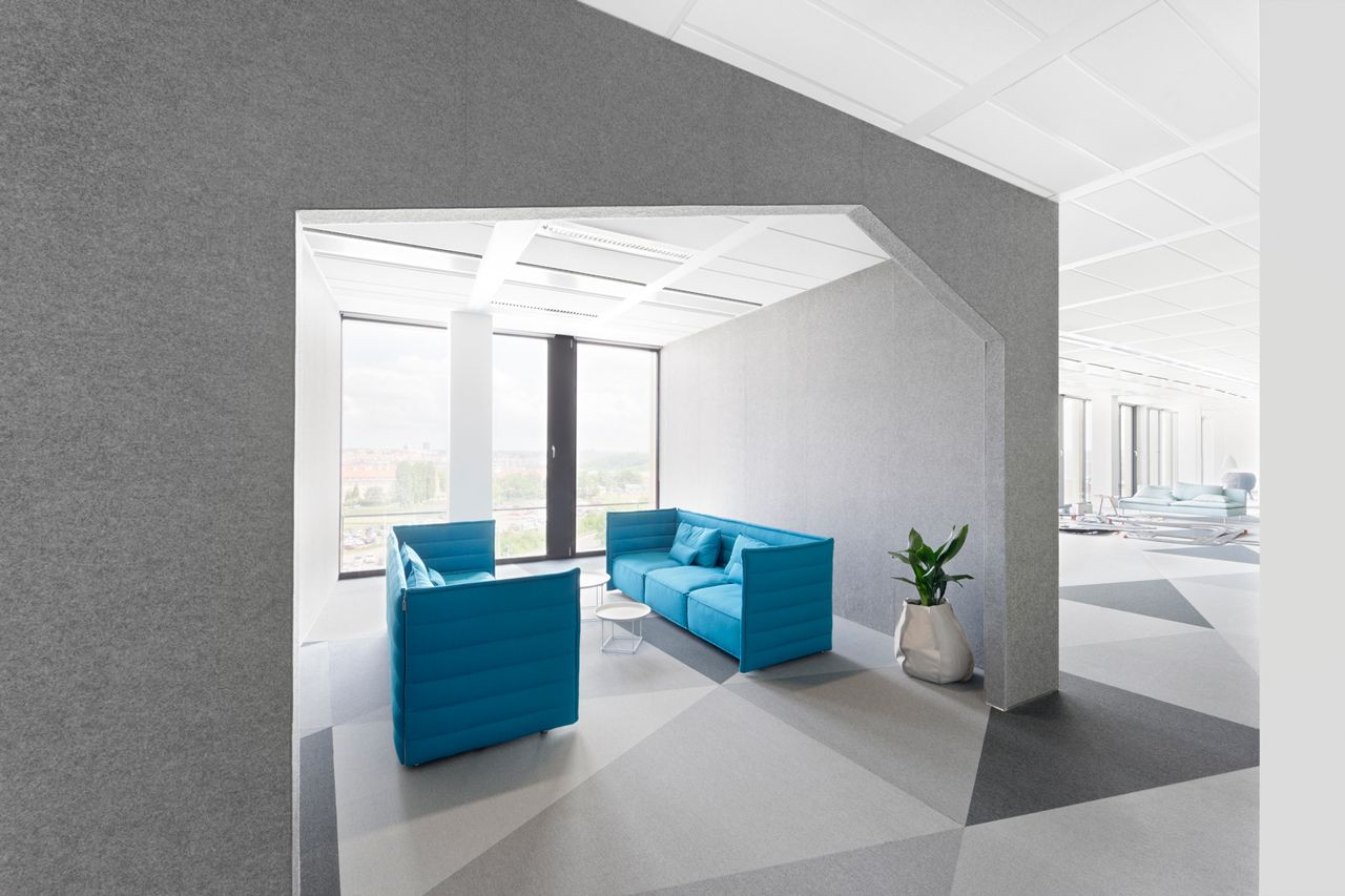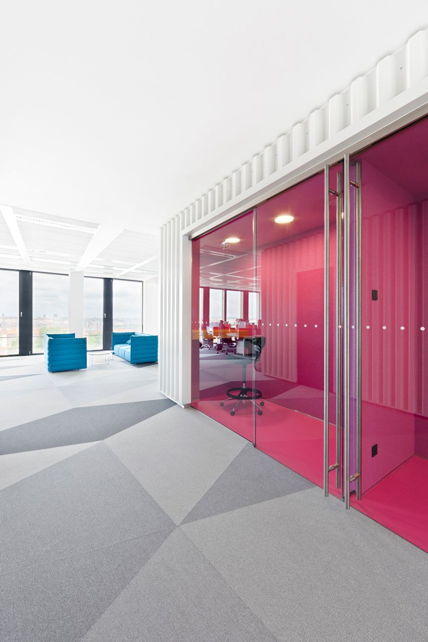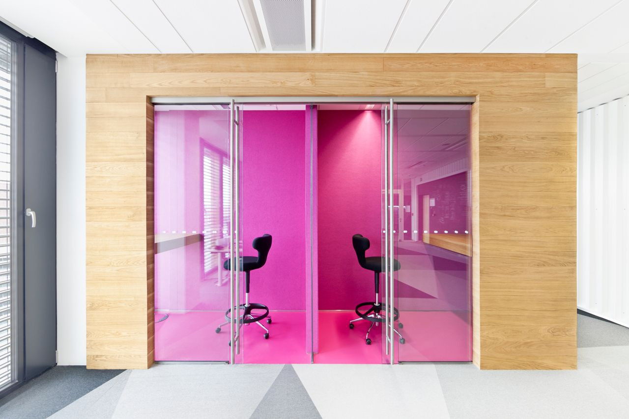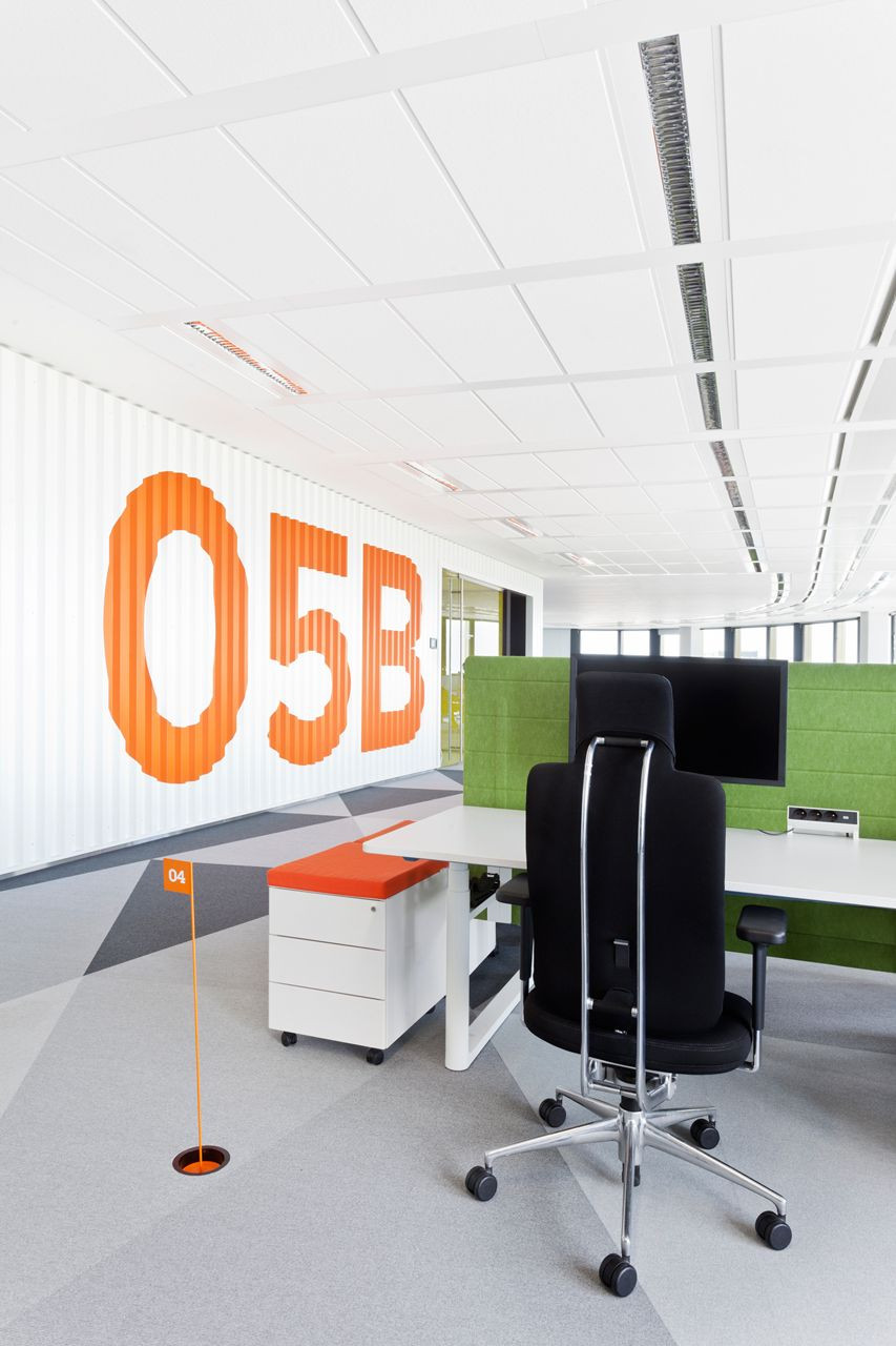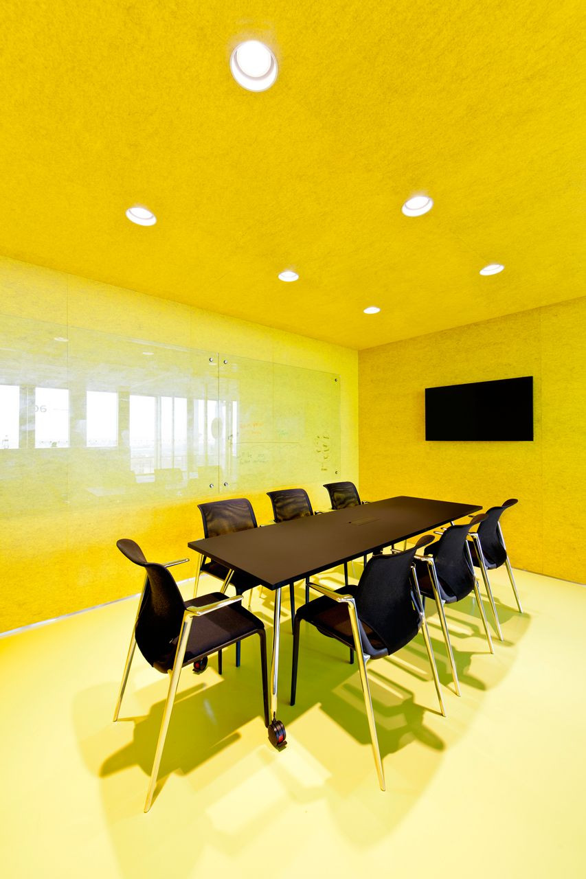 Toto jádro architekti zvolili jako dominantní prvek skrz všechna patra a následně jej opláštili bílým trapézovým plechem, který podporuje lehce industriální charakter prostor. V této bílé plechové hmotě jsou následně ‚vykousnuty‘ různě barevné prostory pro zmiňované funkce, přičemž každá místnost má svoji identickou barvu (zasedačka žlutou, telefonní budky růžovou, pracovní kabiny modrou, koutky s tiskárnou a kávovarem černou a ostatní zelenou), což samozřejmě slouží nejen jako barevný akcent, ale zároveň jako orientační body v prostoru. Tyto místnosti jsou navíc kompletně obloženy filcovým materiálem (ze 100% recyklátu PET), což výborně zlepšuje jejich akustické vlastnosti. „V podstatě se nám podařilo vytvořit taková malá nahrávací studia,“ upřesňuje Vladimír Žák, druhý z autorské dvojice.