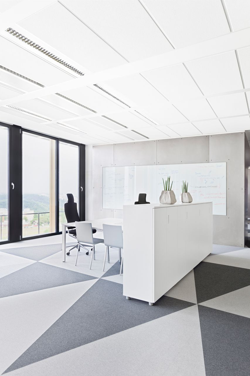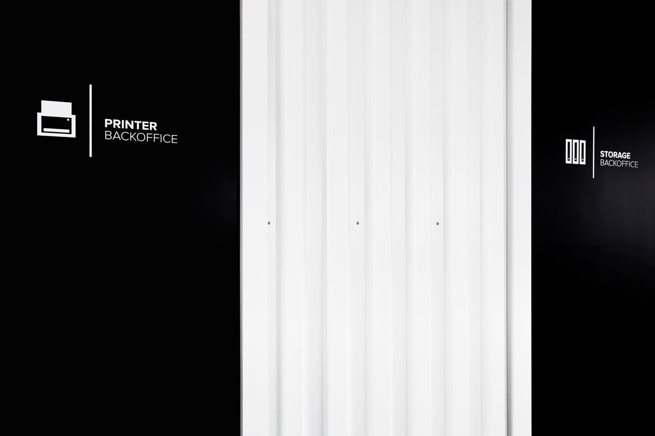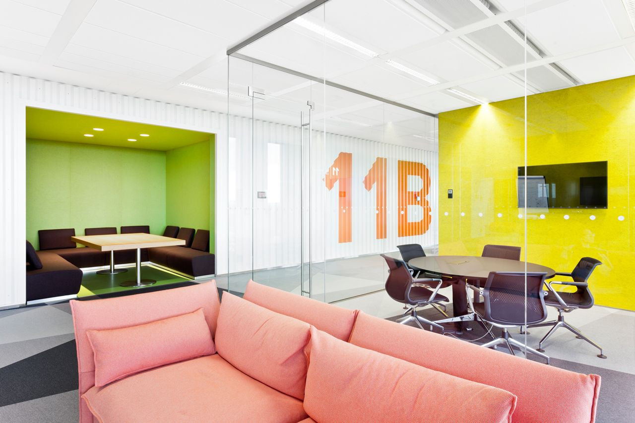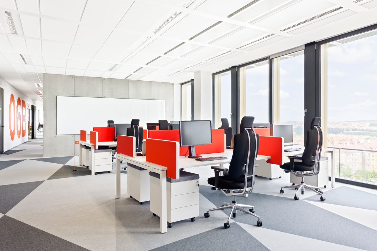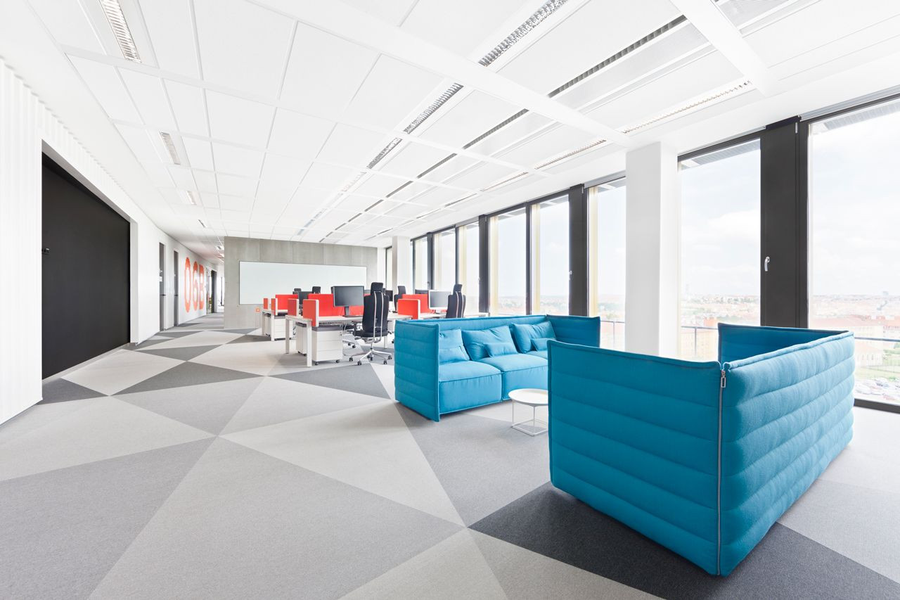 Toto jádro architekti zvolili jako dominantní prvek skrz všechna patra a následně jej opláštili bílým trapézovým plechem, který podporuje lehce industriální charakter prostor. V této bílé plechové hmotě jsou následně ‚vykousnuty‘ různě barevné prostory pro zmiňované funkce, přičemž každá místnost má svoji identickou barvu (zasedačka žlutou, telefonní budky růžovou, pracovní kabiny modrou, koutky s tiskárnou a kávovarem černou a ostatní zelenou), což samozřejmě slouží nejen jako barevný akcent, ale zároveň jako orientační body v prostoru. Tyto místnosti jsou navíc kompletně obloženy filcovým materiálem (ze 100% recyklátu PET), což výborně zlepšuje jejich akustické vlastnosti. „V podstatě se nám podařilo vytvořit taková malá nahrávací studia,“ upřesňuje Vladimír Žák, druhý z autorské dvojice.