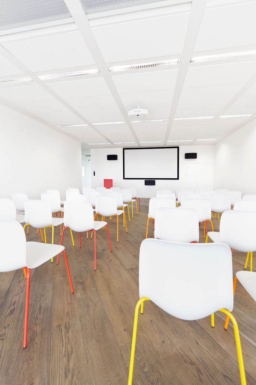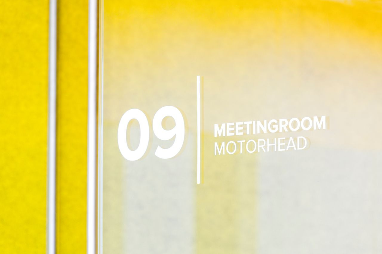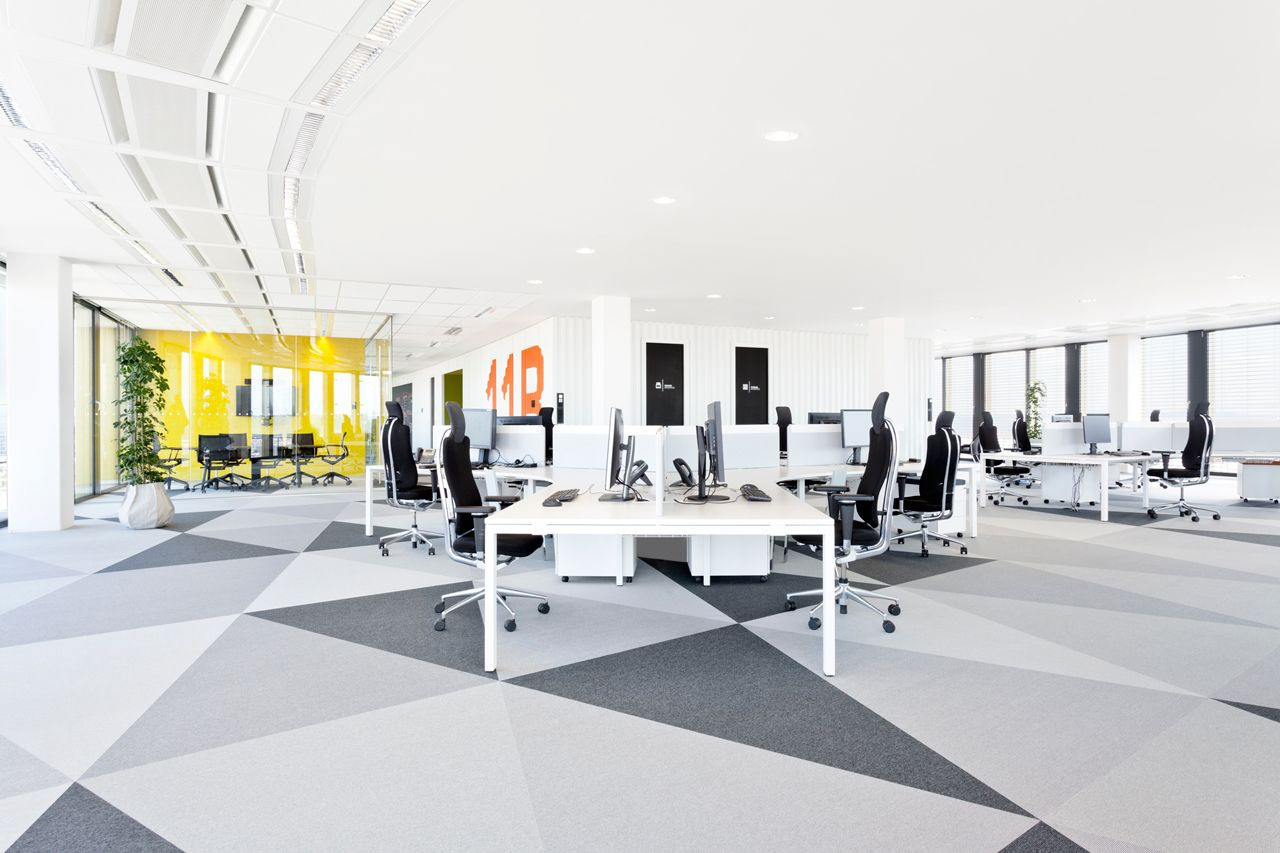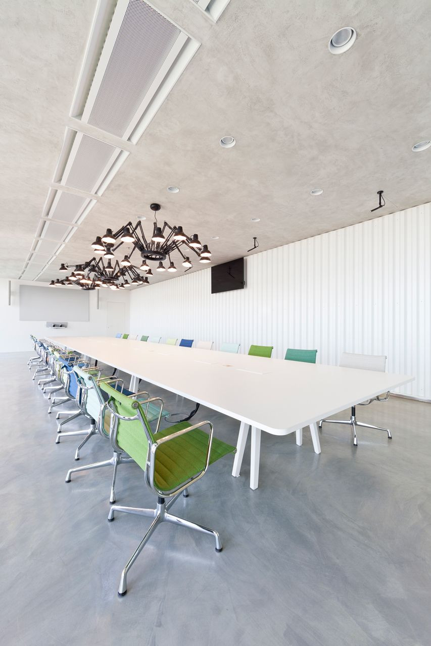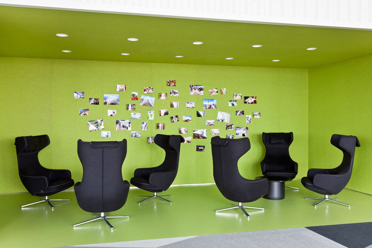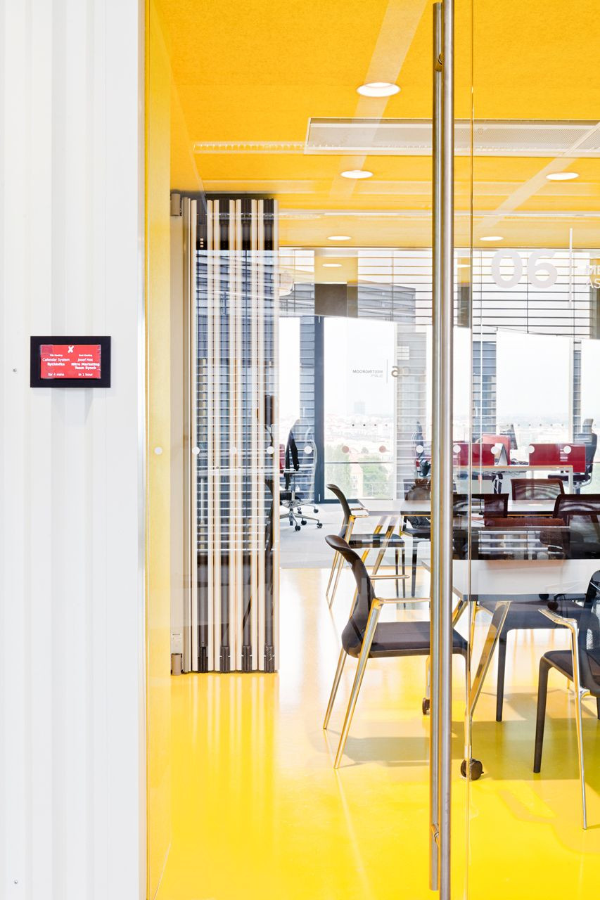 Toto jádro architekti zvolili jako dominantní prvek skrz všechna patra a následně jej opláštili bílým trapézovým plechem, který podporuje lehce industriální charakter prostor. V této bílé plechové hmotě jsou následně ‚vykousnuty‘ různě barevné prostory pro zmiňované funkce, přičemž každá místnost má svoji identickou barvu (zasedačka žlutou, telefonní budky růžovou, pracovní kabiny modrou, koutky s tiskárnou a kávovarem černou a ostatní zelenou), což samozřejmě slouží nejen jako barevný akcent, ale zároveň jako orientační body v prostoru. Tyto místnosti jsou navíc kompletně obloženy filcovým materiálem (ze 100% recyklátu PET), což výborně zlepšuje jejich akustické vlastnosti. „V podstatě se nám podařilo vytvořit taková malá nahrávací studia,“ upřesňuje Vladimír Žák, druhý z autorské dvojice.