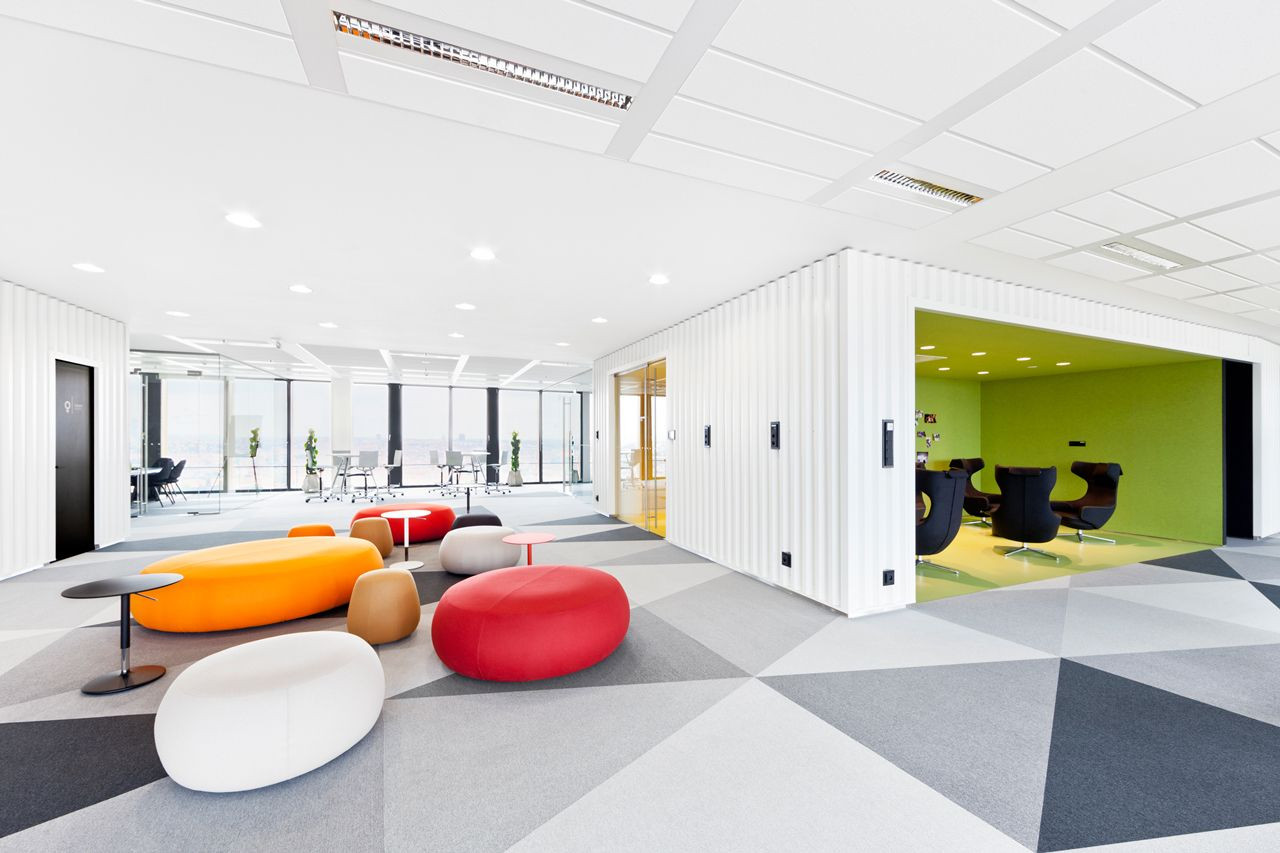 Ne zcela tradičním řešením jsou schody v kancelářích. Vladimír Žák dodává: „Chtěli jsme zachovat přirozenou fluktuaci zaměstnanců a neomezovat pohyb lidí pouze na výtah. Pohyb je zdravý a k lidskému tělu patří, navíc když jedete pouze o patro výš výtahem a čekáte na něj několik minut, tak vás to nijak nepovzbudí. Oproti tomu vyběhnout si pár schodů ano. Kromě toho se ze schodiště stala jakási ‚mícha‘ kanceláří, proudí zde velké množství lidí a výtahy jsou používány minimálně. Toto schodiště jsme záměrně rozšířili tak, aby se zde zaměstnanci mohli shlukovat a využívat jej na neformální setkávání a prostě jen tak posedávat. Kolem schodiště jsme také navrhli kuchyňky s jídelními stoly a odpočinková místa v podobě pohodlných sedaček a křesel. V pomyslném středu prostoru tak vzniká velice efektivní místo pro relax. Také koberec tady má jinou barevnost – oproti šedým odstínům, které používáme v kancelářích, jsme zde zvolili hnědou škálu, aby zaměstnanci neměli pocit, že když jdou relaxovat, stále sedí v kanceláři.“