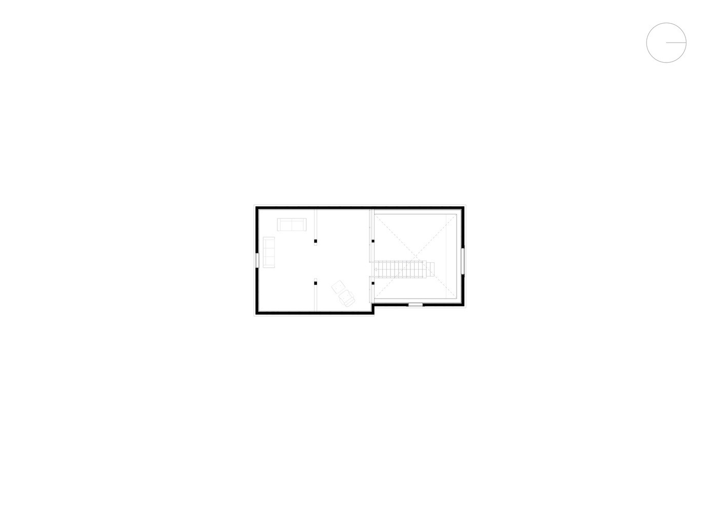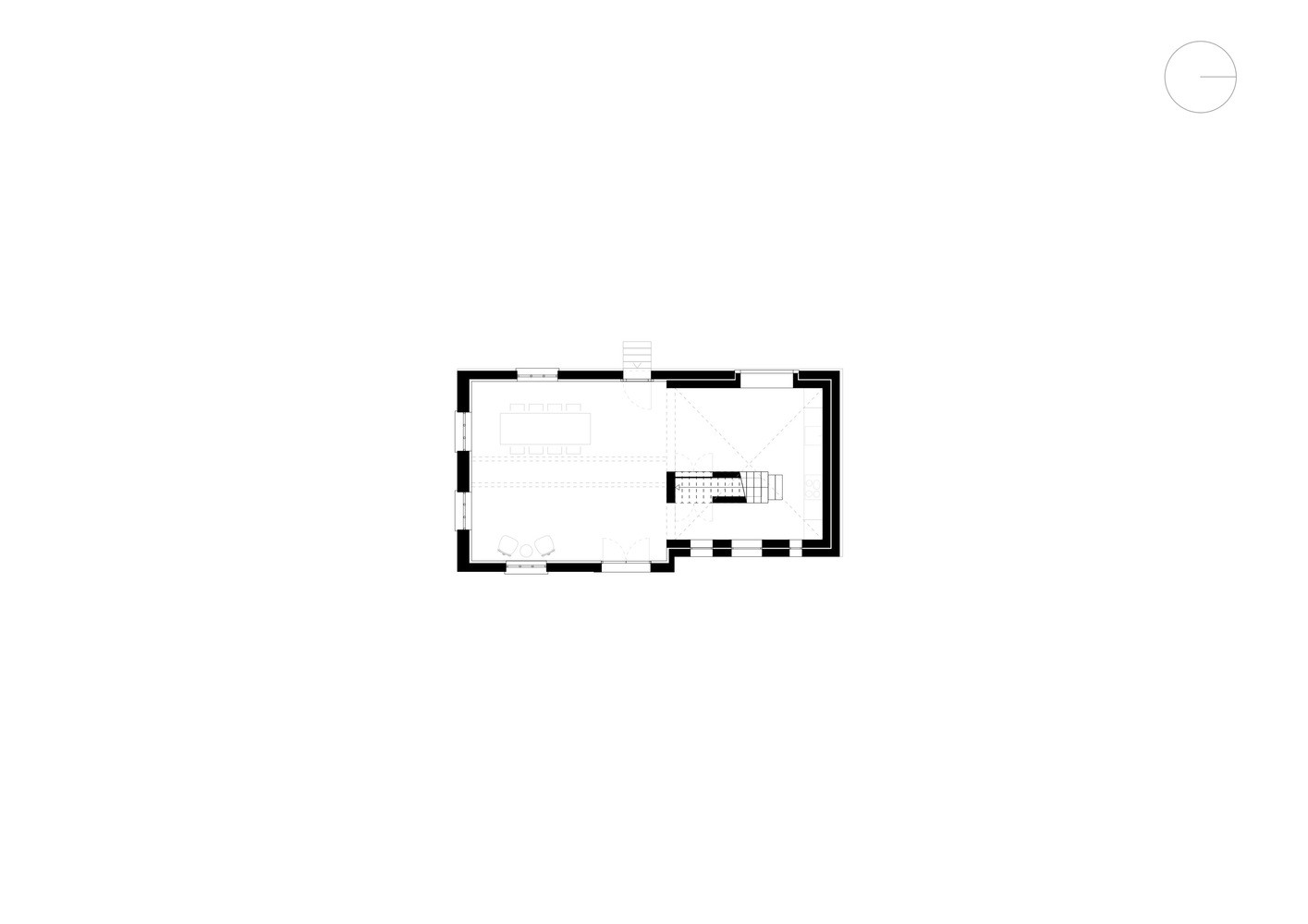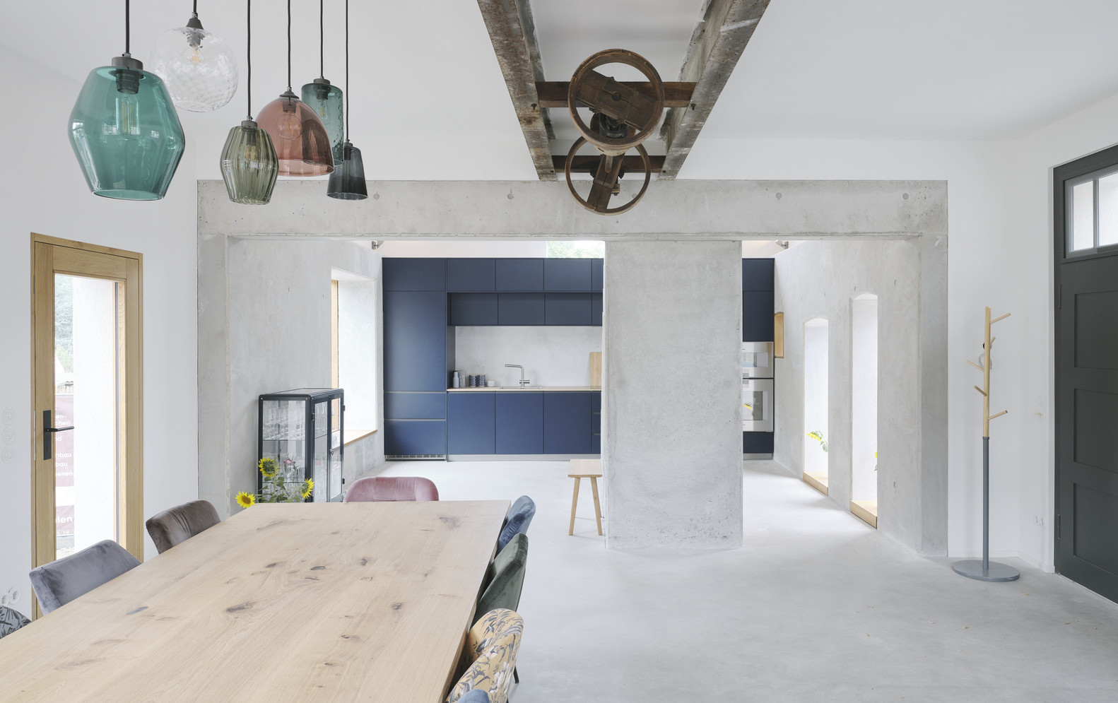 Původní dílna s vepřínem nyní slouží jako kuchyň s jídelnou. Díky odstranění příček působí prostor vzdušně a otevřeně. Prostor pod schodištěm představuje technické zázemí domu. Některá okna prošla repasí. Zbylá mají pevné zasklení s vnějším rámem. Odstraněním staré omítky došlo k odhalení celé konstrukce domu. Nová fasáda je zhotovena historickým způsobem z hliněné mazaniny ve světle šedé barvě, která plynule navazuje na barvu pohledového betonu v interiéru.
