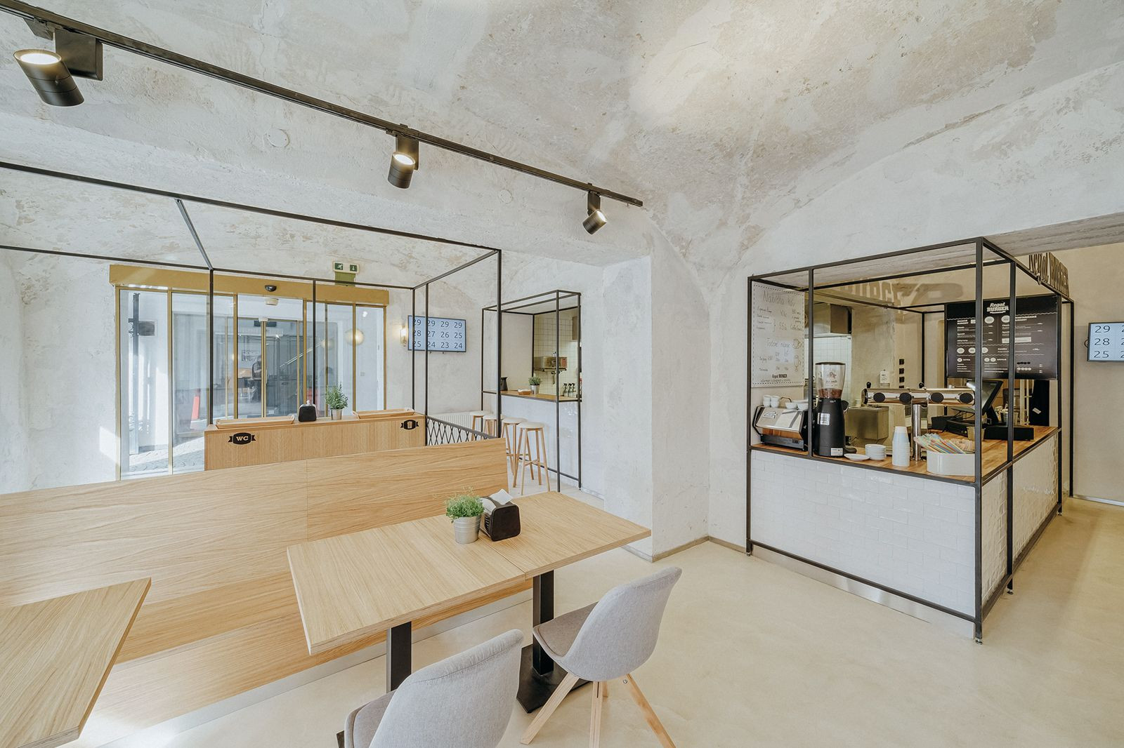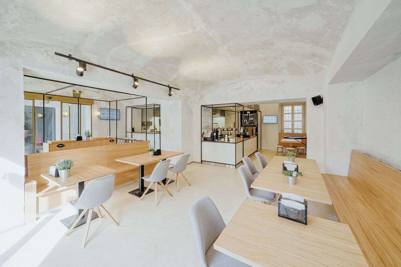 Restaurace vznikla rekonstrukcí staršího klenutého interiéru. Prostor určený hostům, kombinující místa k sezení i k stání u barových pultů, se nachází v prosvětlené, prostorné části podniku, funkční jednotky kuchyně a výdejního pultu jsou naopak vetknuté do prostoru mezi klenbami. Interiér je osvětlen velkými vitrínami a bočními automatickými posuvnými dveřmi, takže působí vzdušným, světlým a prostorným dojmem.