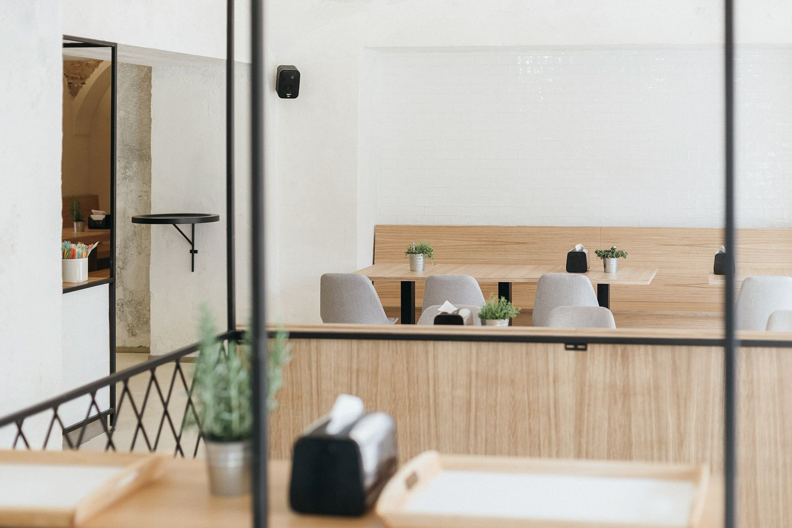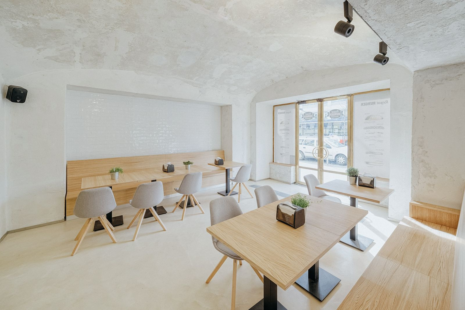 Podnik si jinak ve všech ohledech zachovává stylovou čistotu. Odstraněné nové vrstvy omítky spolu s cementovou stěrkou vytvářejí protiklad k boxům, přírodní dřevěný nábytek s měkkým polstrováním dodává prostoru jemnost. Prostor neodvádí pozornost od smyslu návštěvy – dobře se najíst.