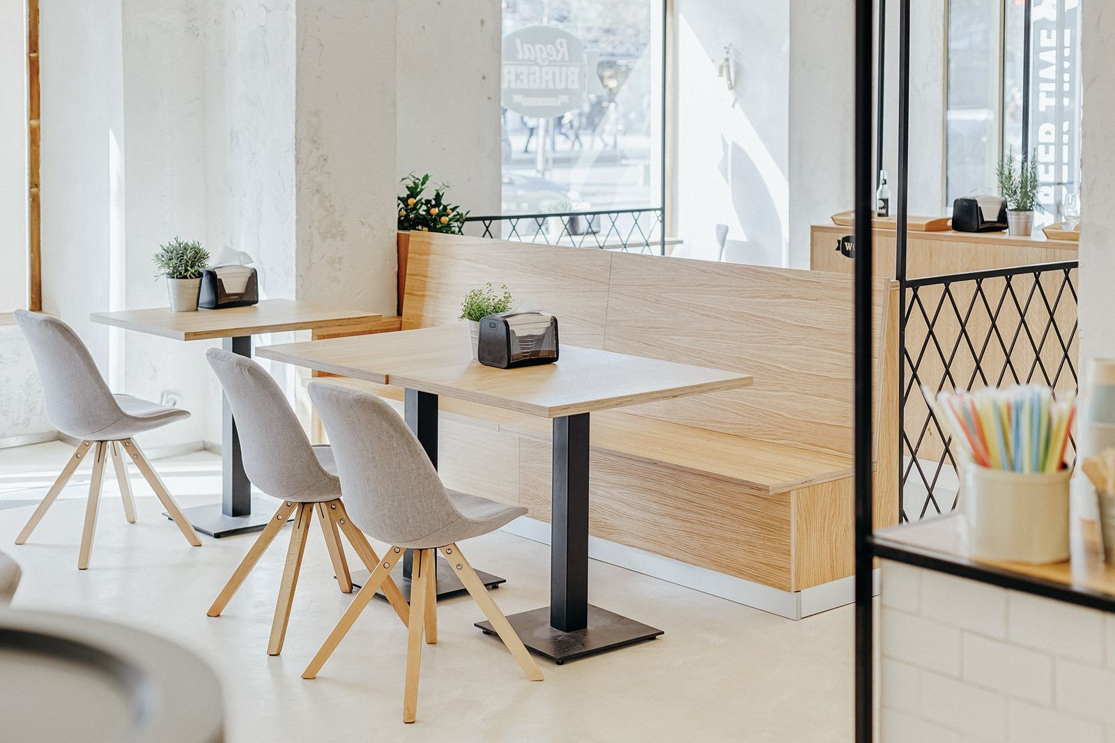 Ten je dále umocněn i tím, že nábytku je zde jen nezbytné množství pro zajištění chodu provozovny – židle, stoly, pult pro odkládání táců. Jednotlivé stoly nebo místa k sezení oddělují boxy vymezené opěradly lavic a naznačené subtilní černou jacklovou konstrukcí, která prostor opticky rozděluje, aniž by ho blokovala. Její užití v prostorech baru a kuchyně navíc evokuje pouliční stánky, což je u podniku specializovaného na hamburgery více než příhodné.