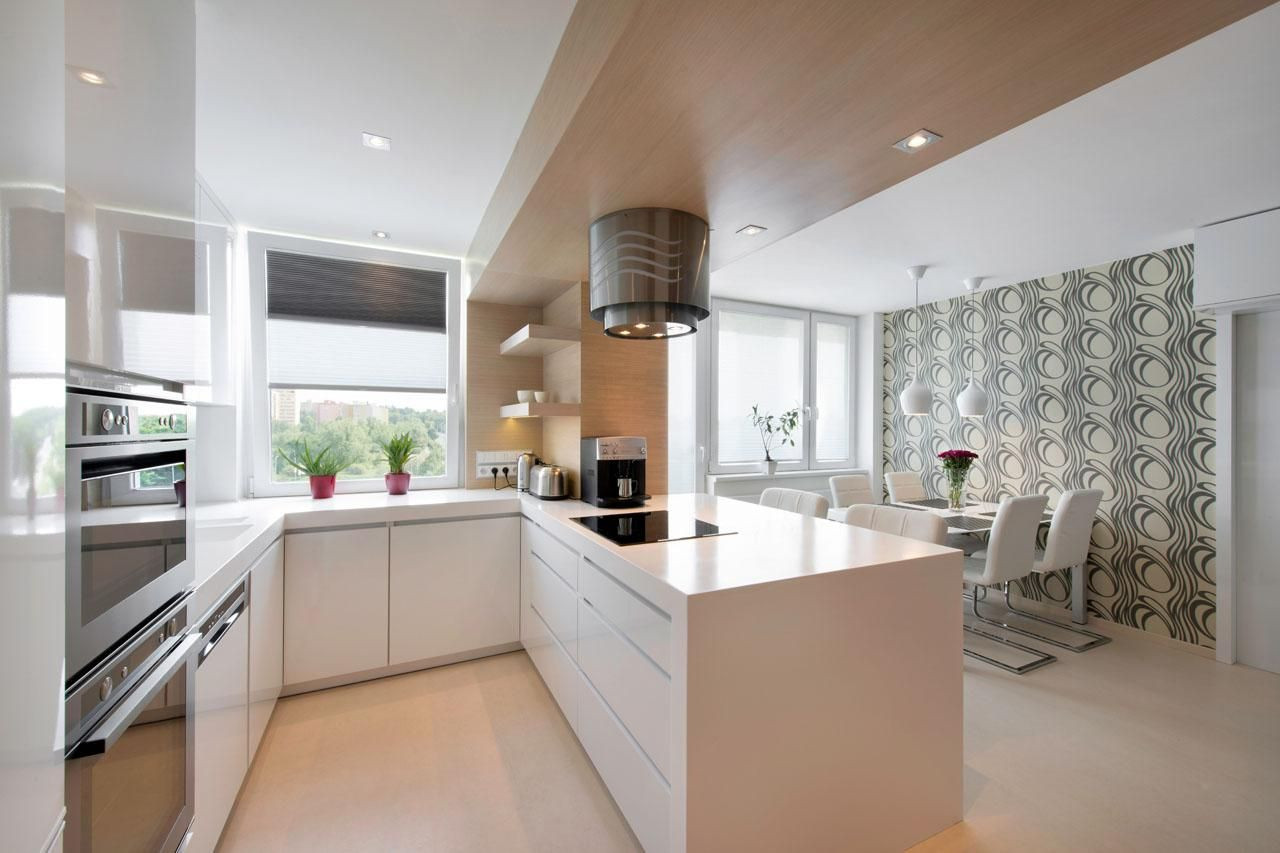 Z několika předkládaných variant si mladý pár vybral tu, kde kuchyně se stává centrem celého bytu. Nejen že byla navržena jako otevřená do obývací části s jídelním koutem, ale zároveň je i součástí chodby, což mělo za následek maximální využití každého volného místa pro úložné prostory. Nalezneme zde jak spížní skříně pro potraviny, které jsou poháněny elektromotory pro lepší ovládání, tak šatní skříně pro ukládání oblečení, kabelek a bot.