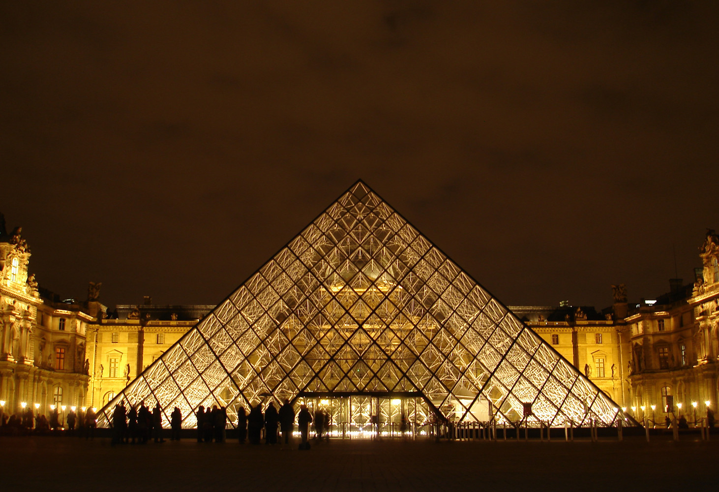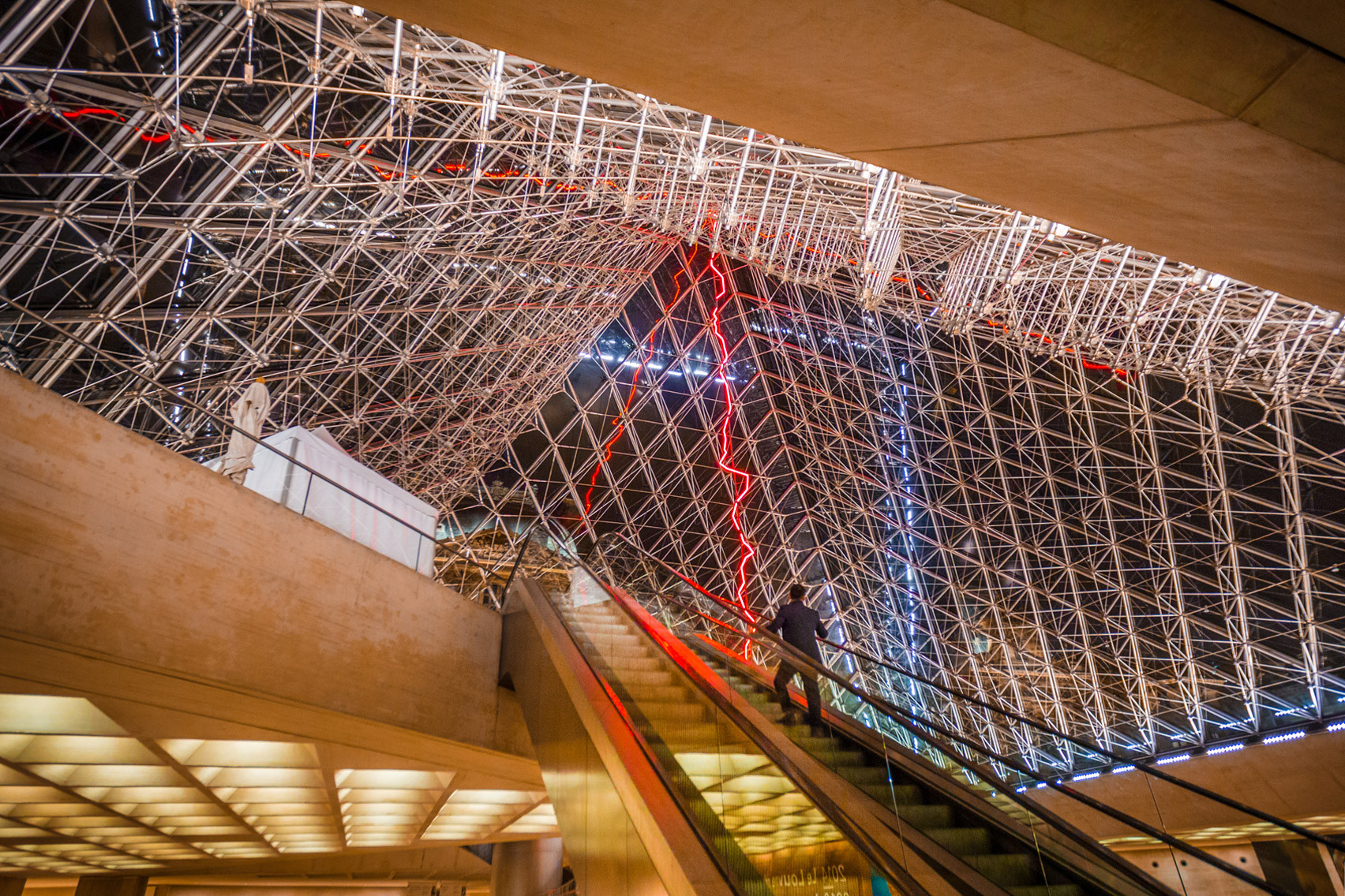 Pyramida byla dokončena roku 1989 a její slavnostní otevření proběhlo při příležitosti 200letého výročí Velké francouzské revoluce. Celý komplex Le Grande Louvre se pak otevřel o čtyři roky později, a to symbolicky u výročí 200 let od založení samotného muzea Louvre. Díky 72 tisícům metrů čtverečních expoziční plochy se instituce rázem stala třetím největším muzeem na světě. Vzhledem k extrémní návštěvnické vytíženosti přestalo být foyer svými dimenzemi adekvátním prostorem pro vstup, a tak se vedení muzea společně se státem dohodlo na třetí fázi, kterou představovalo zklidnění prostoru pod skleněnou pyramidou a úpravách pro nový vstup do Napoleonovy haly – to vše nicméně stále ve spolupráci se studiem autora původního návrhu I.M. Peie.