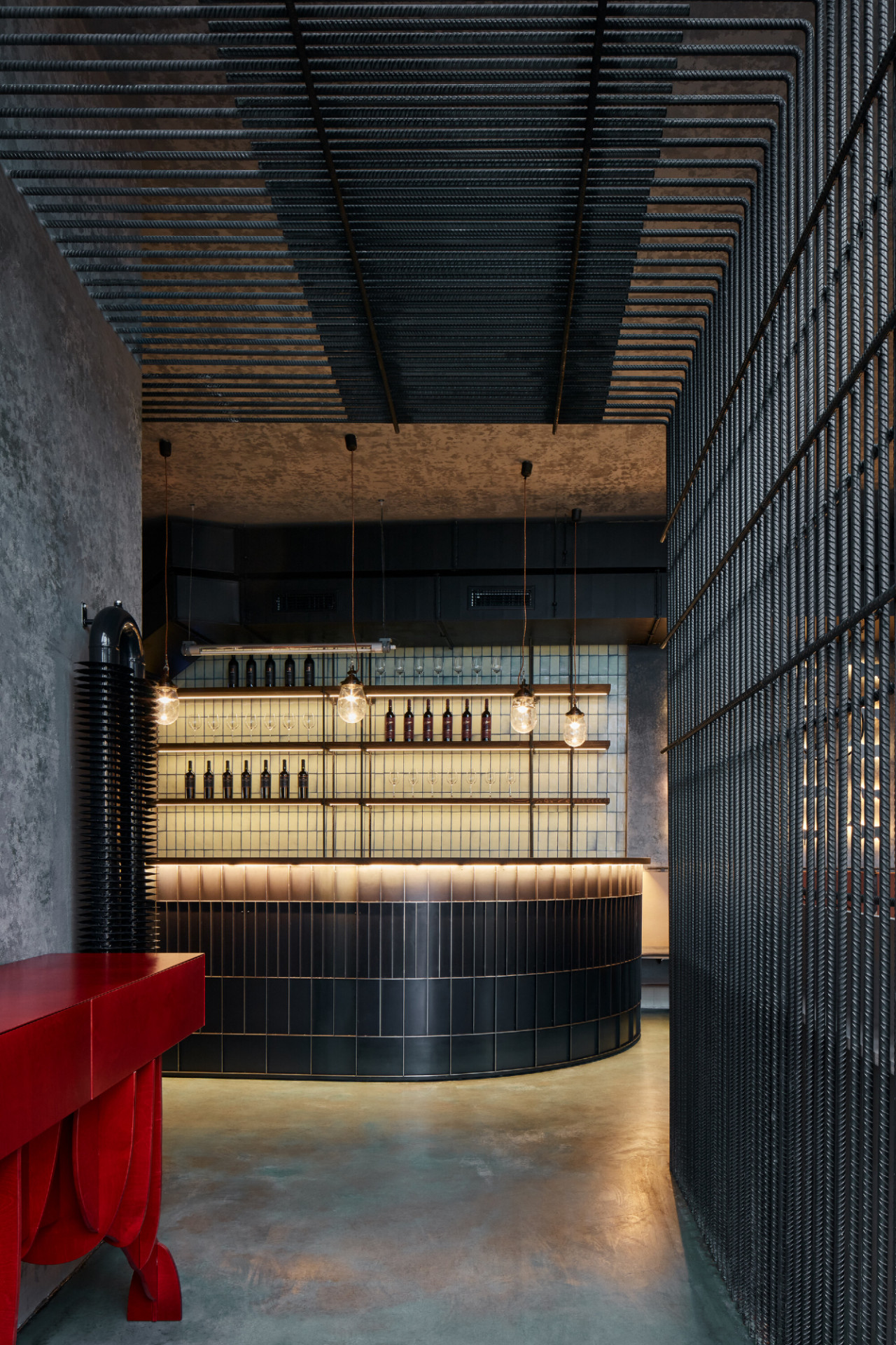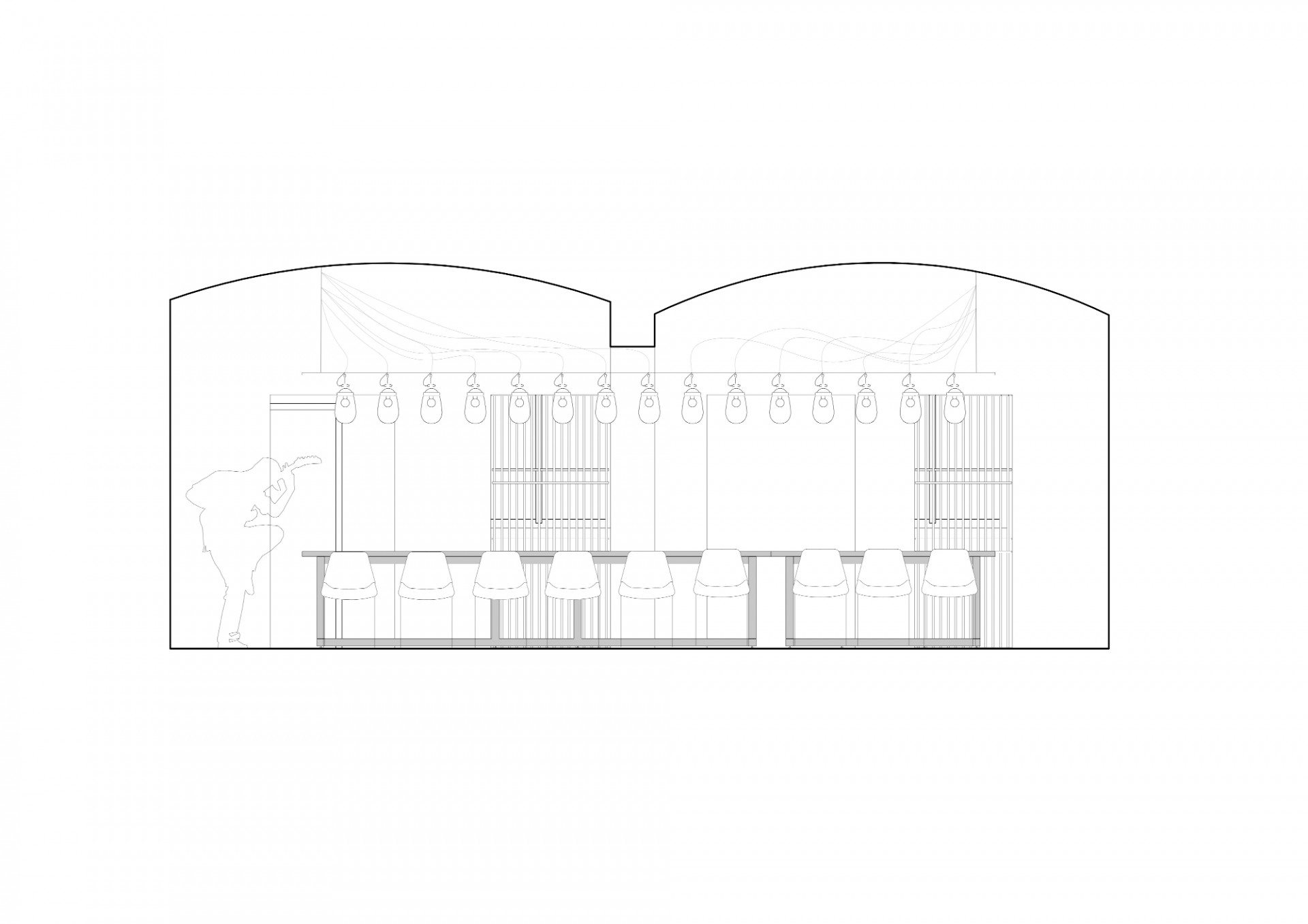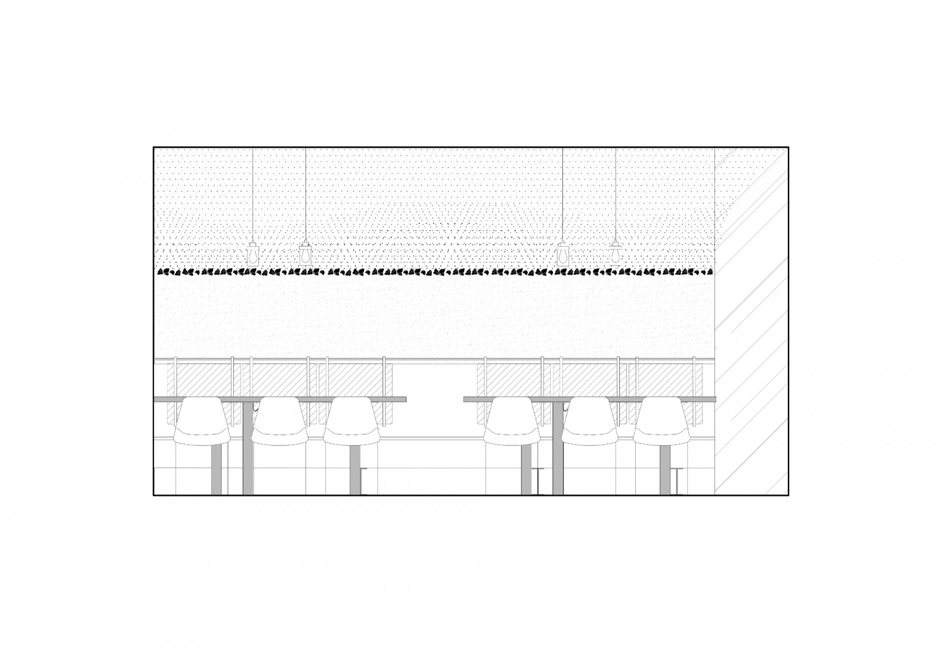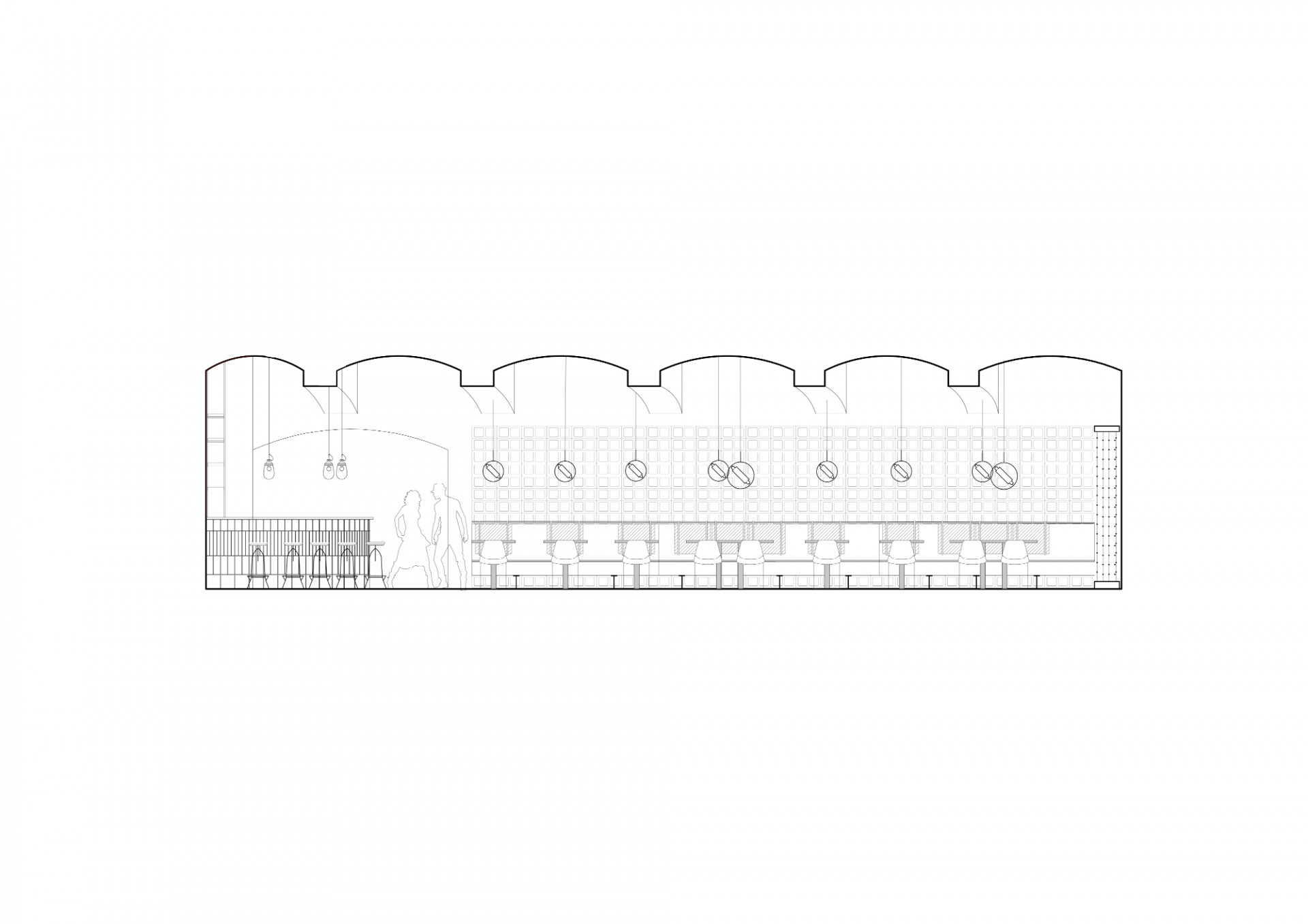 Gran Fierro, Formafatal / Dagmar Štěpánová, Iveta Tesařová, podélný řez - pohled na bar a otevřenou kuchyni