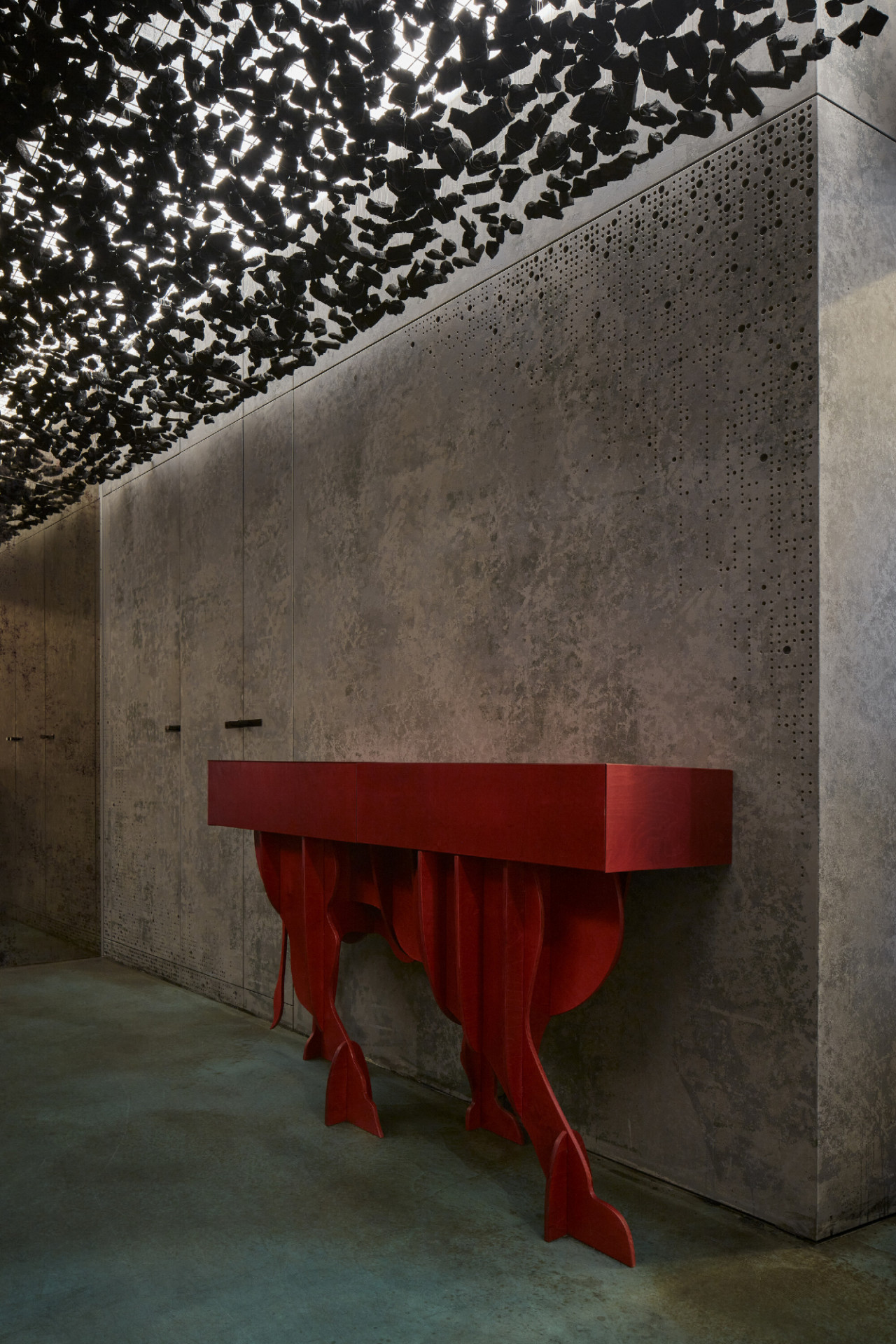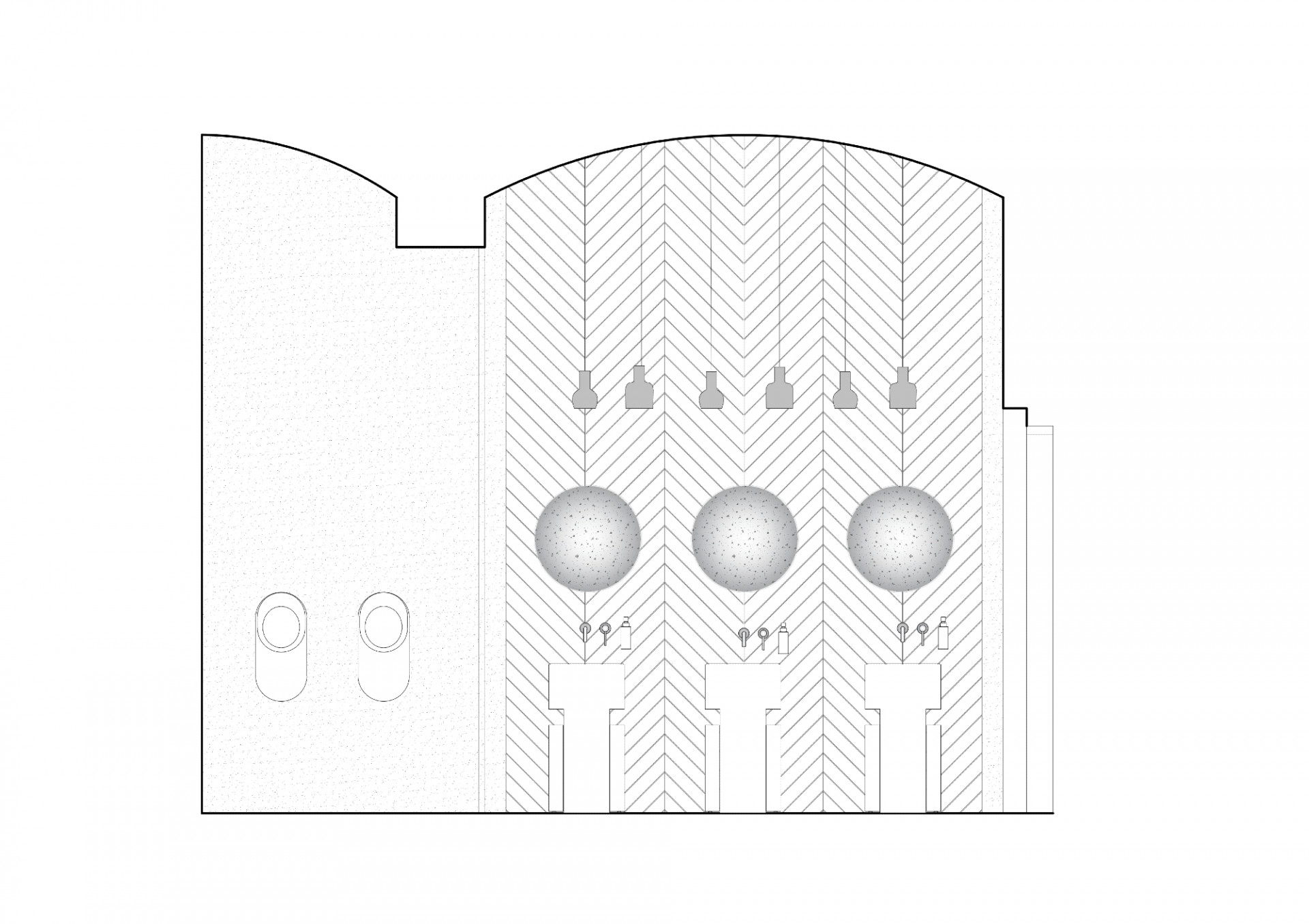 Gran Fierro, Formafatal / Dagmar Štěpánová, Iveta Tesařová, podélný řez - salonek s uhlovou klenbou a pohled na skříňovou perforovanou stěnu