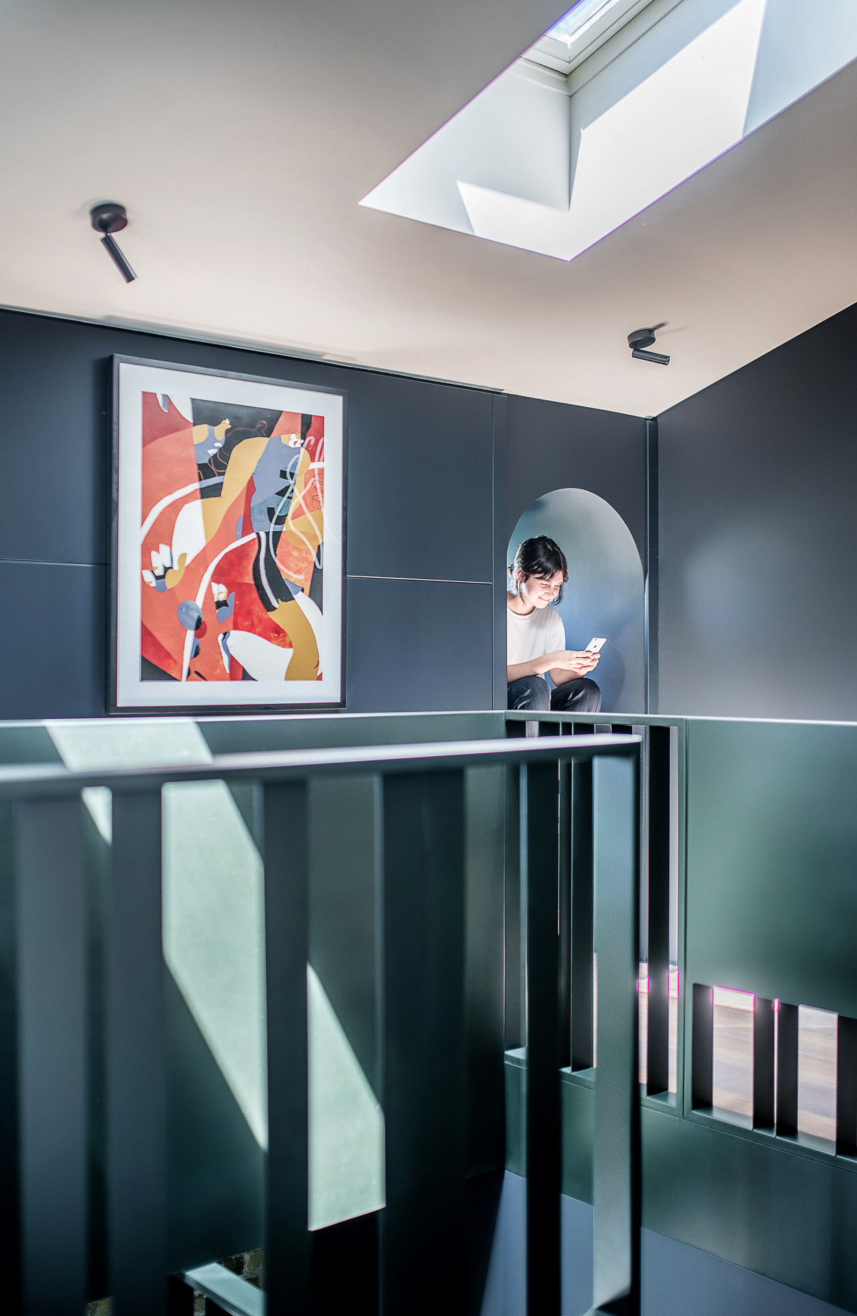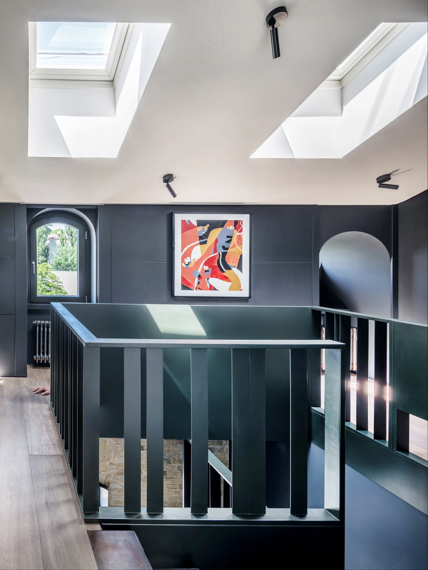 Monochromatický interiér zaujme různými strukturami a surovými materiály. Bílé jednoduché panely asi ze dvou třetin místy kryjí odhalené zdivo a celý prostor tak rozjasňují a zároveň zakrývají elektrické a jiné rozvody. Světlo se dovnitř dostává díky vysokým černým obloukovým oknům, která se inspirují původním provedením. Tloušťku stěn se architekti rozhodli využít a v úrovni schodiště vzniknul výklenek pro posezení s knihou.