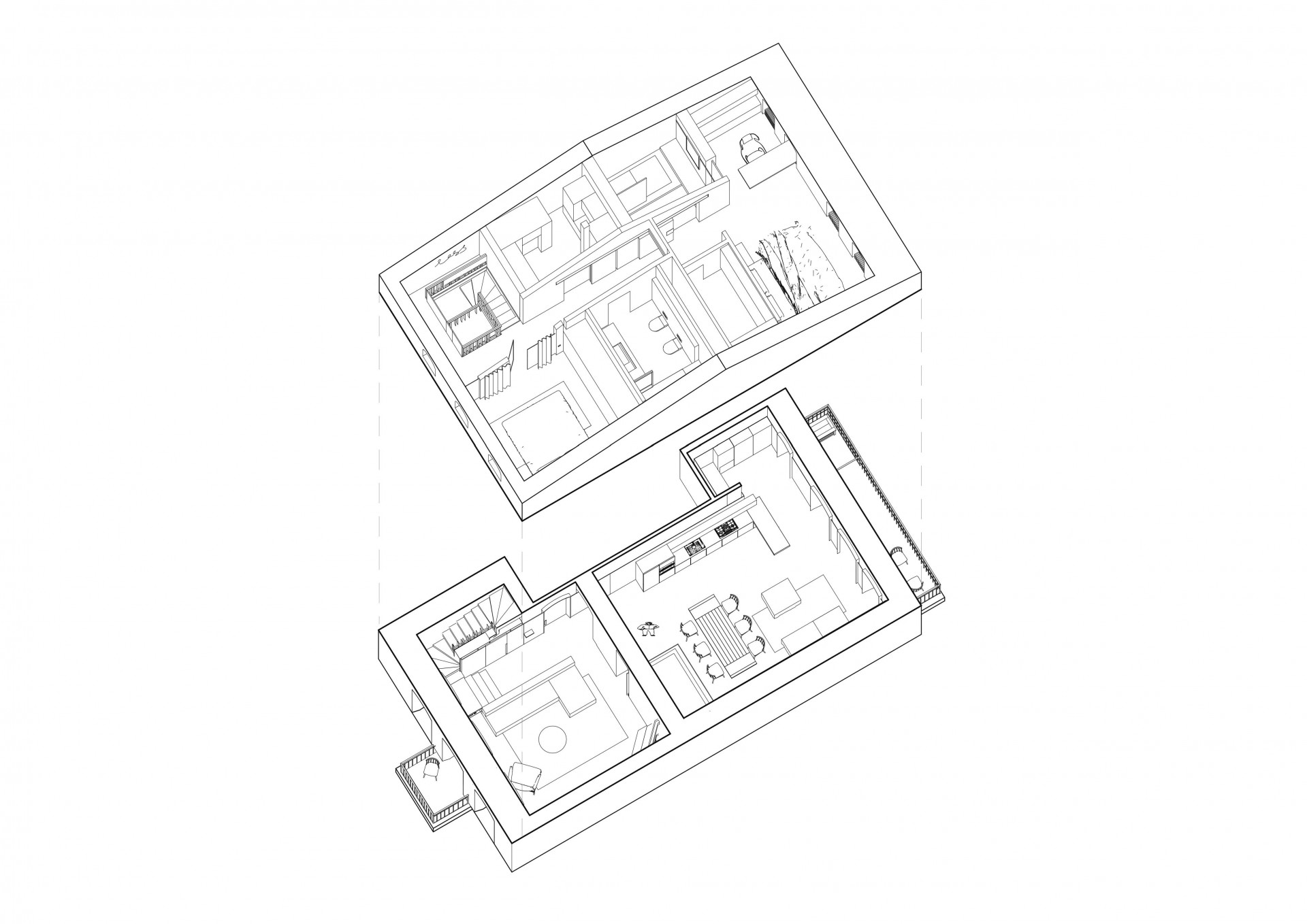 Druhé patro pod mansardovou střechou esteticky navazuje na přízemí a zahrnuje ložnici s pracovnou, pokoj pro hosty, dvě koupelny, šatnu a provozní místnost. Jednotlivé místnosti opět propojuje dřevěná podlaha, v koupelnách pak převládá kámen a beton. I přesto, že nemají přívod přirozeného světla, nepůsobí díky světlým materiálům a promyšlenému osvětlení nikterak stísněně.