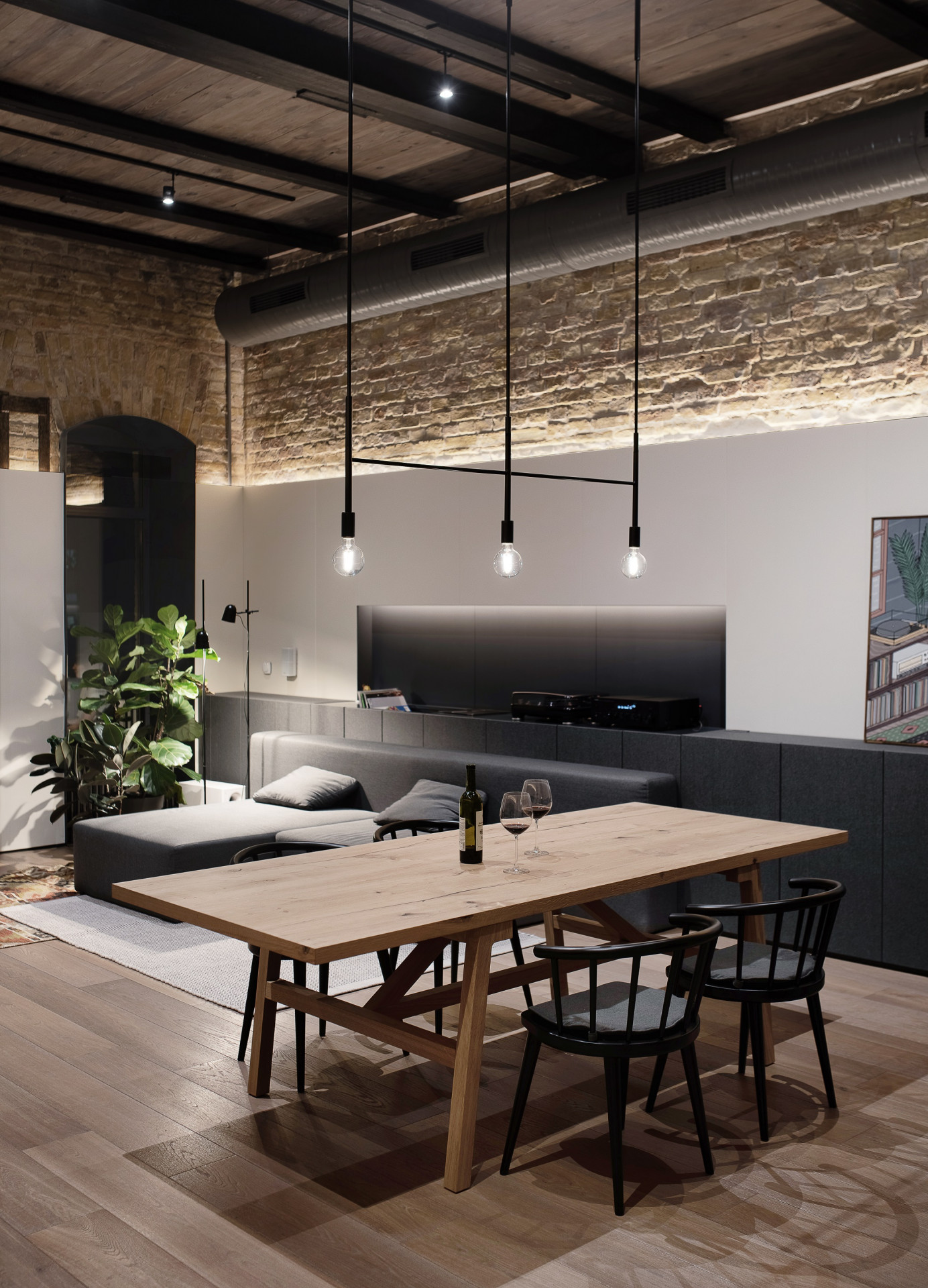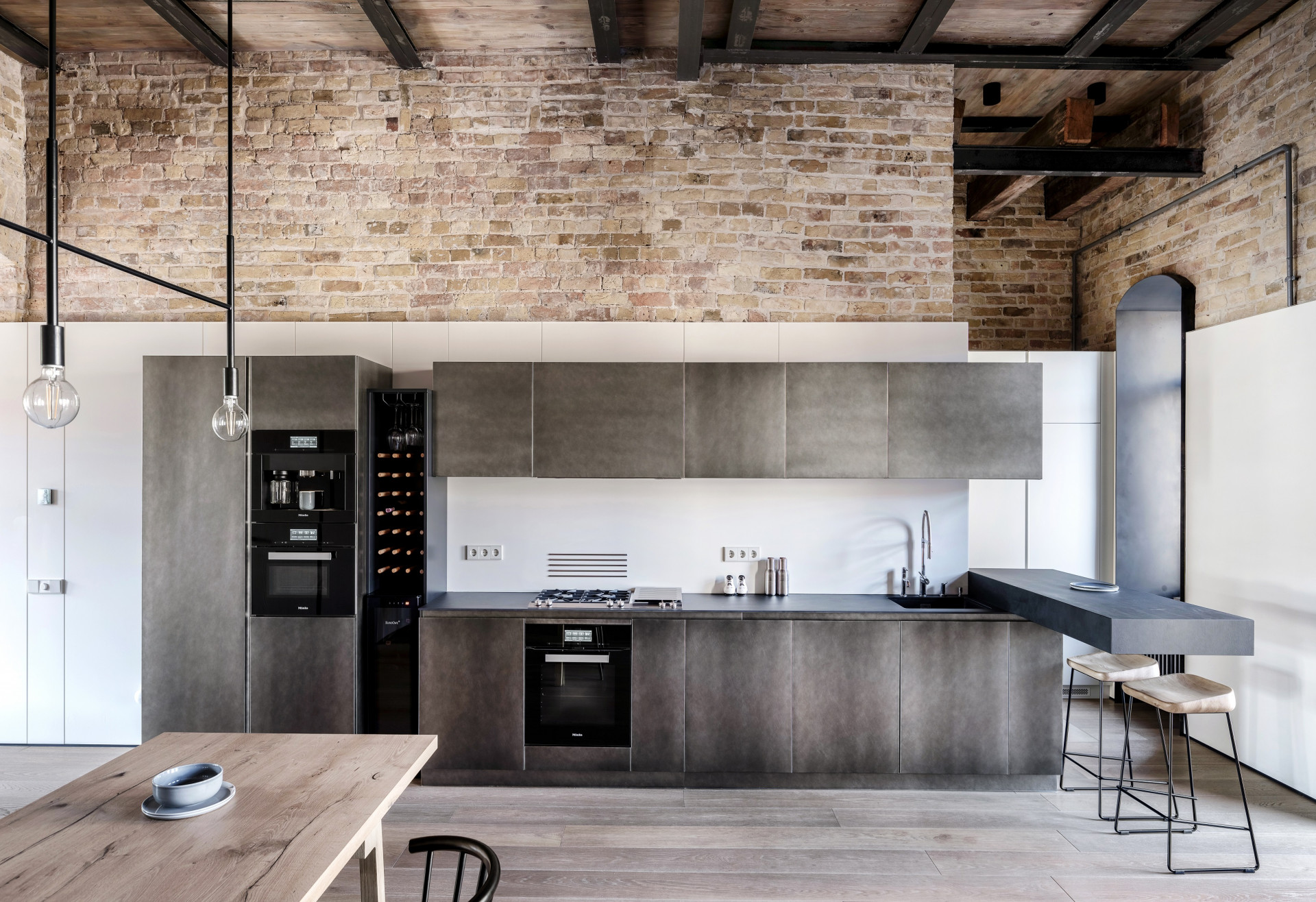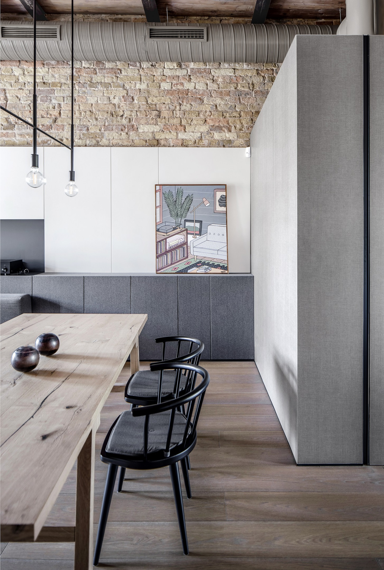 Interiér velkorysého bytu v Kyjevě sází na surové materiály a prolínání starého s novým