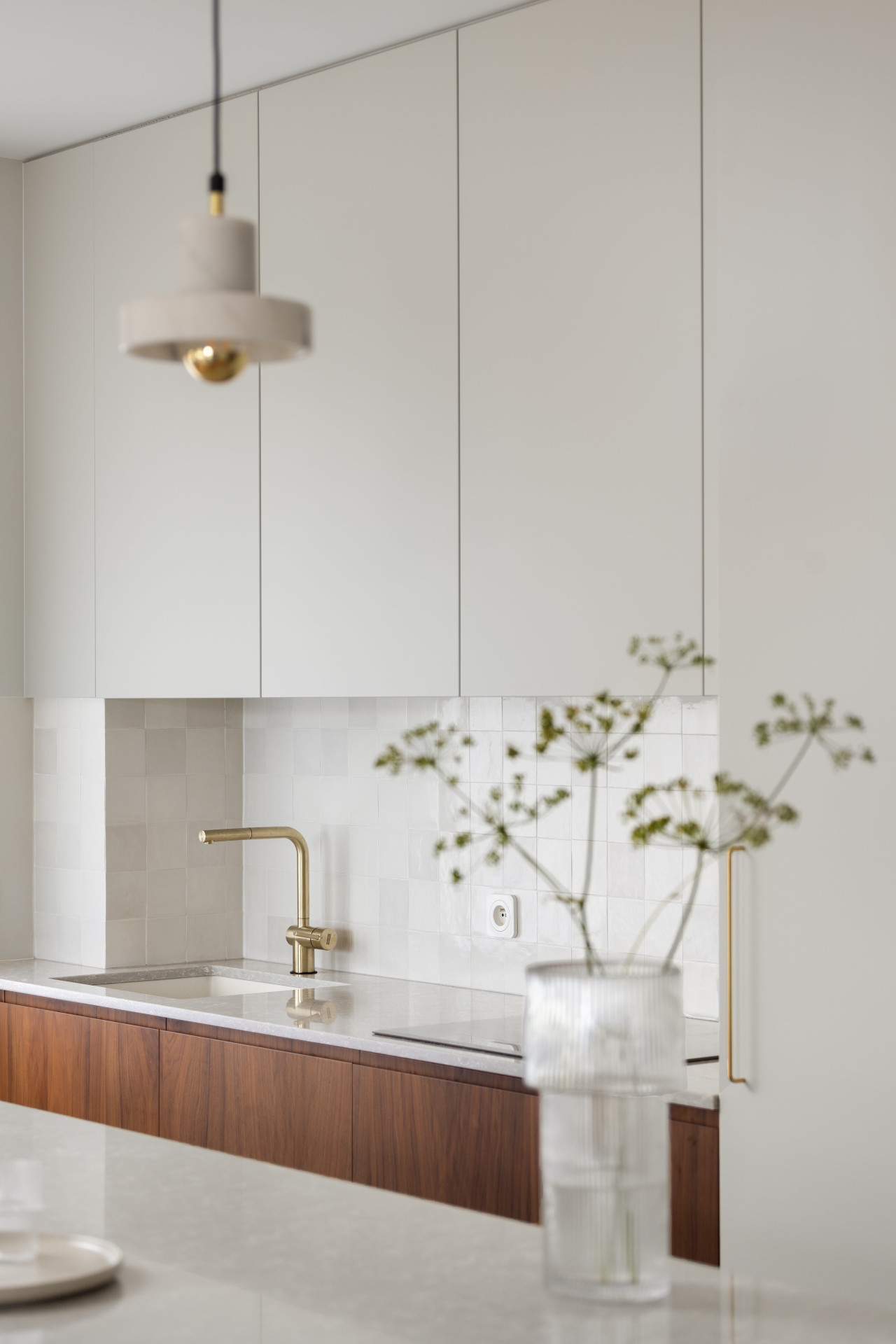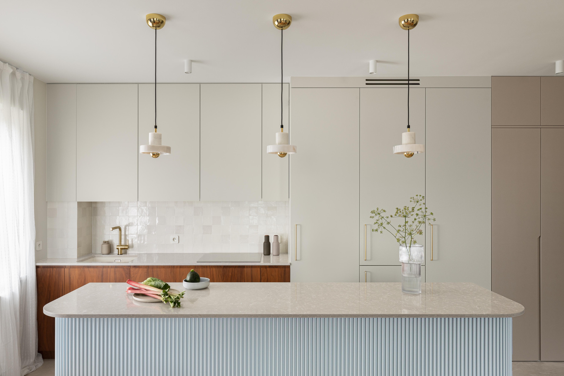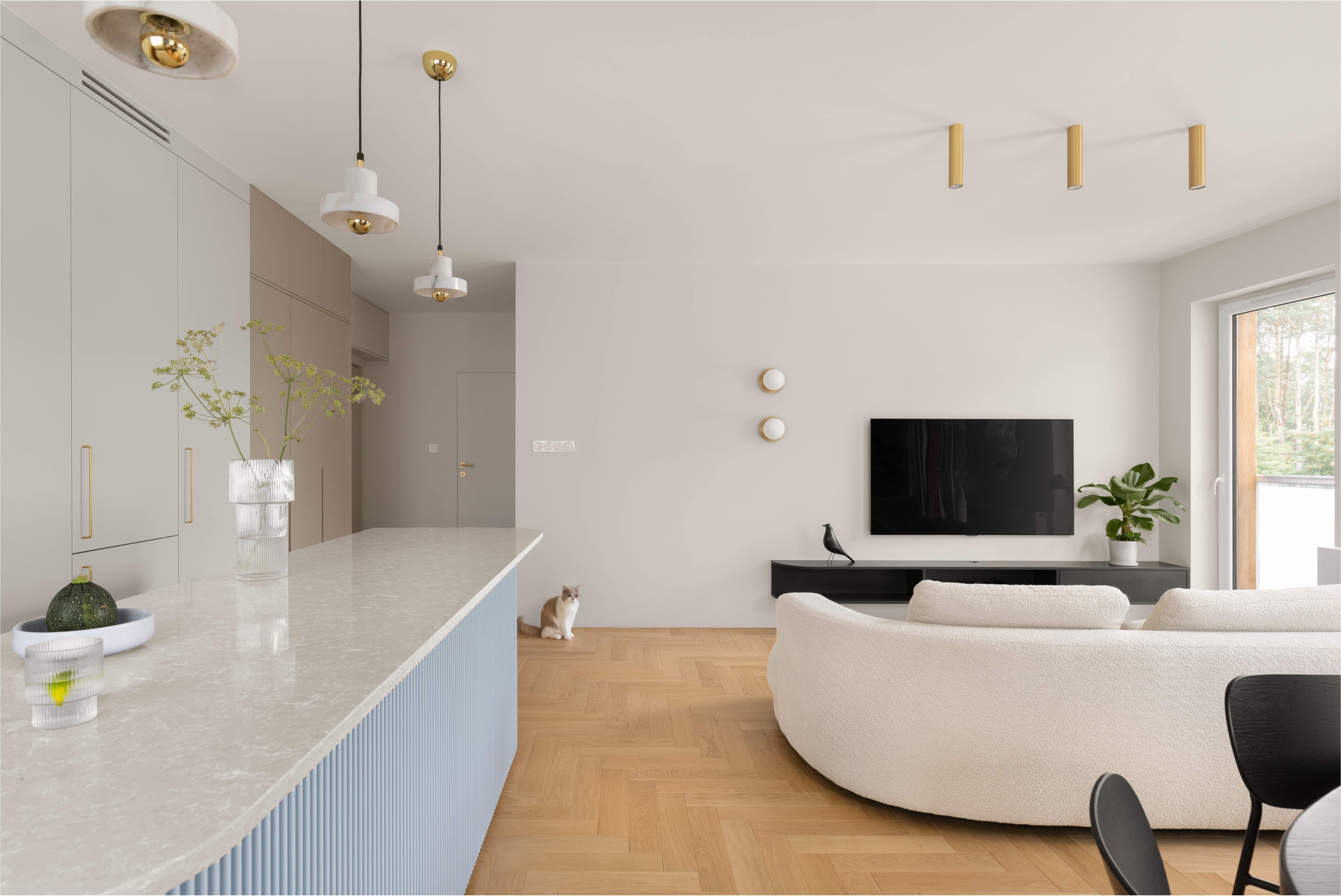 V interiéru bytu převládá oble tvarované vybavení, nechybí zde ani kámen, tentokrát hlavně mramor, kuchyňská deska je pak z tvrzeného kamene značky Technistone. „Věděla jsem, že mají rádi modrou barvu v interiéru, takže jsem ji plánovala použít v kuchyni. Když jsme se rozhodli otevřít půdorys a kuchyň a obývací pokoj se staly jedním prostorem, myšlenka dlouhého masivního ostrůvku přišla sama. Jsem ráda, že se tento nápad mým klientům líbil. Stal se srdcem tohoto bytu,“ popisuje Natalia Mielczarek-Prym.