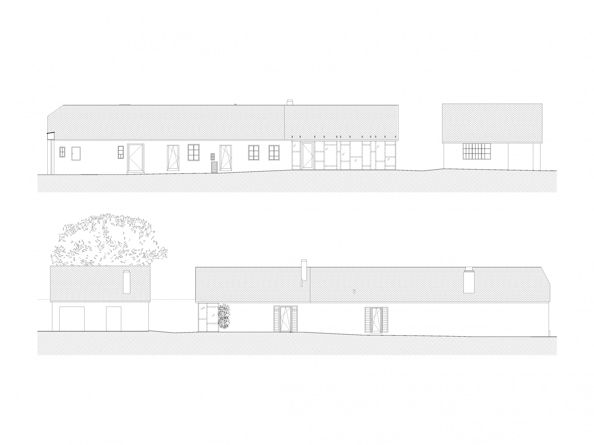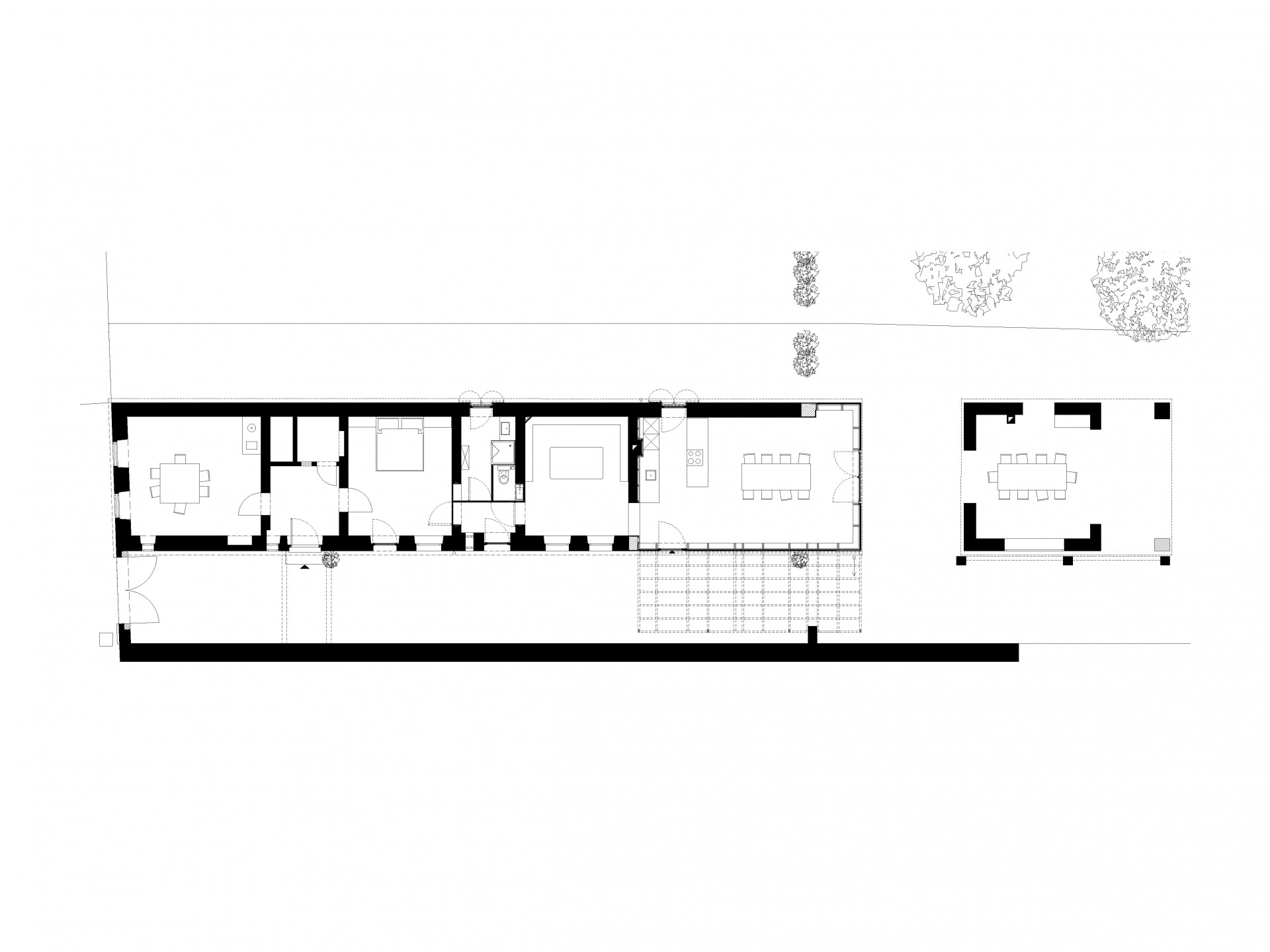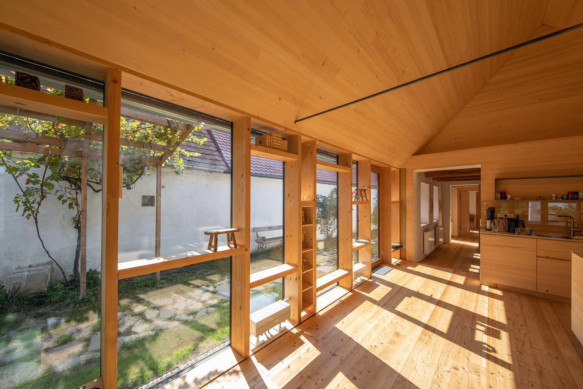 Dřívější volně stojící dílna v zadní části dvorku byla přeměněna na otevřenou terasu. Střecha a stěny byly zachovány, vznikly jen nové otvory, z nichž se otvírají výhledy na okolní pahorkatou krajinu s vinohrady. Prostor terasy je bezprostředně propojen s domem. Ten v chladných dnech vytápí kamna na dřevo.
