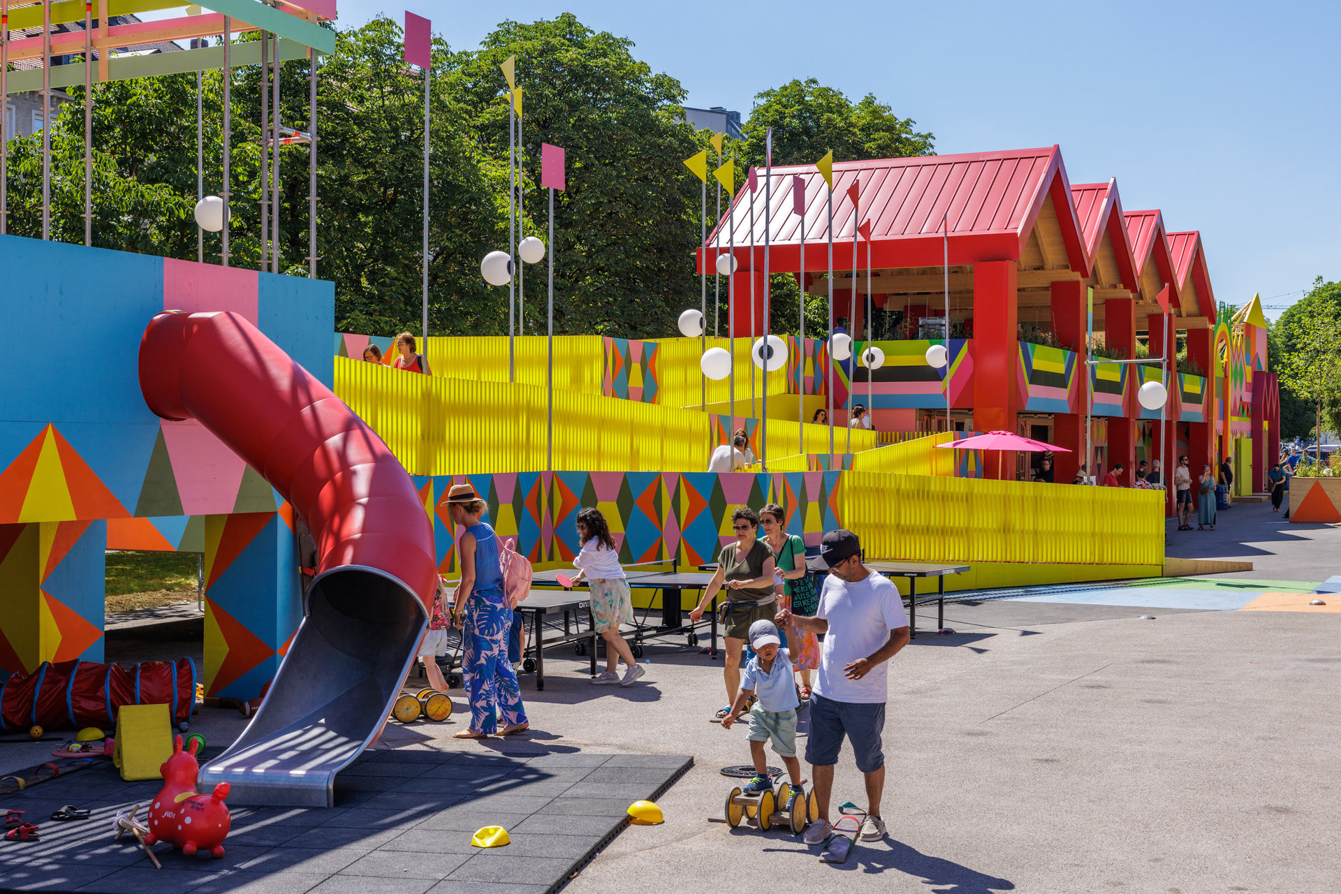 Projekt s názvem FLUX stojí na prostranství před muzeem současného umění a designu Pinakothek der Moderne od června 2025 a bude tu následujících pět let. Křiklavě barevný členitý hrad se špičatými věžičkami a křivolakými cestami může nejdříve evokovat spíše naddimenzovaný dětský kout(ek). I když tu skutečně najdeme houpačku a dvě klouzačky, FLUX slouží bez rozdílu všem. FÜR ALLE je ostatně i jeden z hlavních sloganů projektu.