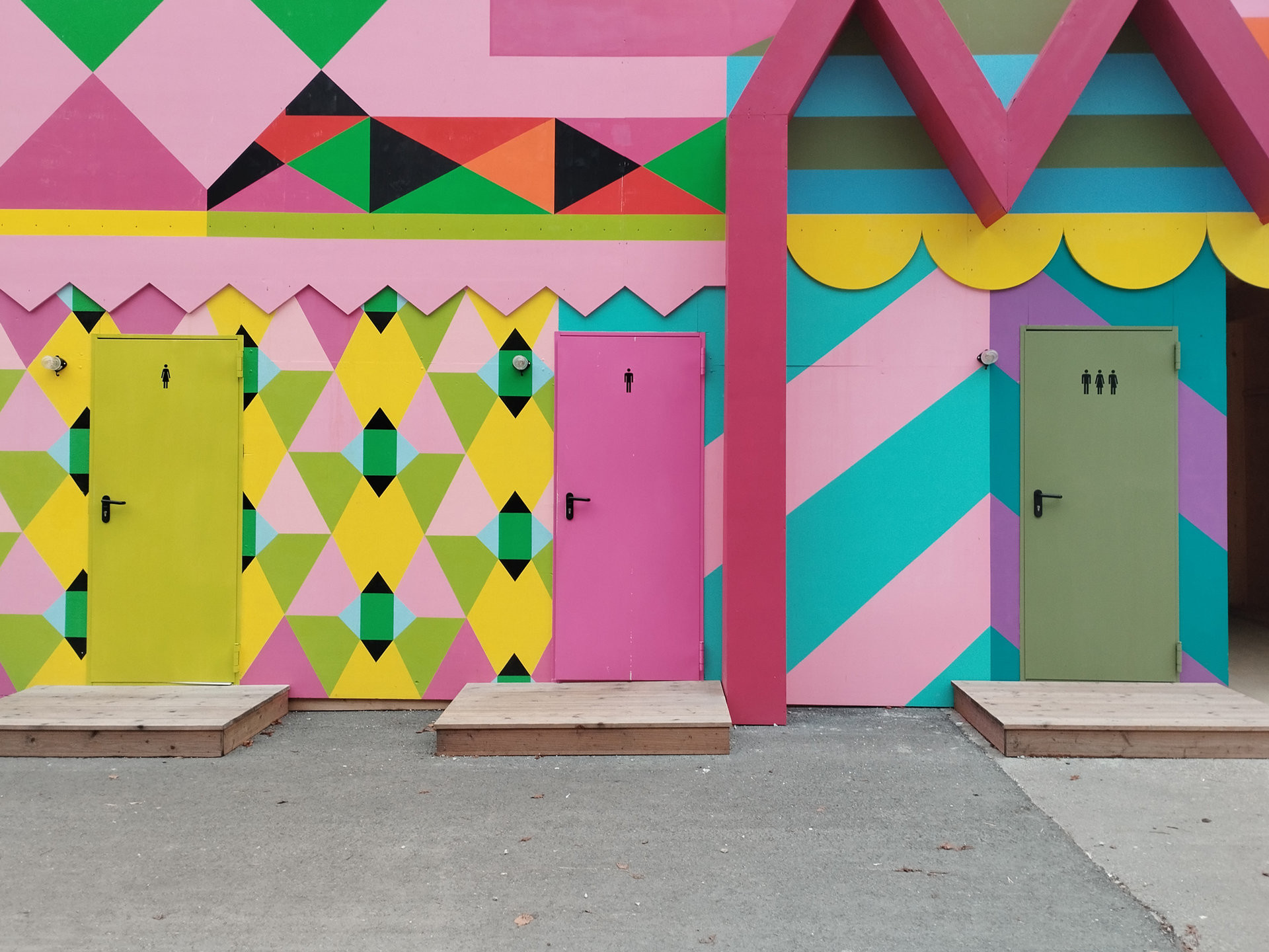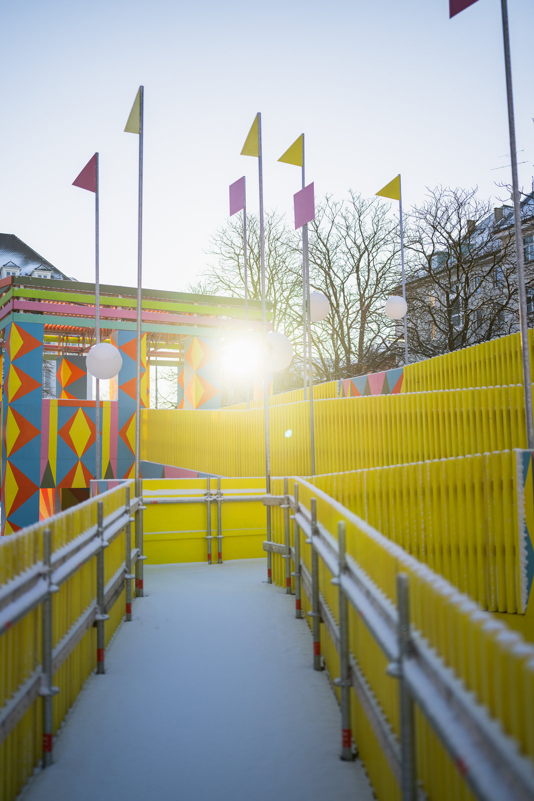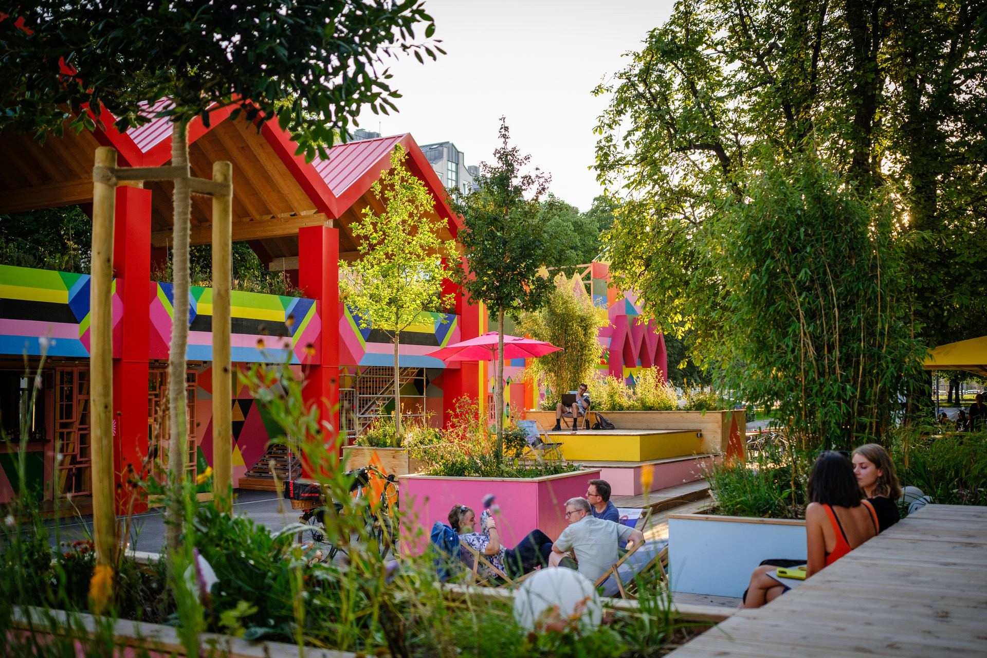Mnichov v zimě nepůsobí jako hřejivě přívětivé místo. Mlha leží proklatě nízko, široké ulice jsou plné troubících aut a lemované mohutnými bloky domů s fasádami v 50 odstínech šedi. Zářivě barevná konstrukce na vás proto svítí už z dálky. Žluté, růžové, zelené, modré, červené nebo fialové geometrické tvary se do sebe náhodně zasekávají do pestrobarevných obrazců. Jaksi podvědomě a ze zkušenosti očekávám, že se za konstrukcí schovávají nějaké reklamní účely. Takovéhle věci se přece nestavějí jen tak. S jakým nadšením pak při bližším zkoumání zjišťuji, že žádný konkrétní účel tahle promyšlená dřevostavba nemá. „Jen“ rozdávat radost.