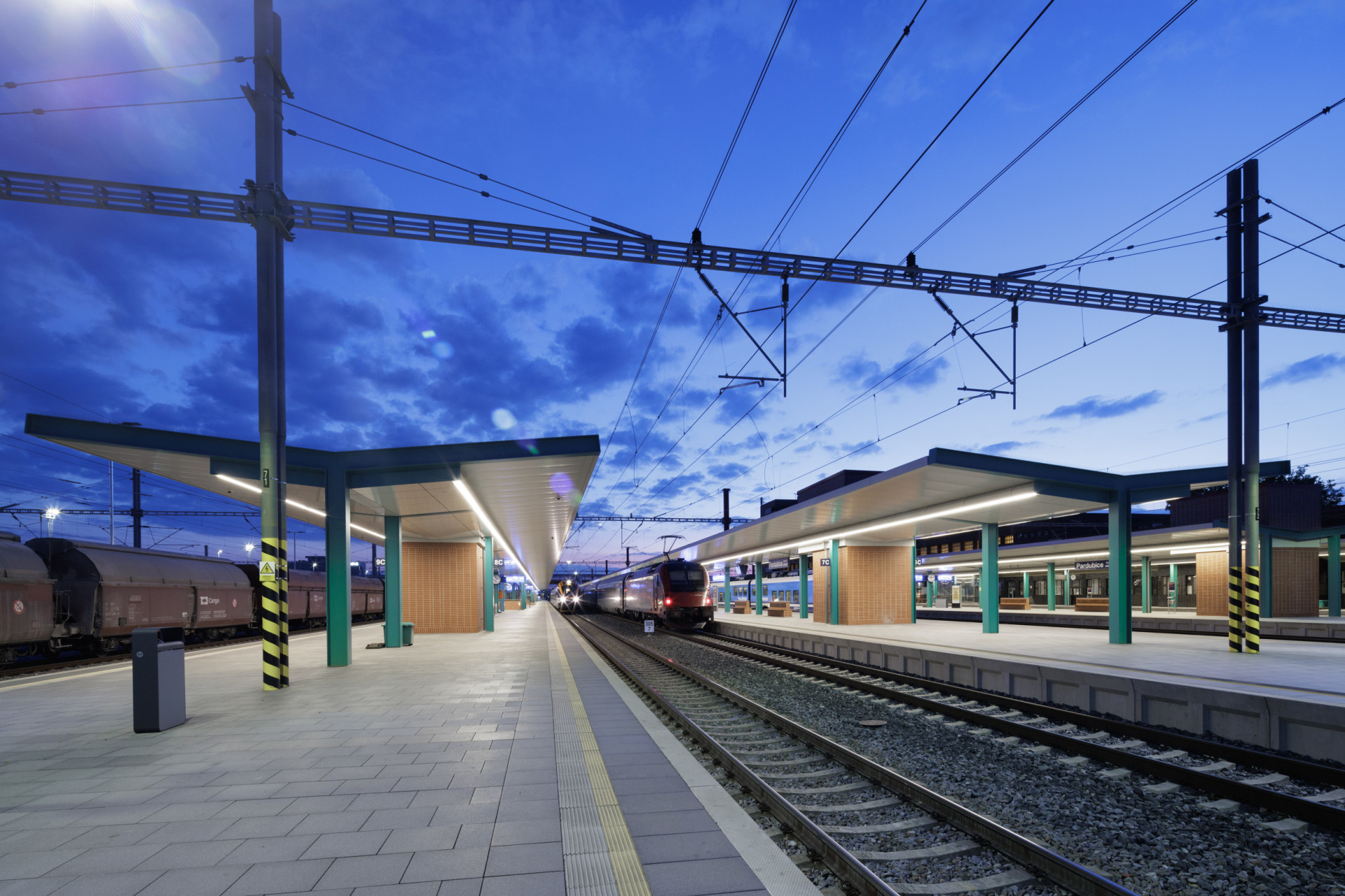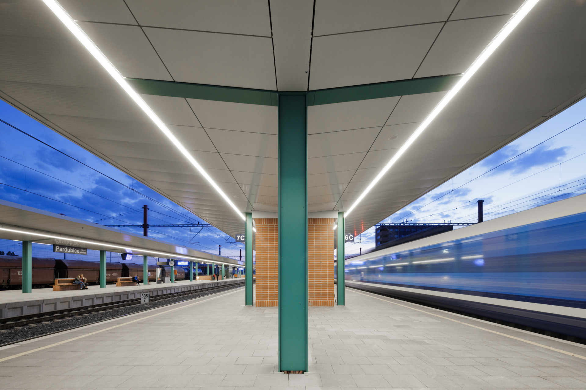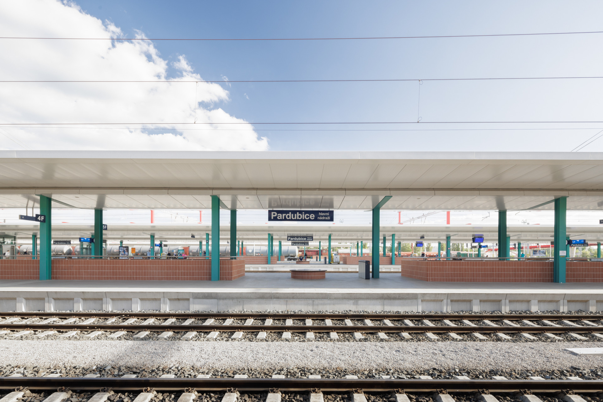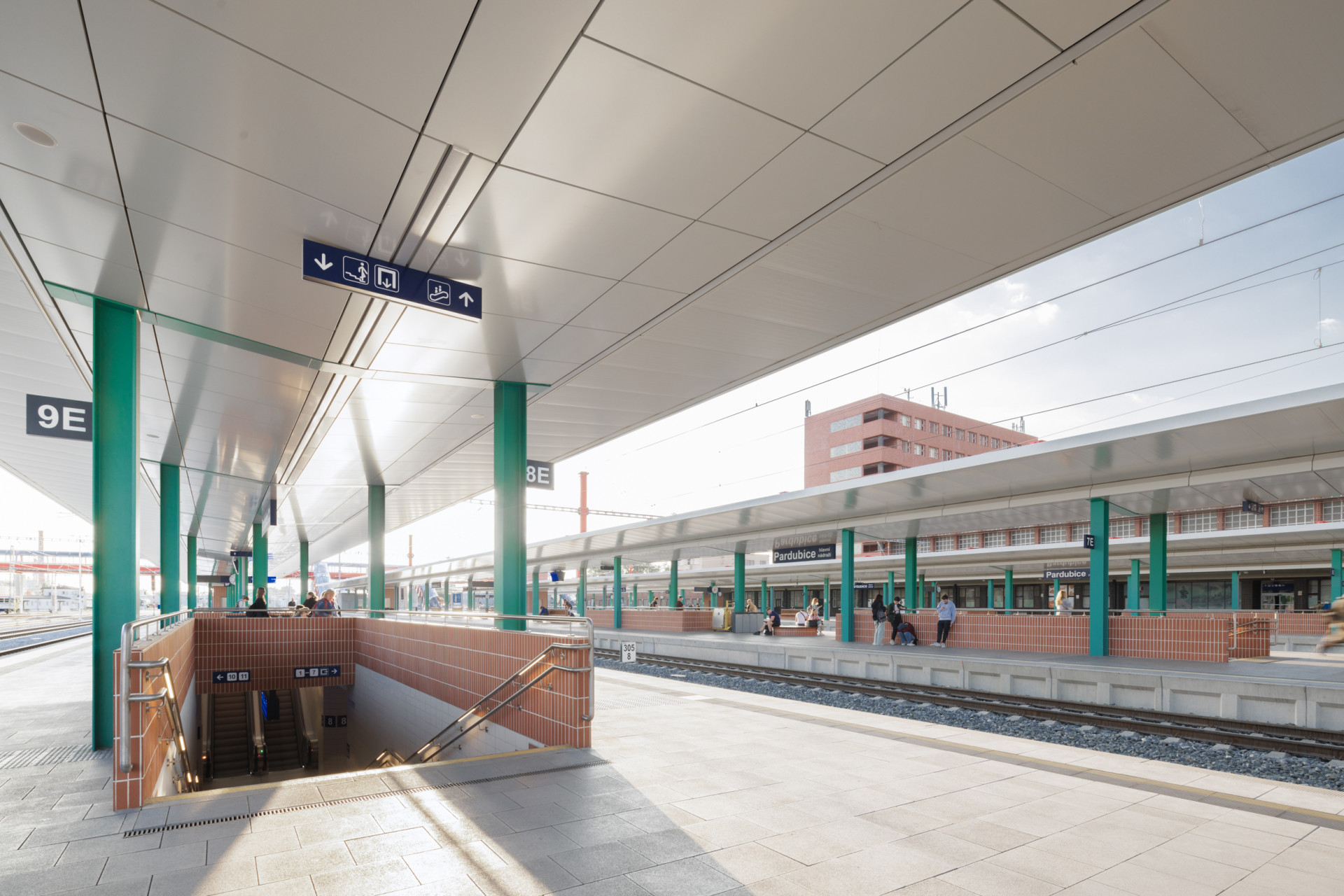 Největší výzvou bylo řešení prvního nástupiště – kopíruje totiž výpravní budovu. Původní zastřešení bylo nepříliš citlivě přisazeno přímo k ní. Nově je prostor mezi zastřešením nástupiště a čelem budovy překlenutý tabulemi bezpečnostního mléčného skla. Spolu s tvarovou jednoduchostí celé konstrukce si tak oba objekty nekonkurují, mají vlastní prostor, harmonicky na sebe navazují.