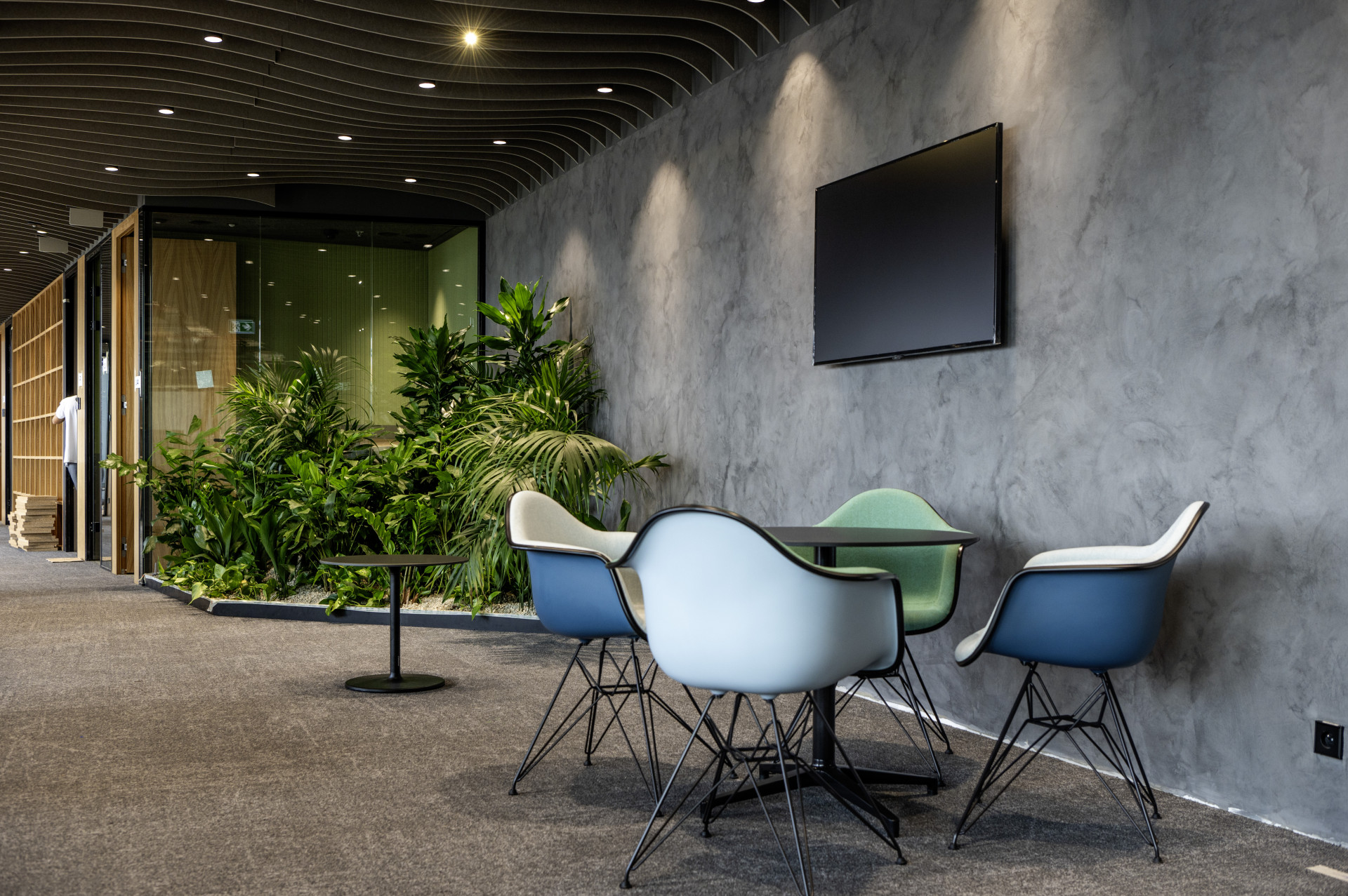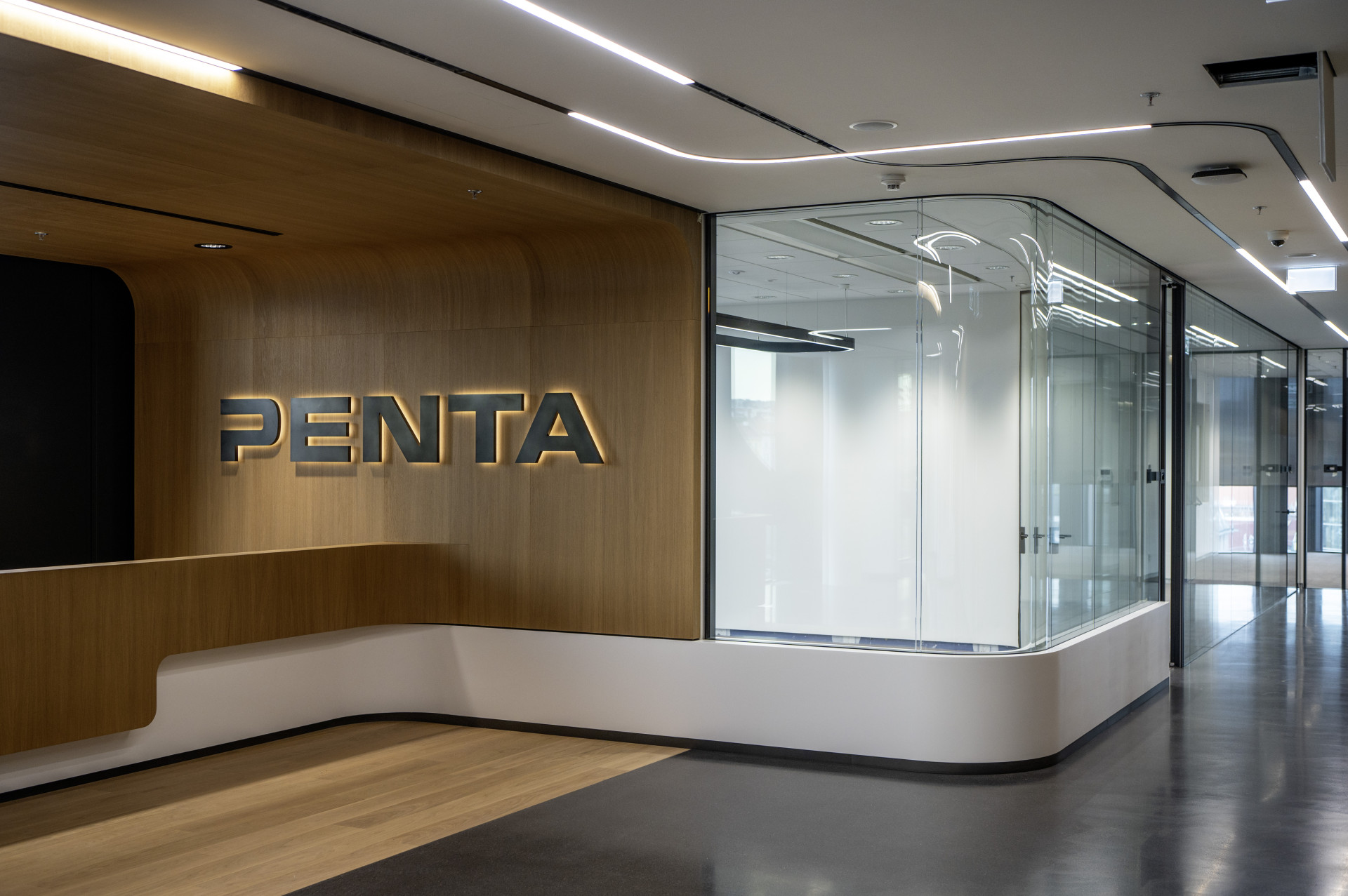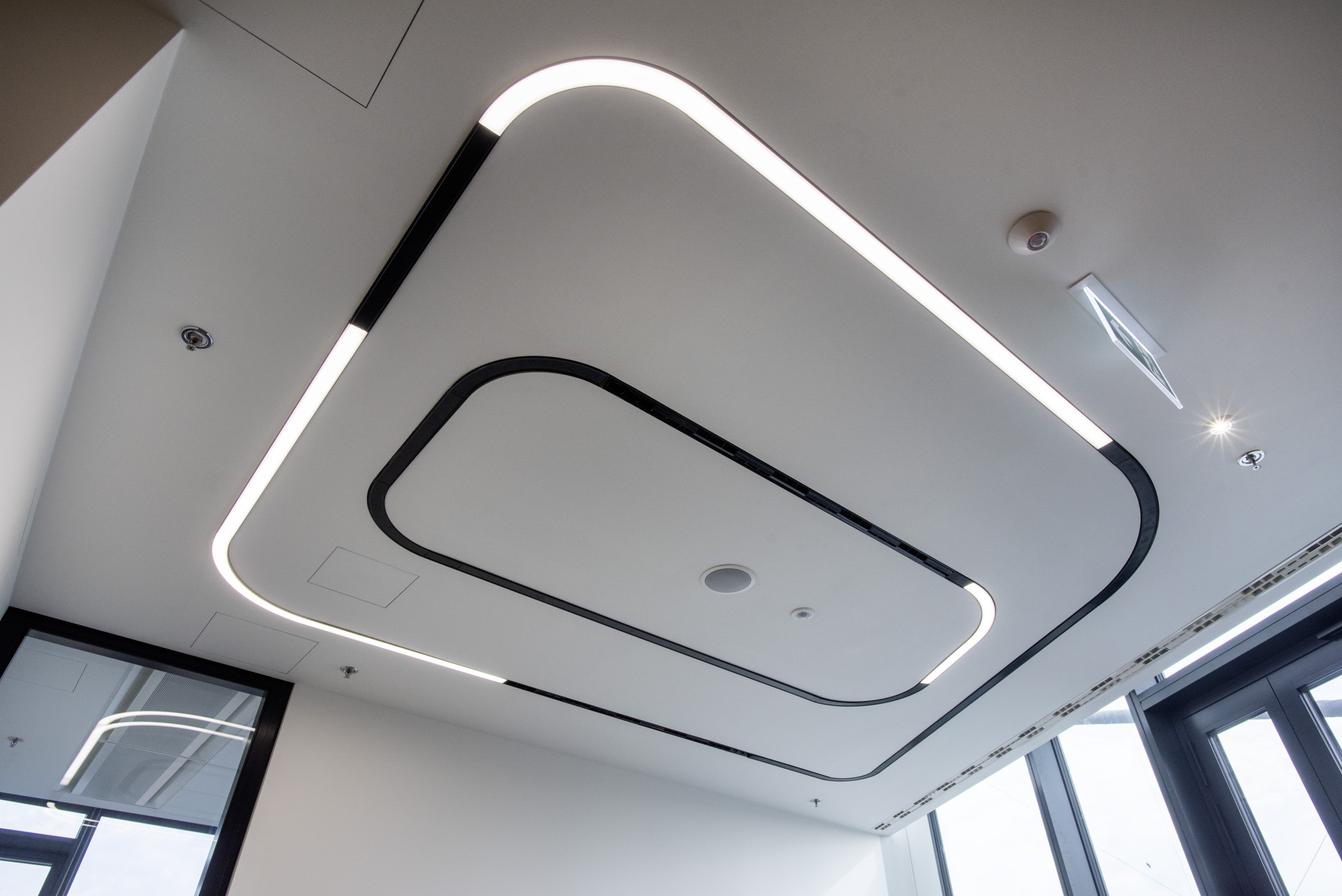 Na patrech jsou kanceláře (fit-outy) nájemníků, které jsou odděleny bezpečnostními a současně požárními příčkami, neboť se vždy jedná o odlišný požární úsek. Ve fit-outech najdeme zajímavě tvarované příčky a stěny včetně oblouků o průměru 1,5 metru. Příčky, které jsou upevněné ve stropě a v betonové podlaze, jsou standardní. Mnohem více pozornosti zaslouží příčky svěšené ze stropu a k podlaze zakončené sklem, takže tvoří „nadsvětlík“. Aby bylo možné takový oblouk ze sádrokartonu tvarovat, musely se připravit oblouky ze dřeva, které se nasadily na nastřižený profil. To umožnilo, aby oblouk zůstal tuhý a pevný a sádrokartonová deska držela tvar. Fasáda je velkolepě prosklená, což byl důvod k napojení interiérových příček k ní v kluzném provedení. Při jejím zahřívání bude logicky docházet k pohybům. Zde bylo nutné použít v části příčky modré desky Diamant (cca 50–100 cm od fasády). Napojení příček s fasádou generuje totiž další výzvu a tou je akustika. Na provedení těchto detailů velmi záleží. Sloupky fasády jsou proto obloženy sádrokartonem z obou stran. Na sloupky se nalepil plech, těsnící molitan aby se doladila šířka. Poté se vše zaklopilo. V některých fit-outech jsou tyto příčky postaveny kompletně z desek Knauf Diamant. Objekty mají zdvojené 15cm podlahy. V místech, kde byly svěšené příčky od stropu k podlaze (sádrokarton s navazujícím sklem) musela být řešena akustika také pod podlahou, neboť tam chyběl sádrokarton. Řešením bylo například 6 až 7 nařezaných desek Knauf White tvořící akustický i doslovný blok pod podlahou.