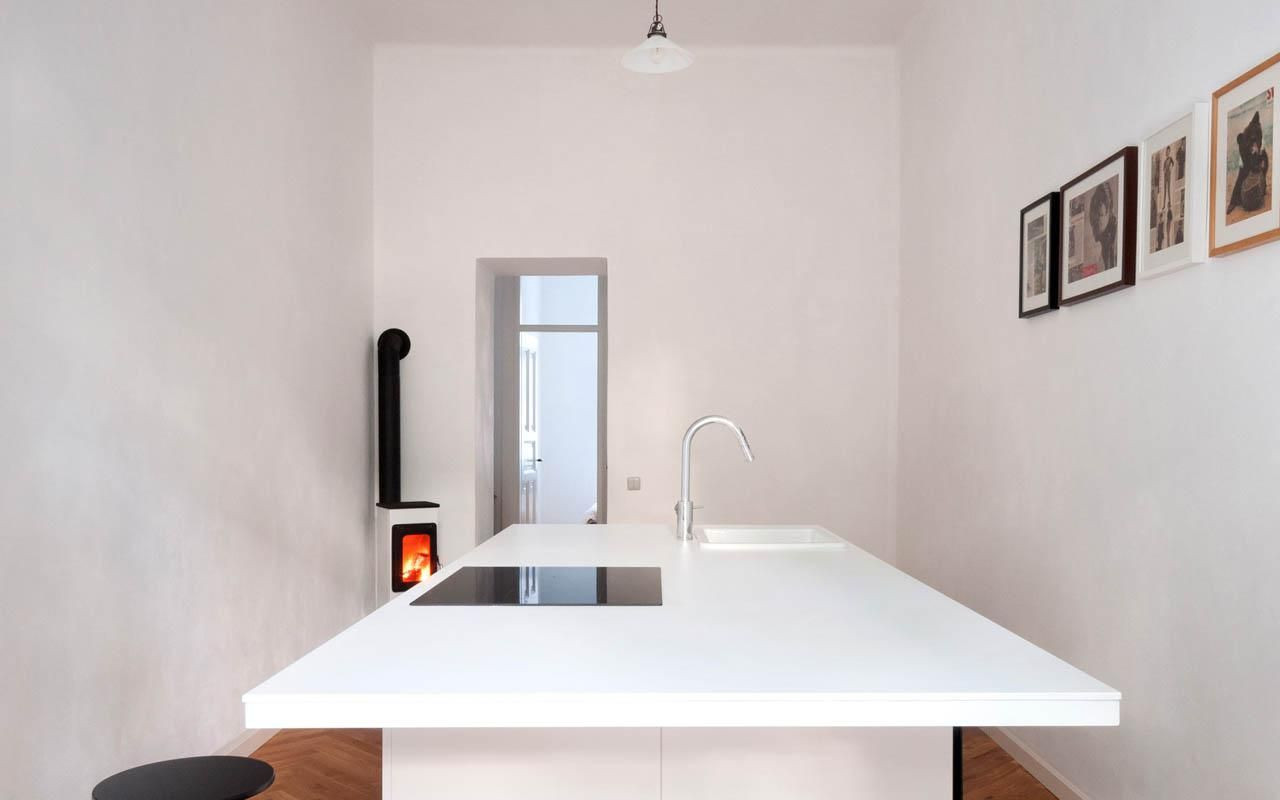 V našem návrhu jsme se snažili obrátit nevýhody bytu ve výhody. Poloha v prvním nadzemním podlaží si přímo říkala o „francouzské“ okno, které by propojilo obytnou kuchyň a zahradu ve dvoře. Díky možnosti vést odpadní potrubí ve sklepě nebylo složité zřídit v bytě novou koupelnu a WC. Vlhkost v bytě je regulována topením v kamnech, která bylo možné připojit do původního komínového průduchu.