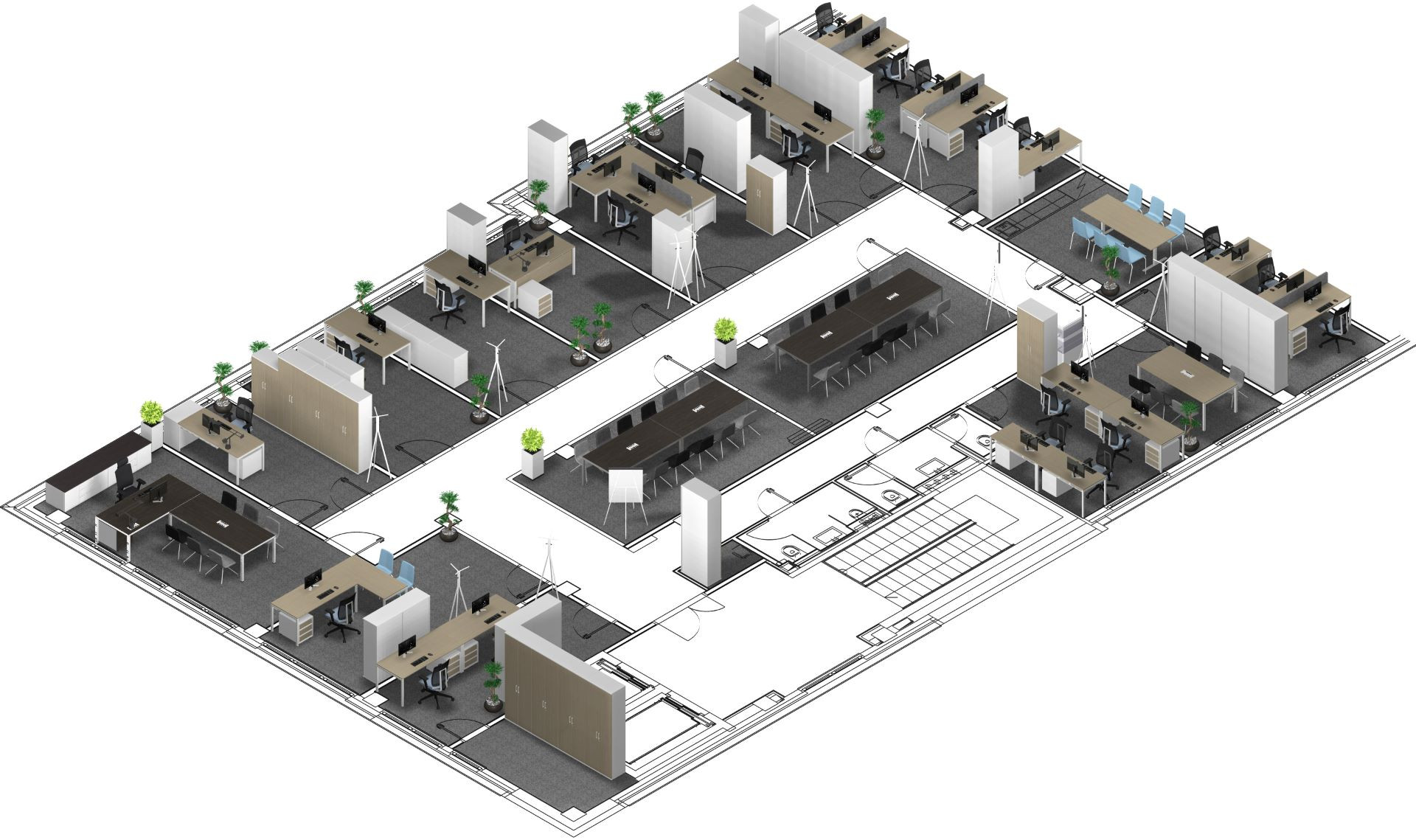 V ostatních kancelářích byl zvolen nábytek z řady MOON, který je vhodný jak pro menší kanceláře, tak i velké open space prostory. Pro společnost LEXUM byly vytvořeny kompaktní kanceláře s nábytkem v kombinaci dřeviny dub a bílé barvy na kovových podnožích a korpusech skříní. Tento nábytek byl následně použit také v dalších realizacích, například na klinikách, v ambulancích a očních optikách, což podpořilo vizuální propojení napříč celou společností.
