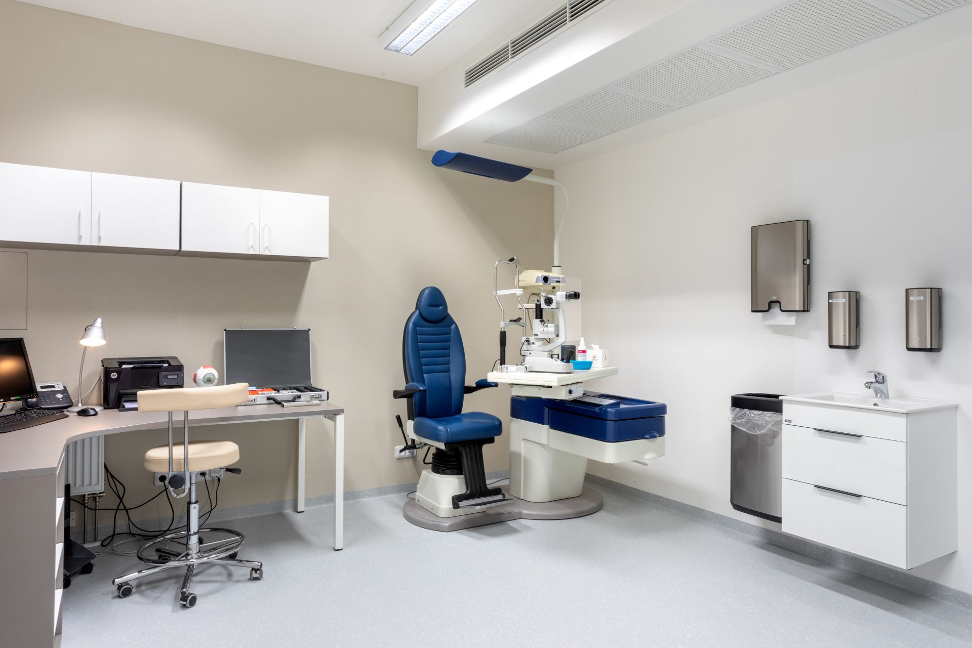 V ordinacích byla použita nábytková řada MOON, doplněná o úložné systémy SAVE CH v barevné kombinaci šedé, cubanitové a bílé. Pracovní stoly pro lékaře a optometristy byly buď rovné, nebo ergonomicky tvarované, doplněné zásuvkovými kontejnery či výsuvnými boxy, čímž se docílilo efektivního a praktického uspořádání pracovního prostoru.