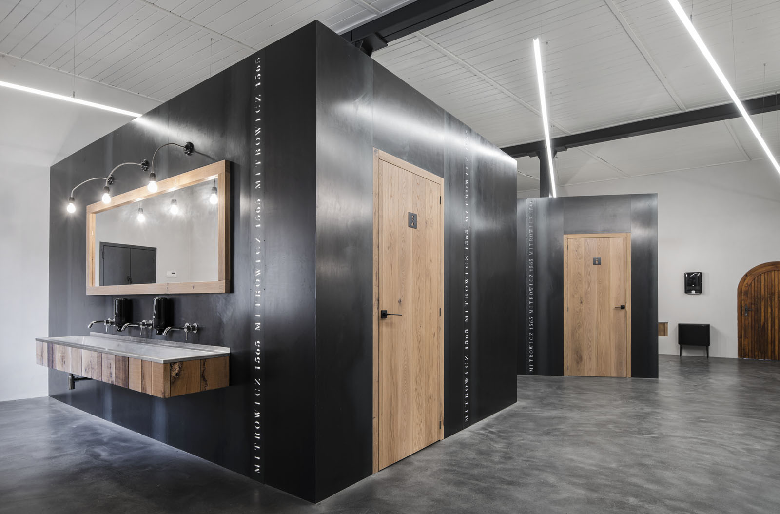Celý interiér areálu zámku včetně zmíněných toalet v sobě propojuje černé akcenty a industriální styl, který našel inspiraci v budově bývalého pivovaru a kovářské černi, s níž se zde často v minulosti pracovalo. Tyto prvky se opakují nejen na schodišti, ale také kolem dveřních zárubní a dveřním kování, které do celého objektu dodávala česká společnost M&T.