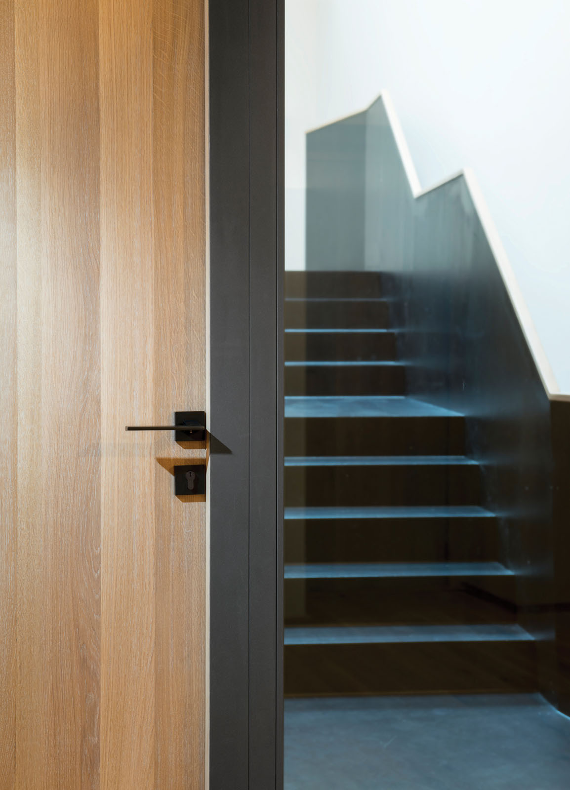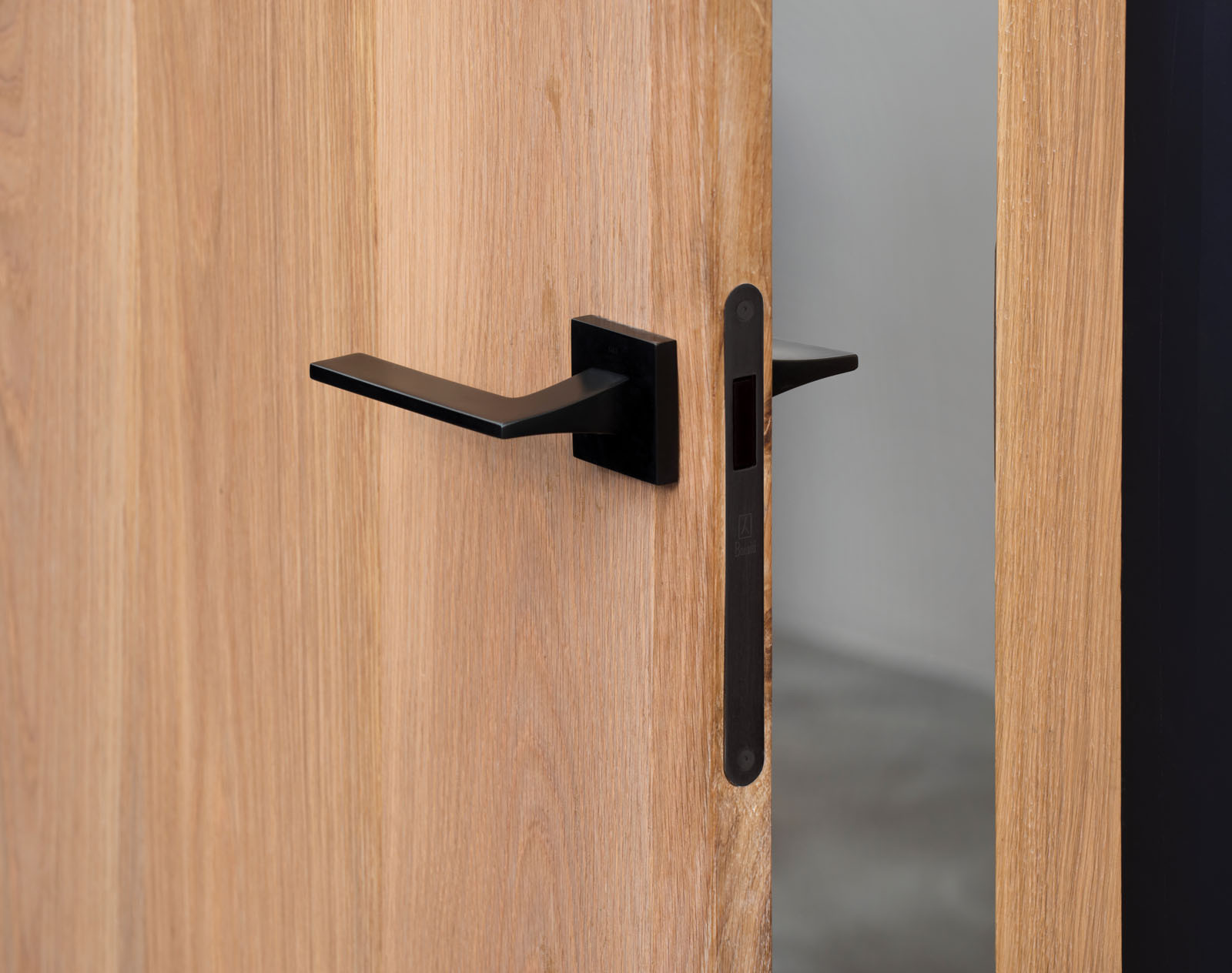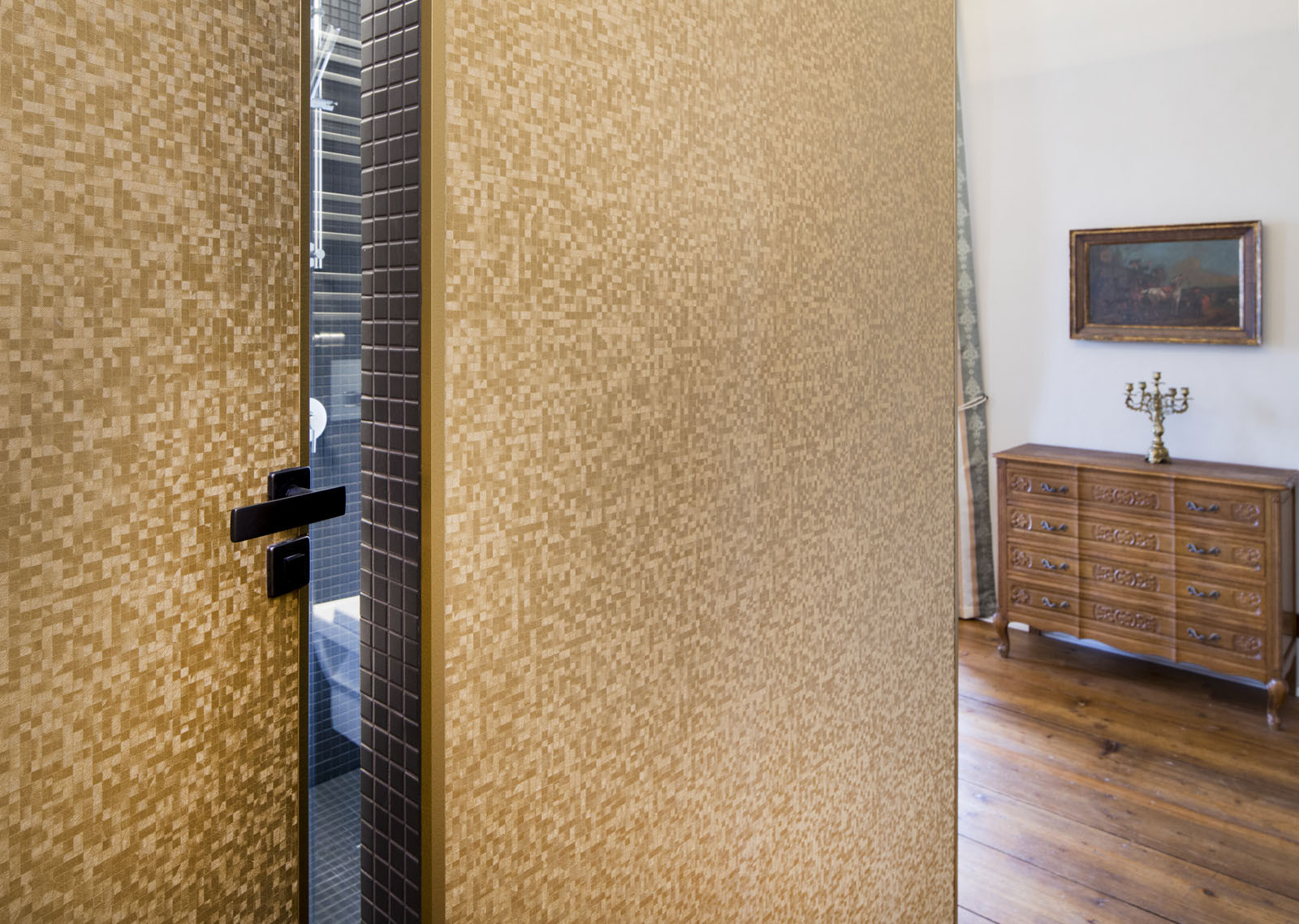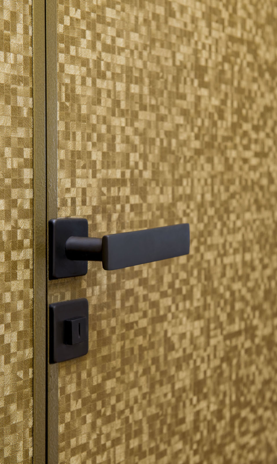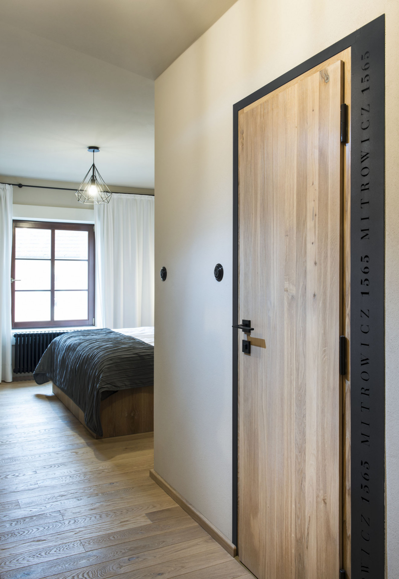 Pro kliky ENTERO i TERRY byla zvolena luxusní povrchová úprava titan černý mat. „Titanová povrchová úprava se na kování nanáší speciální technologií fyzikálního naprašování plazmovým výbojem. Nejedná se tedy o žádný nástřik či nátěr, ale o speciální technologií nanesenou tvrdou kovovou tenkou vrstvu, která k základnímu podkladovému materiálu dokonale přilne," uvádí Roman Ulich, hlavní designér společnosti M&T, jediného českého výrobce designového dveřního a okenního kování a dodává: „Povrch kliky je vysoce odolný vůči oděru a poškrábání, a navíc je chemicky i barevně stálý, takže černá ani po mnoha letech používání nevybledne." Jistou zajímavostí jsou také nápisy vyfrézované do černého plechu kolem dveřní zárubně, které jsou nejen odkazem na historii zámku Mitrowicz, ale zároveň slouží jako heslo na wifi.