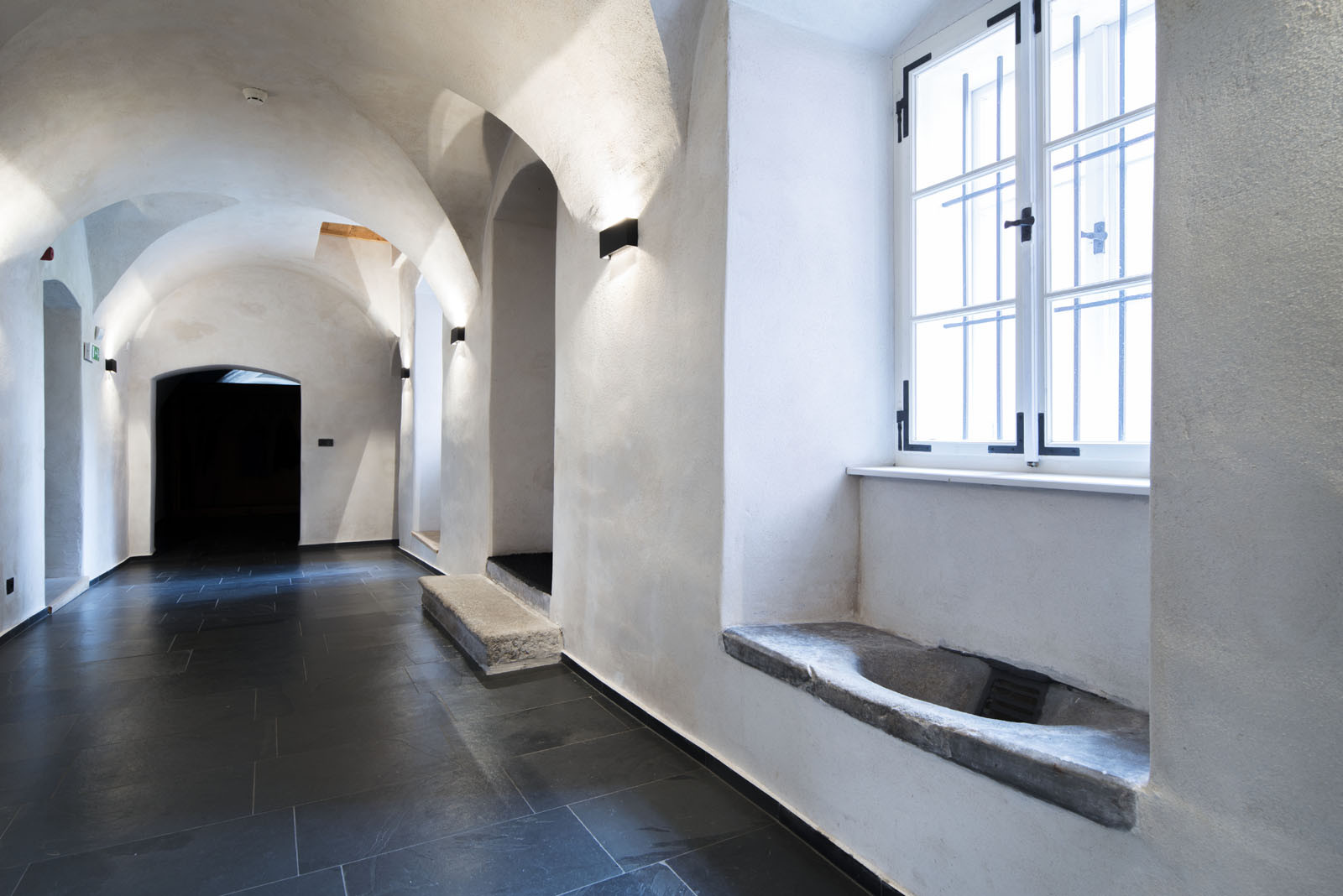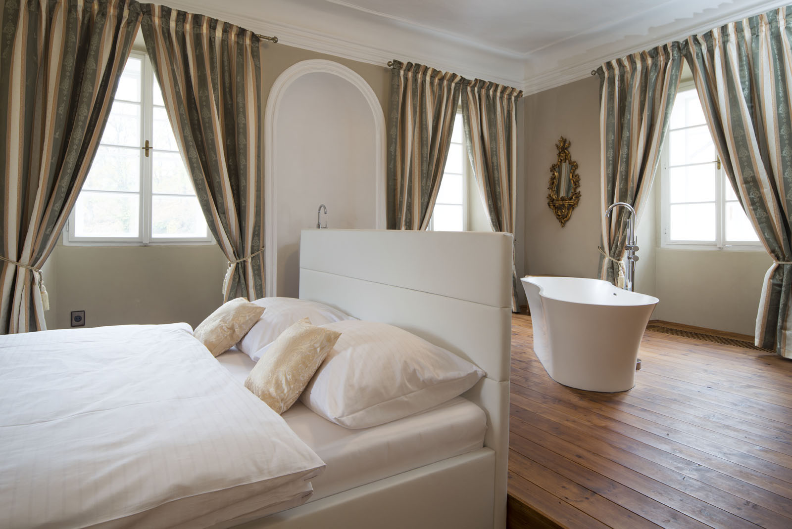 „Opravdu unikátním způsobem jsou v jednotlivých apartmánech řešeny koupelny, které jsou v podobě vestavěných boxů volně vsazené do prostoru. Tímto architektonicky zajímavým řešením jsme minimalizovali stavební zásahy do historicky hodnotného zdiva," vysvětluje Pražák. „Stěny těchto vložených segmentů mají ale i další funkci – pomocí desek značky Rehau v nich koluje teplá voda, tudíž se vedle kachlových kamen, která byla pečlivě zrestaurována a nyní jsou elektrifikovaná, podílí na ohřevu místnosti." Toto řešení bylo zvoleno zejména z toho důvodu, aby topná tělesa nikterak nenarušovala dobovou podobu interiéru.