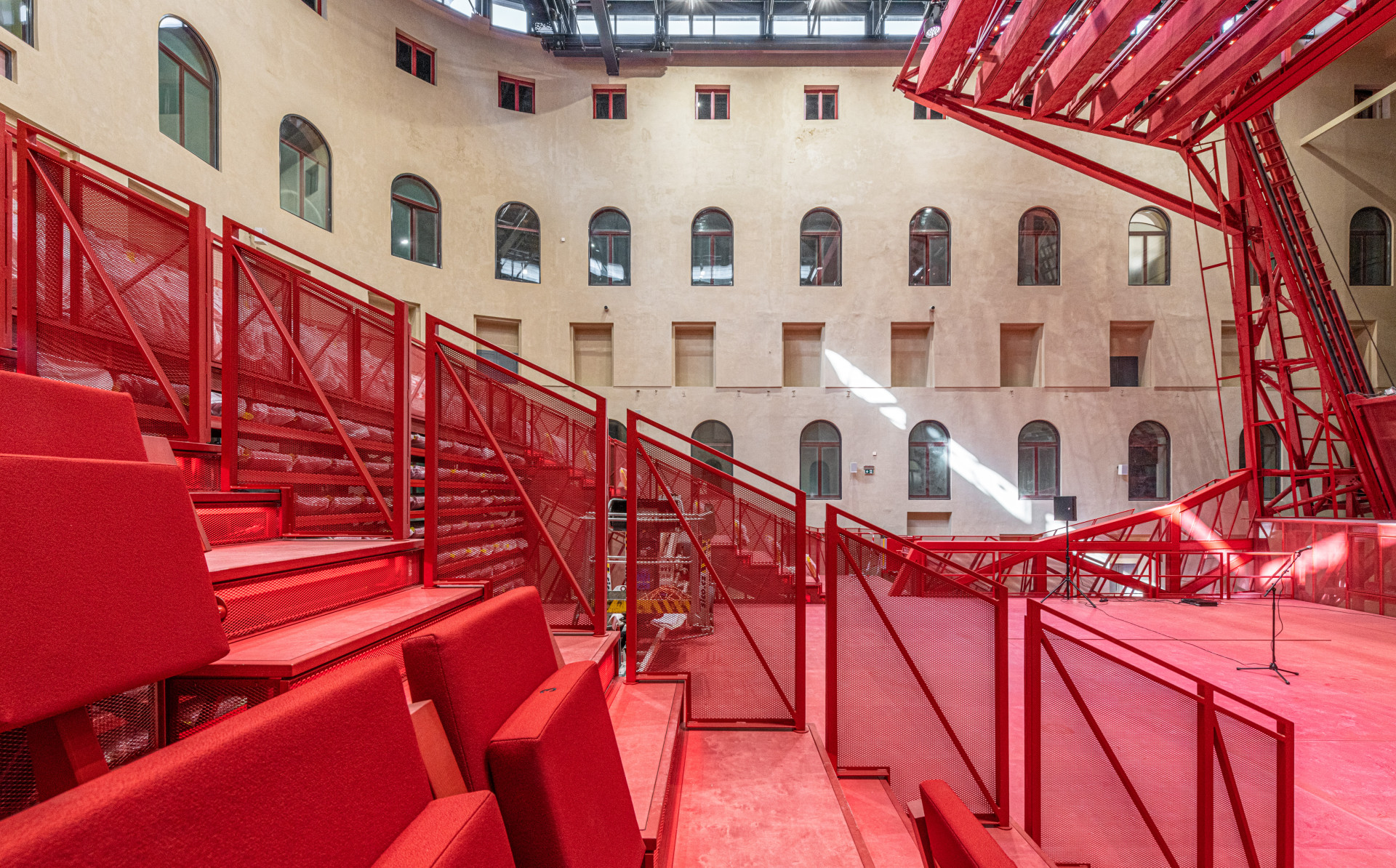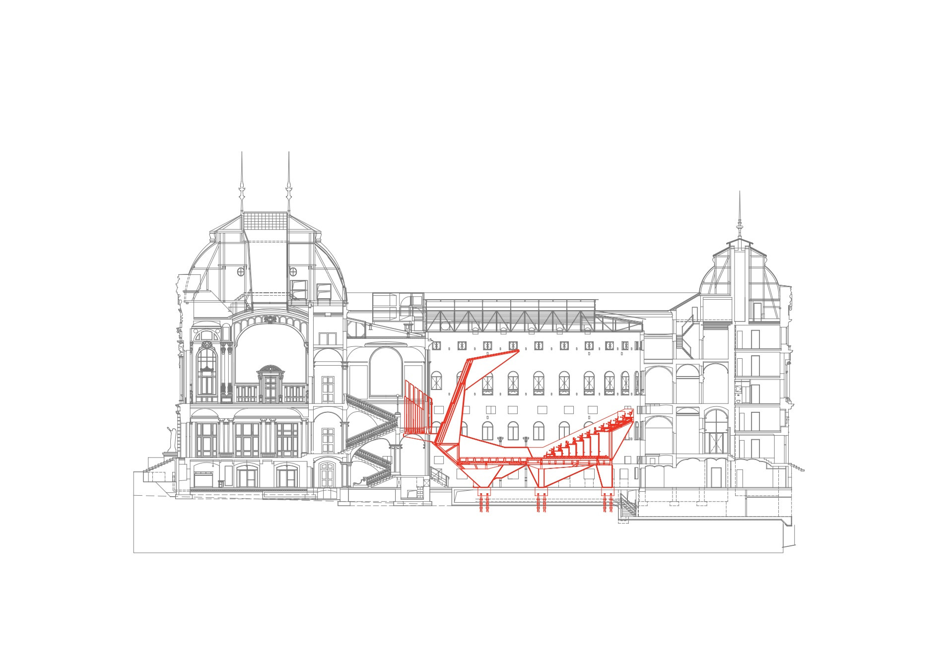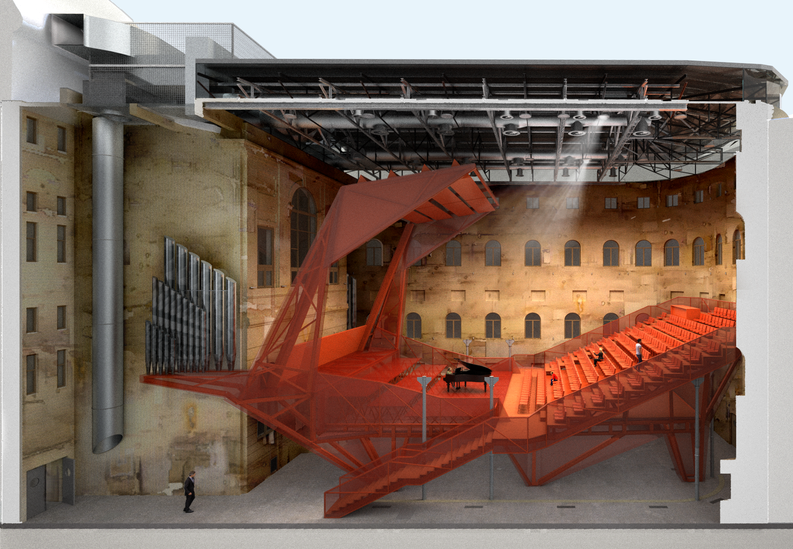 Jeřábem se dovnitř dopravilo 150 tun materiálu. „Bylo to jako stavět plachetnici v láhvi. Nejprve jsme museli vše vyrobit a nanečisto sestavit v hale, abychom věděli, že nic nechybí. Poté bylo nutné vše očíslovat, rozložit a zase sestavit v atriu budovy. Šlo o mravenčí práci, za kterou stojí úžasní technici z prováděcích firem,“ popisuje architekt Petr Hájek. „Nemohli jsme konstrukci svářet, ale drží pohromadě pomocí šroubových spojů. Kladlo to extrémní nároky na přesnost,“ říká Martin Vondrášek z AVT Group, která měla na starosti akustiku sálu.