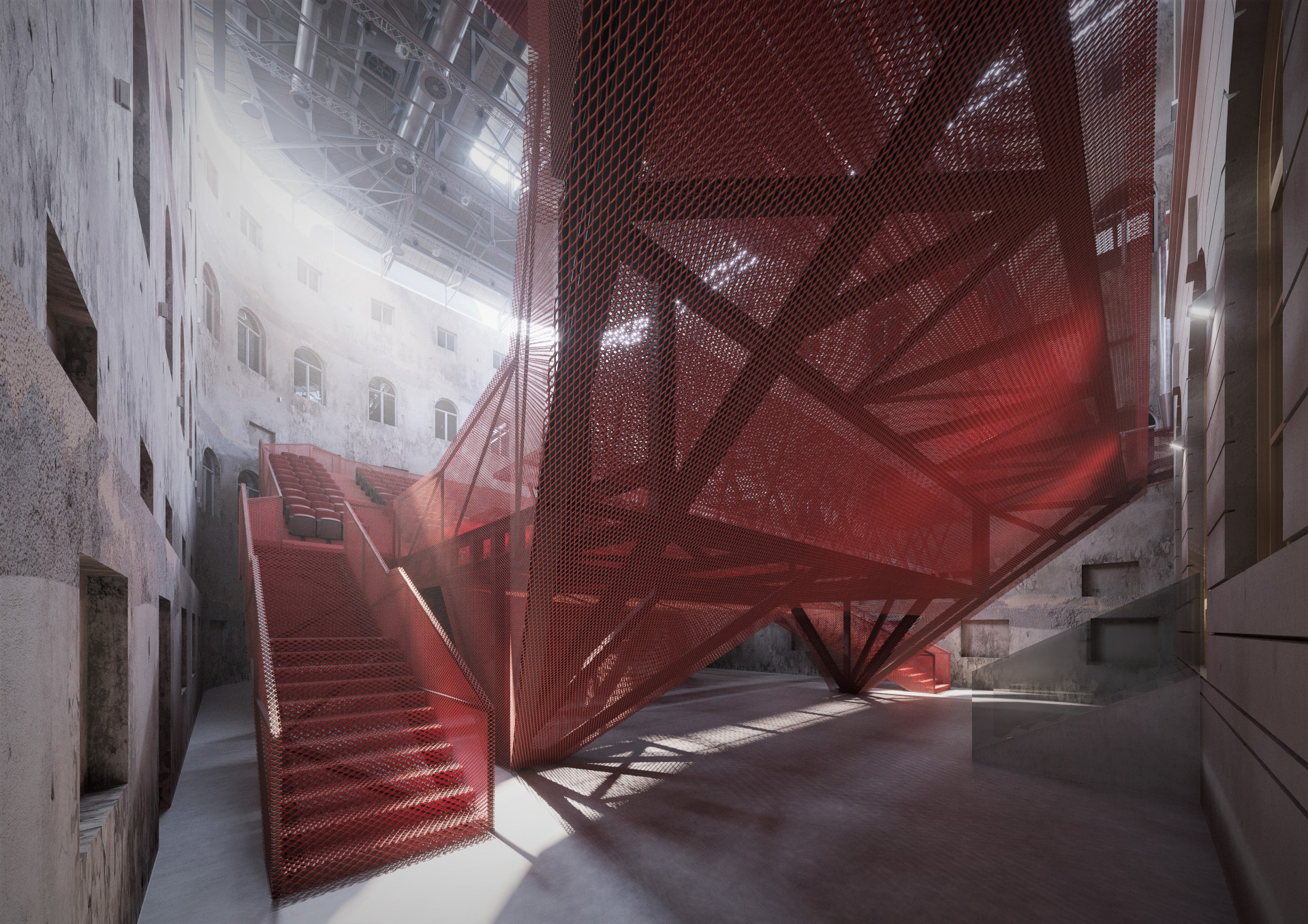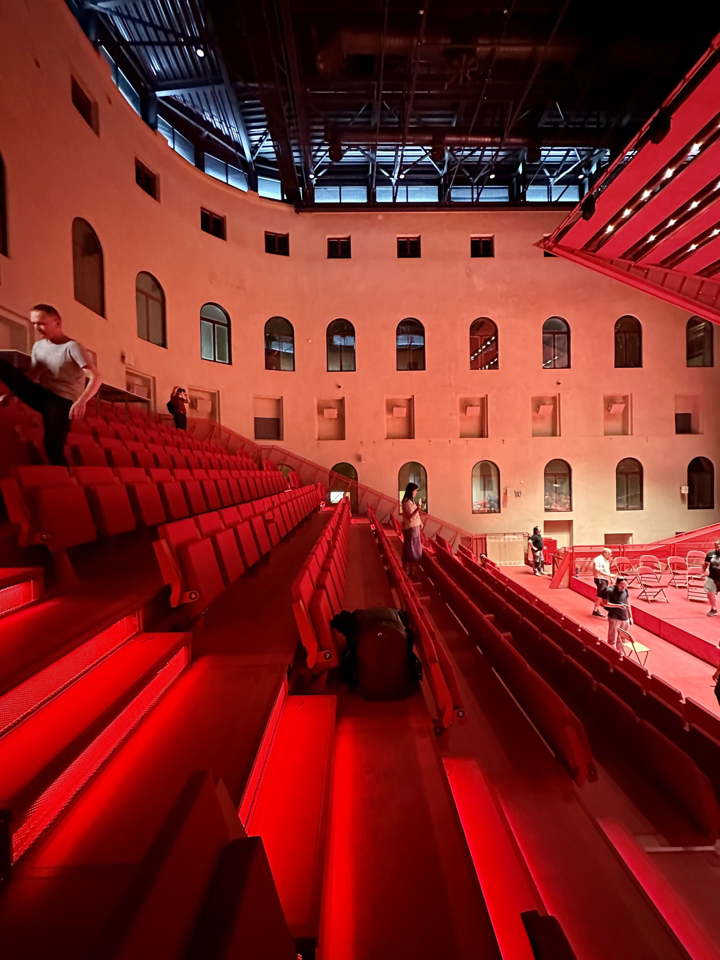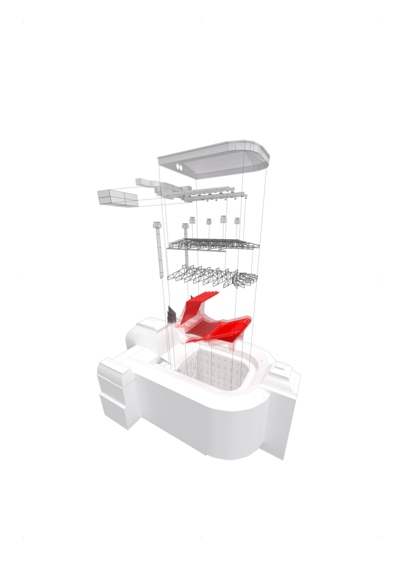 Jeřábem se dovnitř dopravilo 150 tun materiálu. „Bylo to jako stavět plachetnici v láhvi. Nejprve jsme museli vše vyrobit a nanečisto sestavit v hale, abychom věděli, že nic nechybí. Poté bylo nutné vše očíslovat, rozložit a zase sestavit v atriu budovy. Šlo o mravenčí práci, za kterou stojí úžasní technici z prováděcích firem,“ popisuje architekt Petr Hájek. „Nemohli jsme konstrukci svářet, ale drží pohromadě pomocí šroubových spojů. Kladlo to extrémní nároky na přesnost,“ říká Martin Vondrášek z AVT Group, která měla na starosti akustiku sálu.