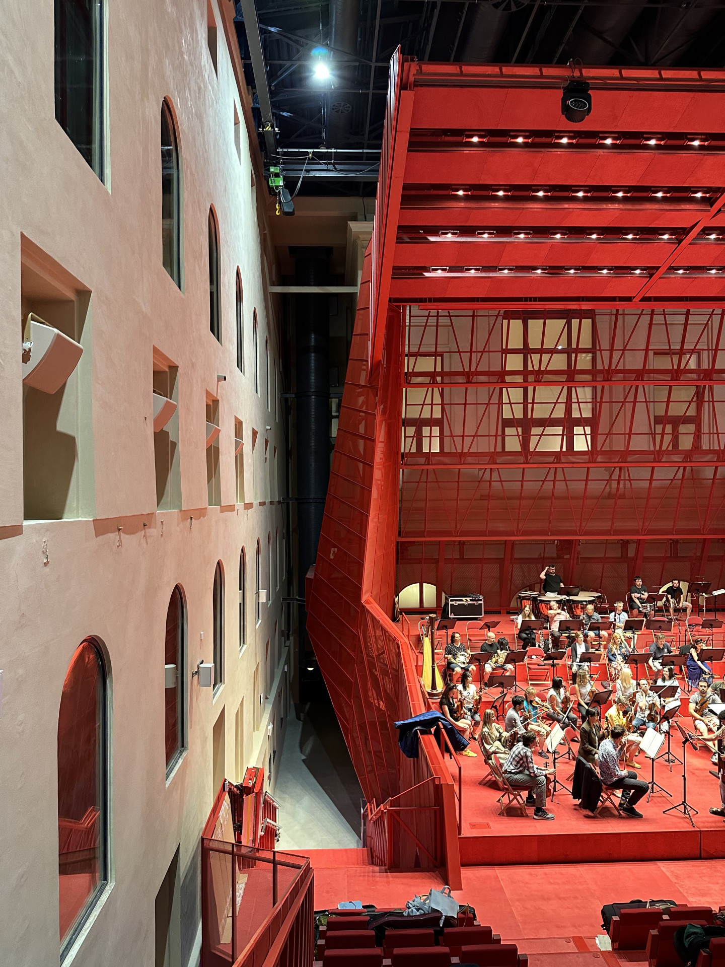 Přetvářet a „přestavovat“ je možné také akustiku a osvětlení. Kolem obvodů sálu bude zavěšen akustický závěs, díky kterému bude možné měnit dobu dozvuku. V době naší návštěvy tu probíhaly první zkoušky orchestru a řešilo se například, jestli zvuk tympánů neuniká do prostoru. Celkově je potřeba udělat ještě řadu menších úprav, aby se sál správně rozezněl. „Ten sál je také něco jako hudební nástroj, který je třeba naladit. Musíme nejprve vyzkoušet řadu konfigurací a prověřit je zkouškou a pak tato nastavení uložíme do paměti. Pak už v podstatě stačí stisknout jedno tlačítko,“ říká architekt Petr Hájek.