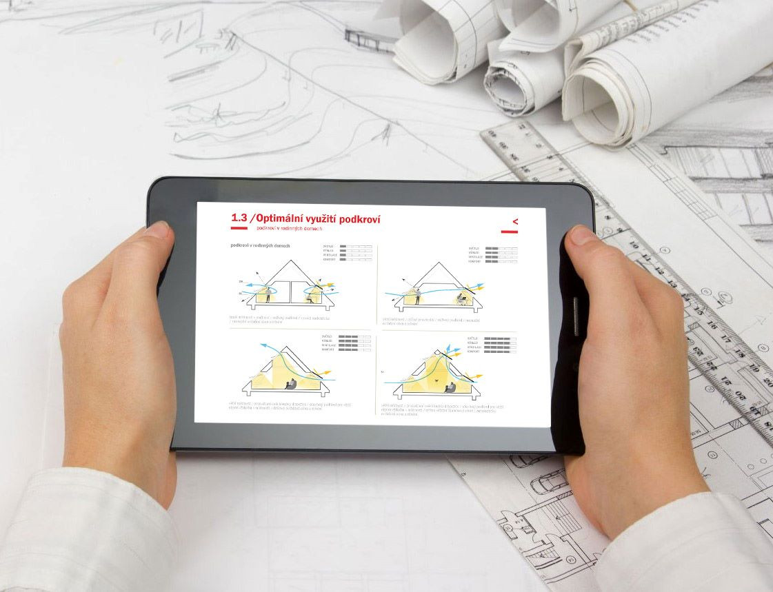 Společnost VELUX proto vydala příručku Design Guide, která je primárně určena pro projektanty a architekty. Nabízí souhrn informací od základů návrhu podkroví až po varianty uspořádání zařizovacích předmětů či nábytku v souvislosti s vhodným umístěným střešních oken a dalších produktů VELUX. Stručně, přehledně a pomocí názorných nákresů spolu s citacemi příslušných normových požadavků a zdůrazněním možných kolizních situací.