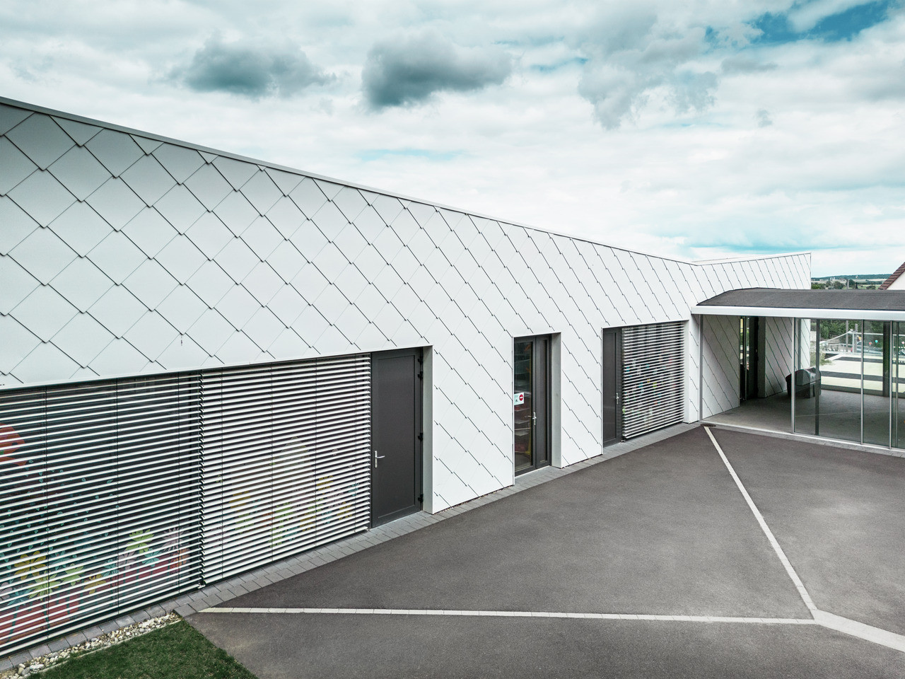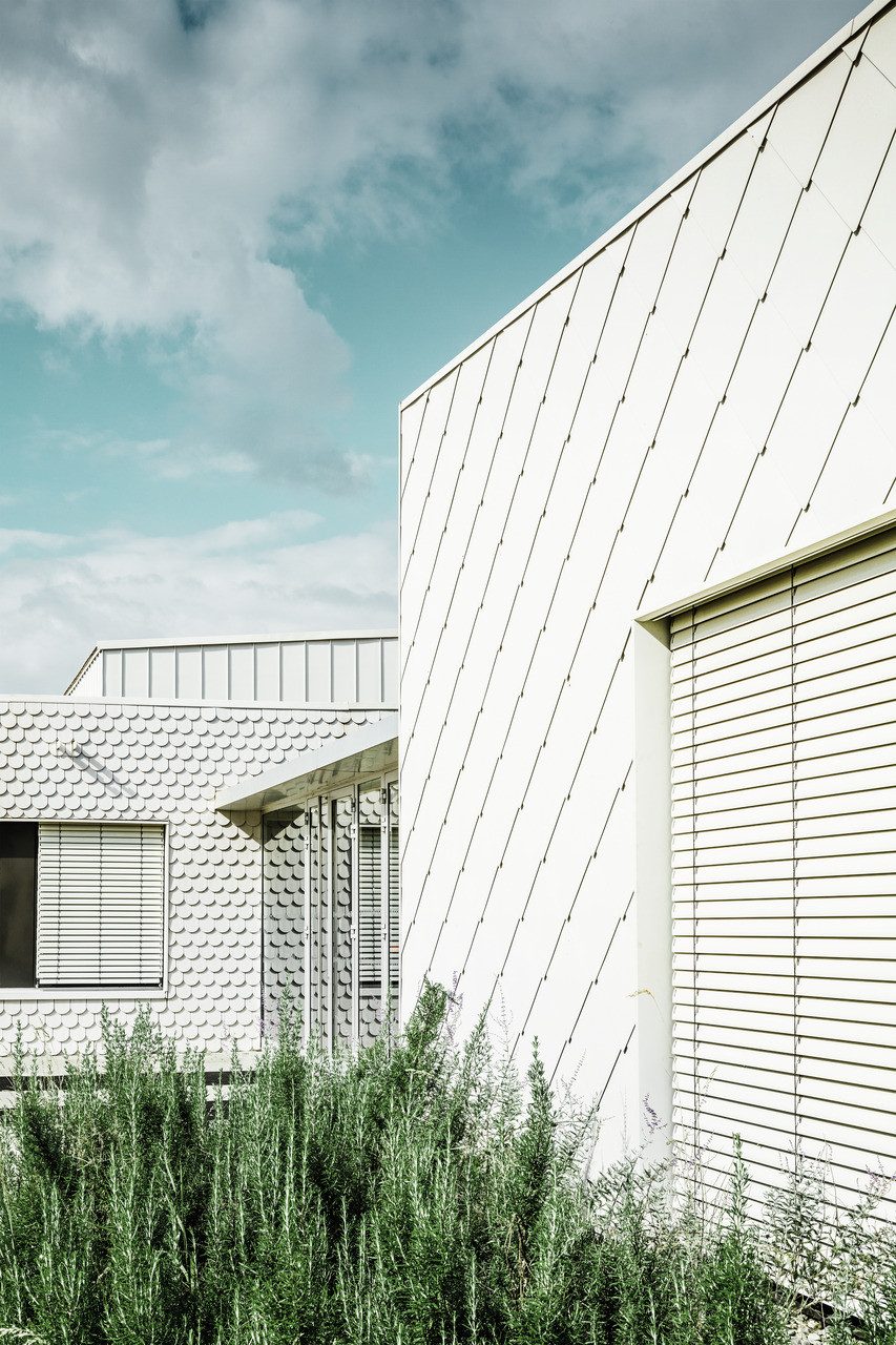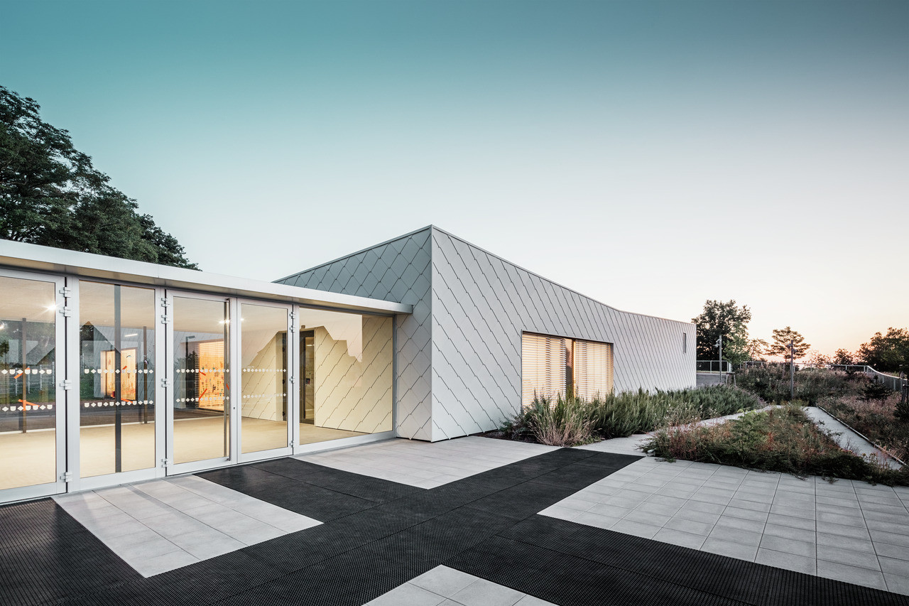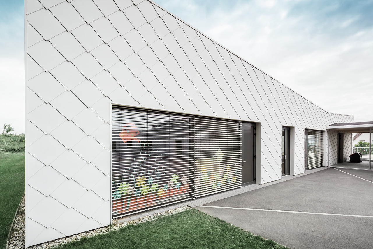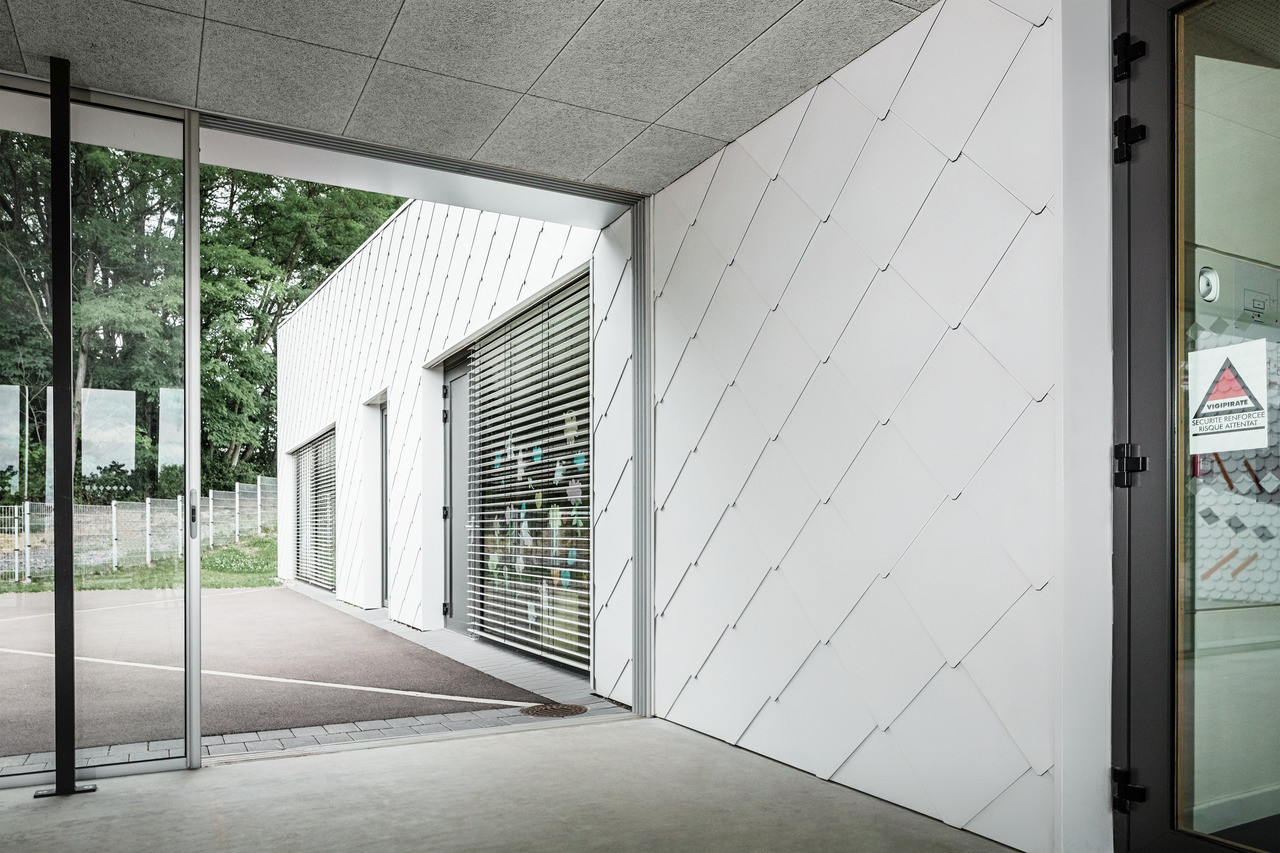 Jasně bílá, pragmaticky jasná. Nová školní družina zaujme zářivou šupinovitou fasádou z hliníku