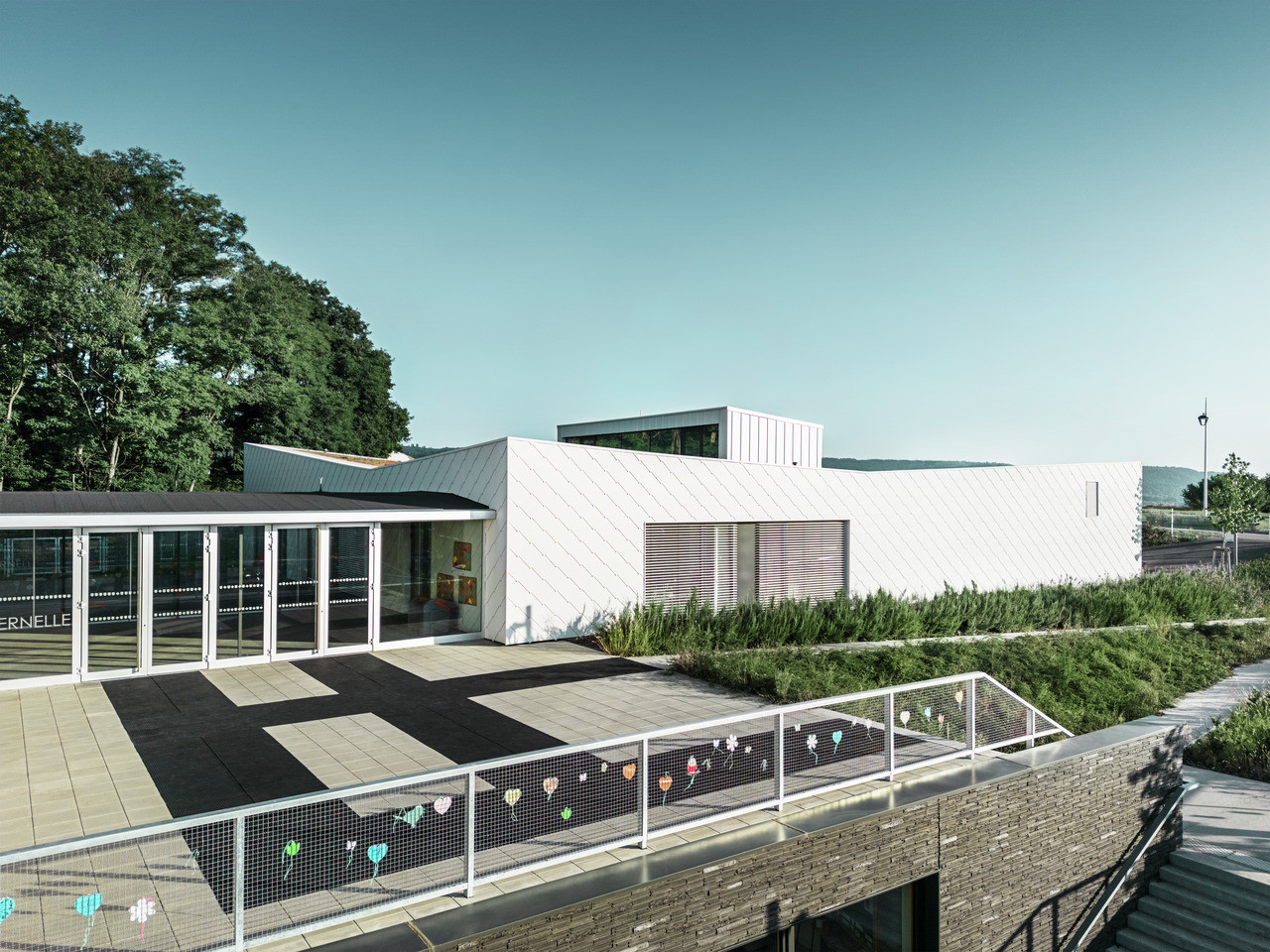 Ve městečku Otterswiller, nedaleko Štrasburku, měla nově zrekonstruovaná školní budova získat nové centrum mimoškolní péče a další prostory pro pohyb malých školáků. Stávající objekt, který se nachází naproti louce s ovocnými stromy, zalesněné ploše a rodinným domů z různých stavebních období, představující typický konec alsaského městečka – byl nevhodně umístěn ve svažitém terénu.