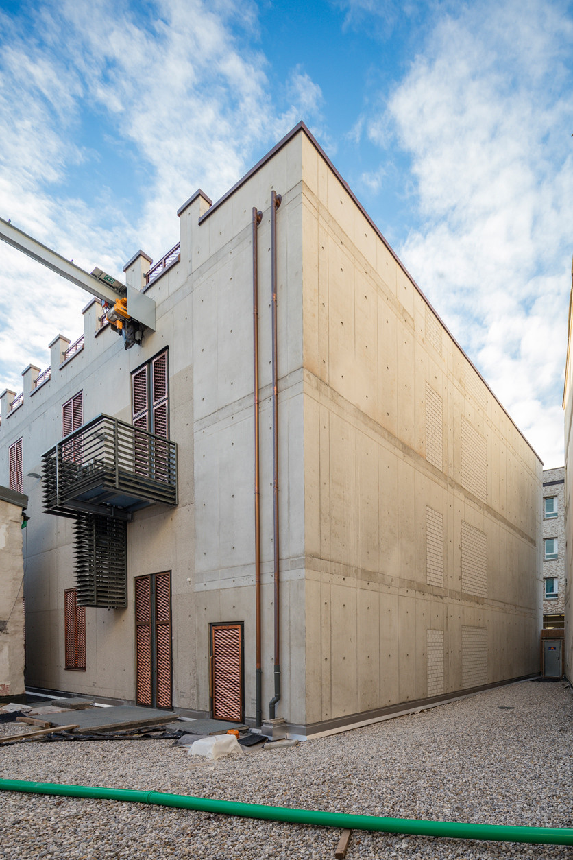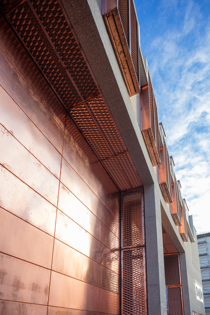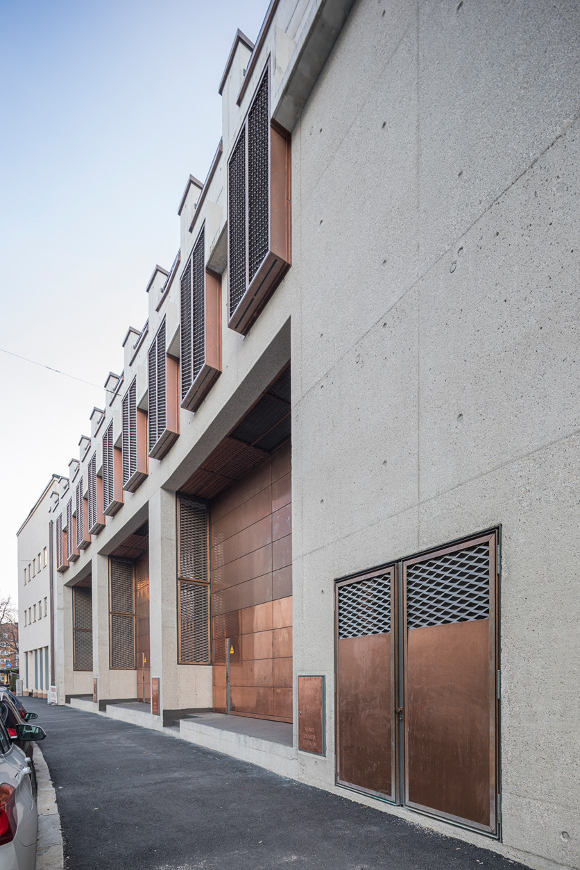 Architekti vsadili na materiály s industriálním charakterem, které se u podobných projektů běžně používají a nechali je vyznít v jejich přirozené podobě. Nosnou konstrukci proto tvoří železobeton, který bez povrchových úprav modeluje také fasády domu, další prvky a detaily, jako jsou vrata, římsy či mříže pak architekti nechali vyrobit z lesklého měděného plechu.