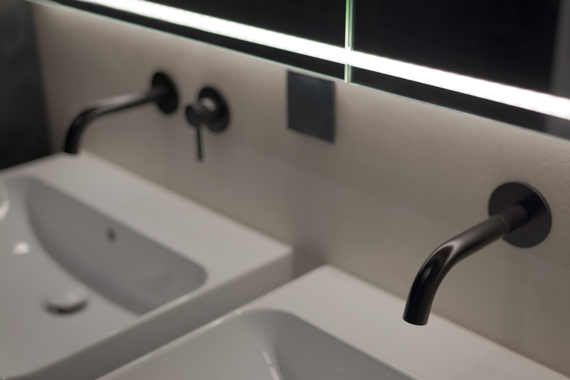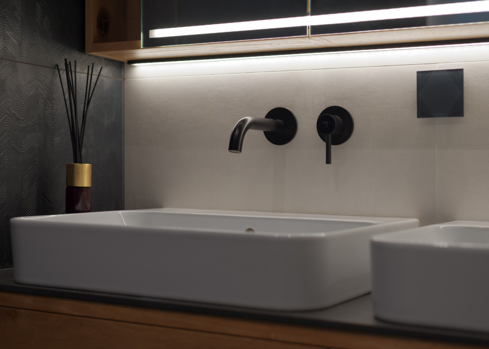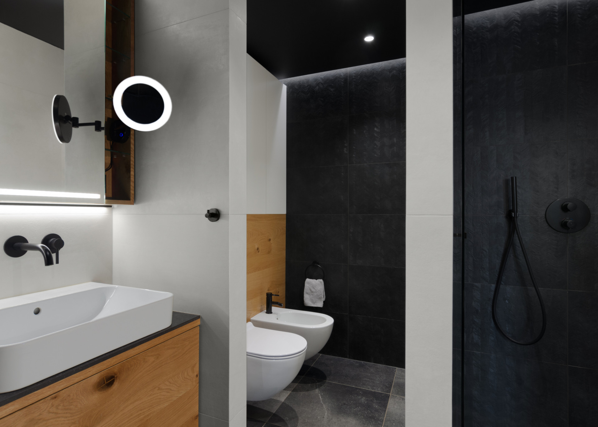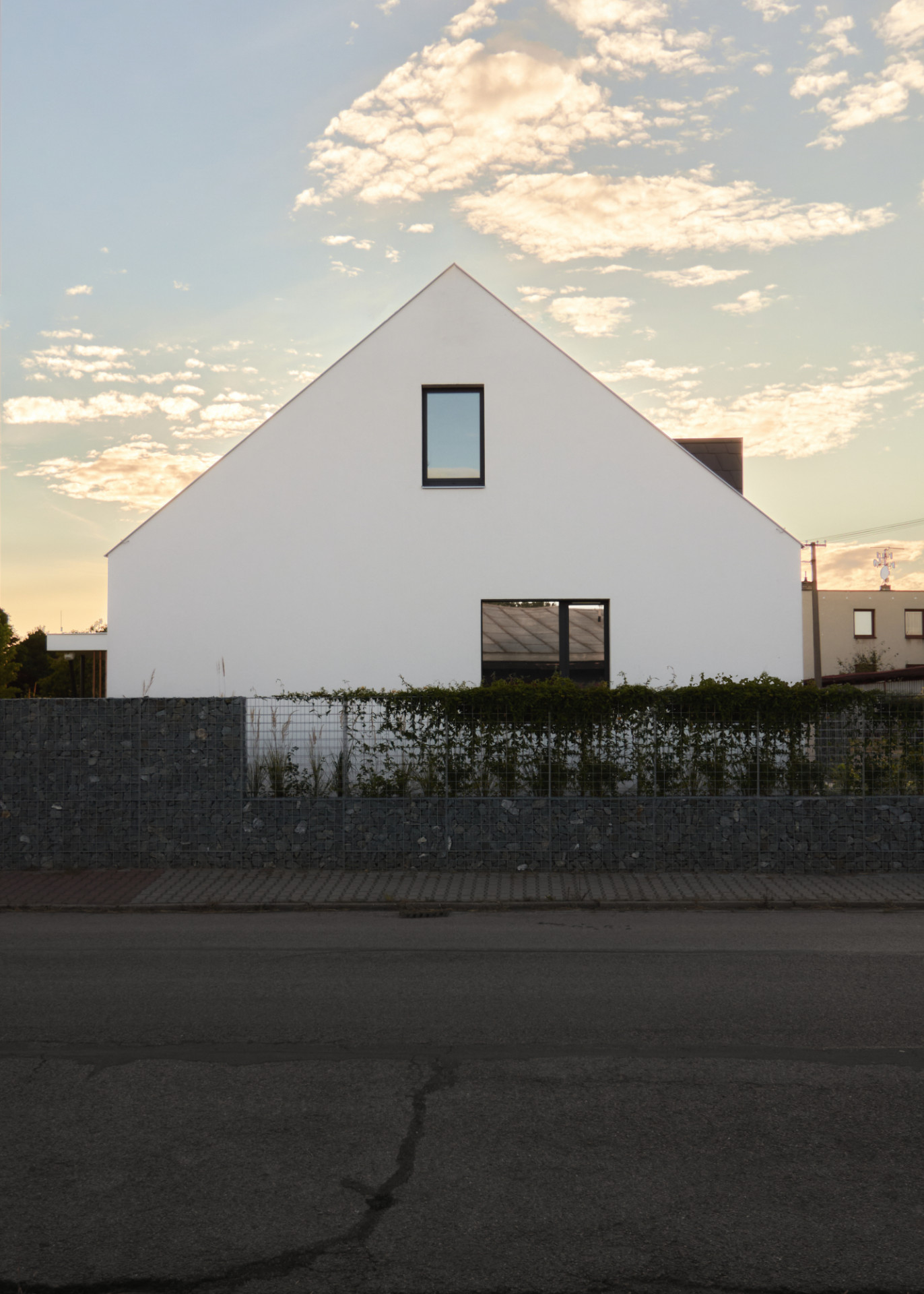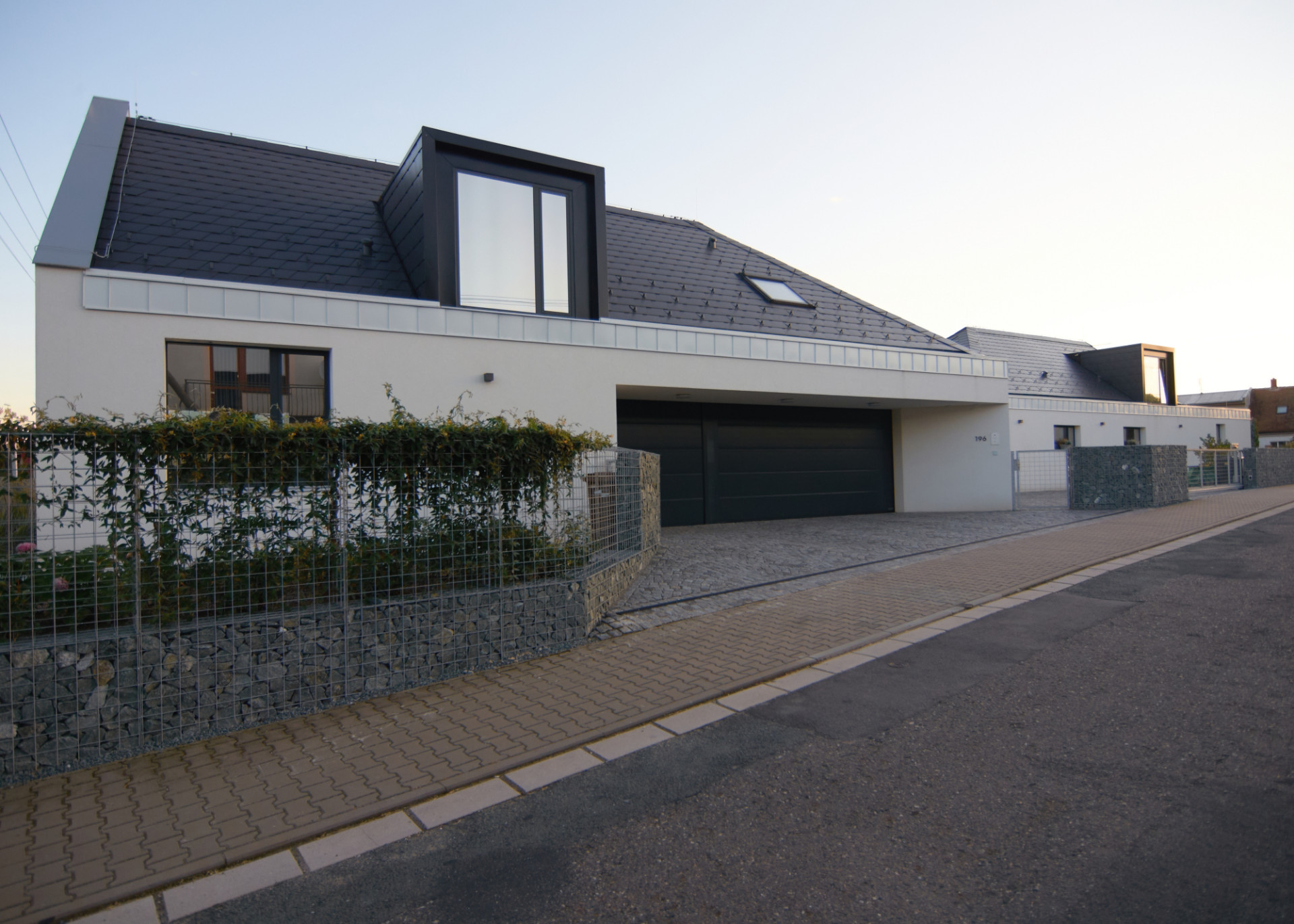 Hmotová i dispoziční řešení jednotlivých částí dvojdomu navrhli architekti v odlišném duchu. První dům blíže k ulici definuje klasický štít, které majitelům nabízí plnohodnotné podkroví. Do jeho přízemí architekti umístili hlavní obytný prostor a v patře najdeme všechny ložnice a hygienické zázemí.