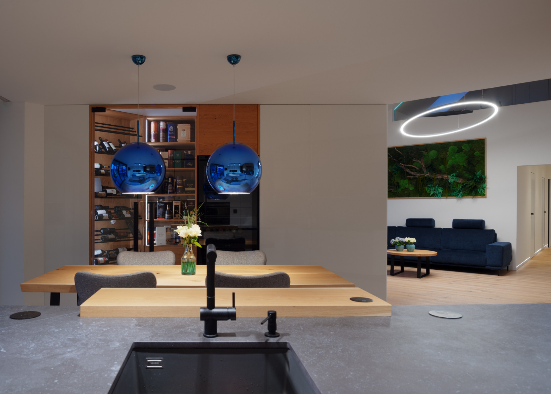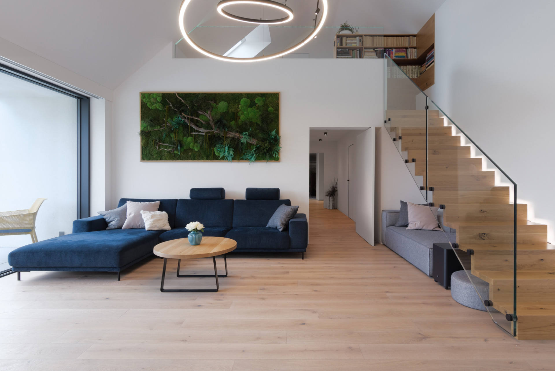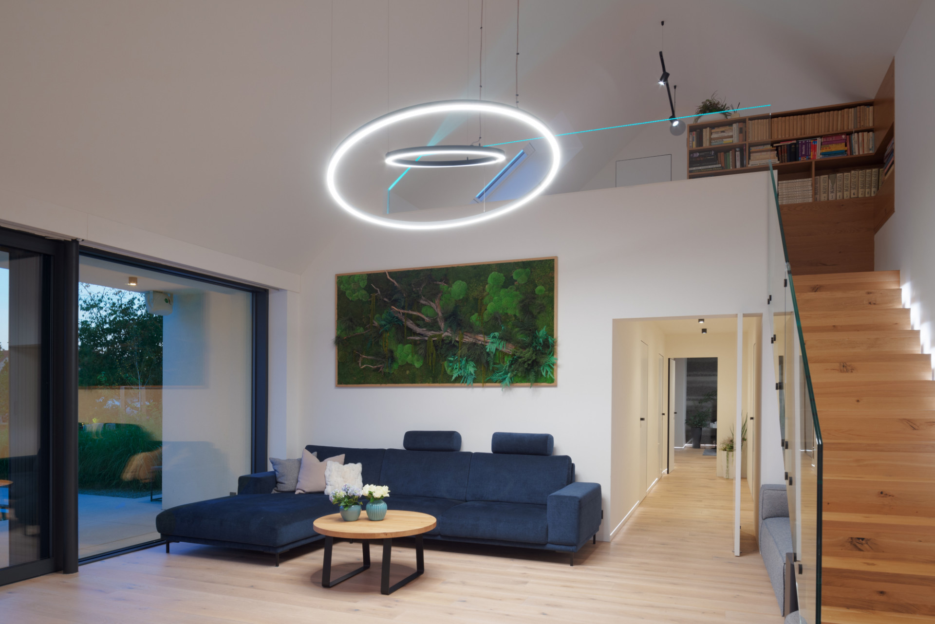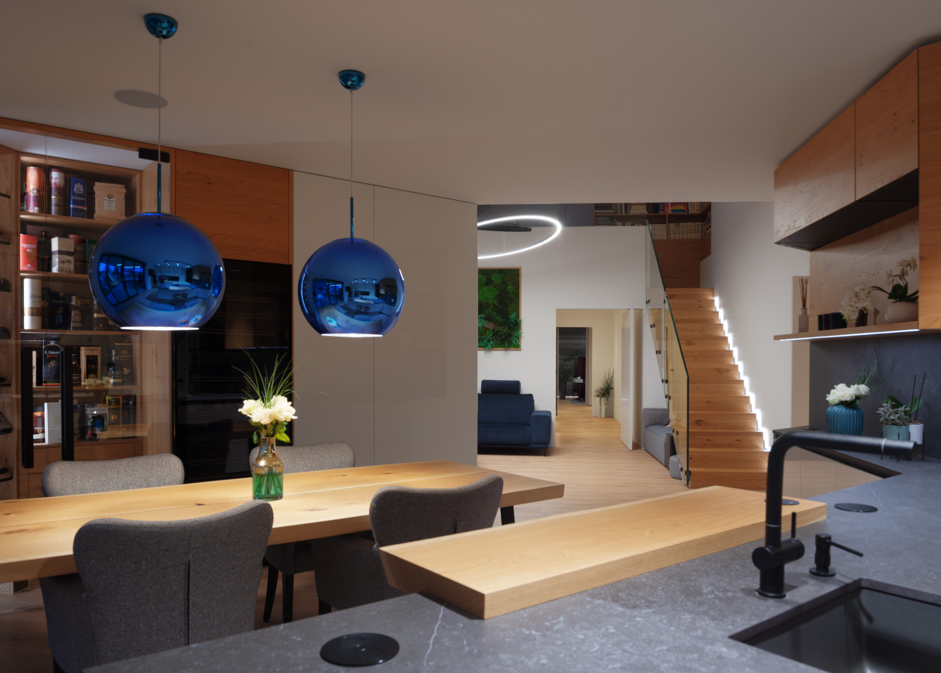 Zpracování interiéru ctí přání majitelů vytvořit maximálně jednoduché prostory bez zbytečných detailů a dekorací. Architekti pracovali hlavně s přírodními materiály, podmínkou byla dřevěná podlaha. Pro ni nakonec vybrali bělený zakouřený dub se suky barvenými do tmavě hněda. Vybavení domu zahrnuje také několik vychytávek chytré domácnosti: v každé místnosti si lze nastavit atmosféru podle barvy i intenzity světla díky osvětlení RGB, díky pohybovým senzorům nenajdeme v domě jediný vypínač a bezdrátové nabíjení elektroniky je zabudováno i v kuchyňské lince.