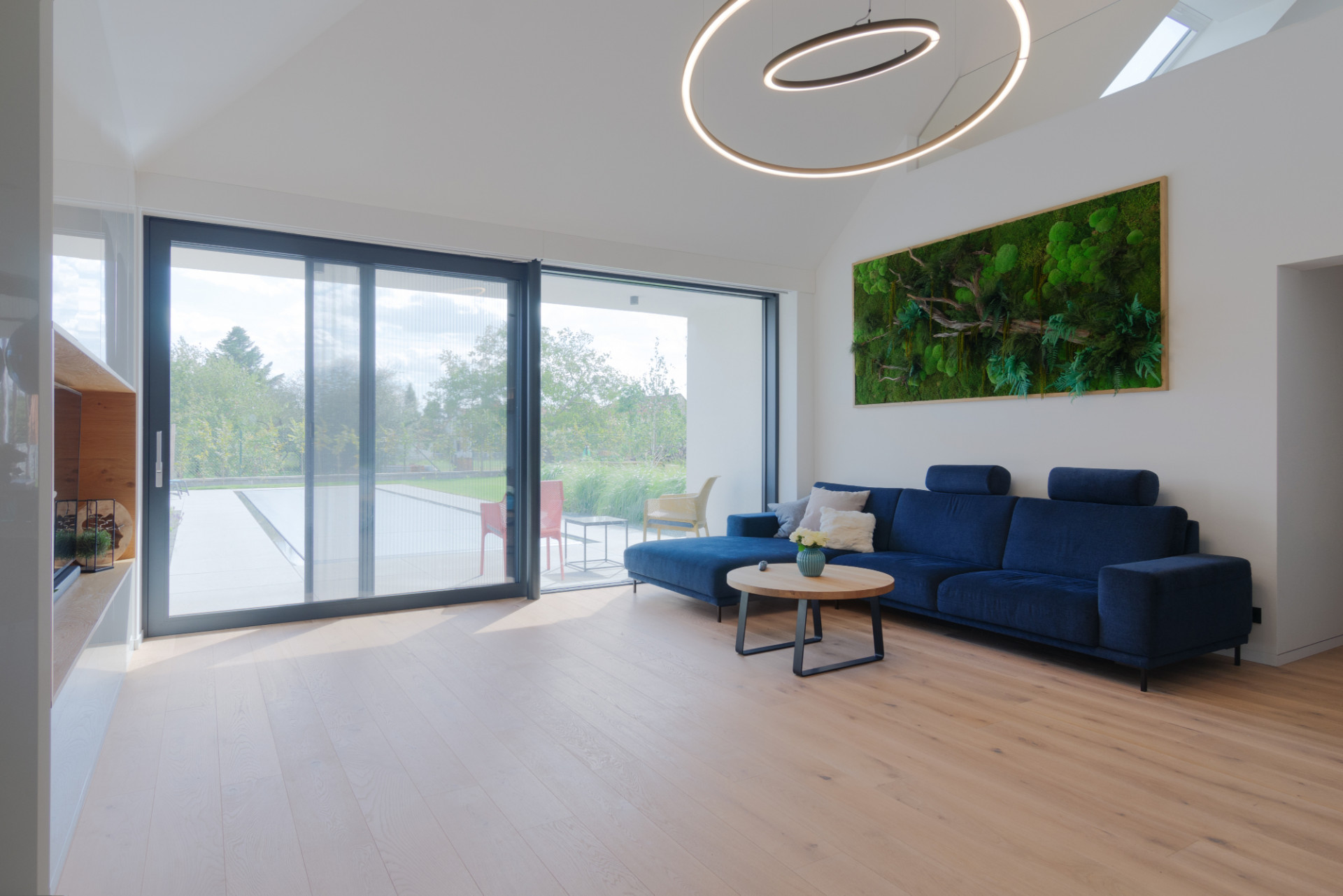Druhý dům, který na první navazuje průchozí hmotou garáže, je koncipován naopak převážně jako přízemní stavba. Interiér domu podstatně rozšiřuje krytá terasa, která dále navazuje na velký bazén – díky velkým proskleným výplním se navíc zahrada vizuálně stává součástí velkého obytného prostoru. Malé podkroví majitelé využívají k relaxaci i práci.