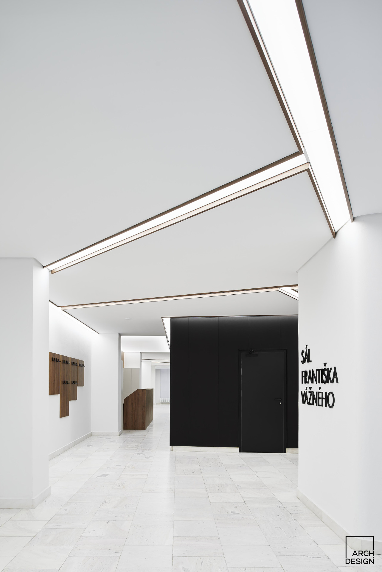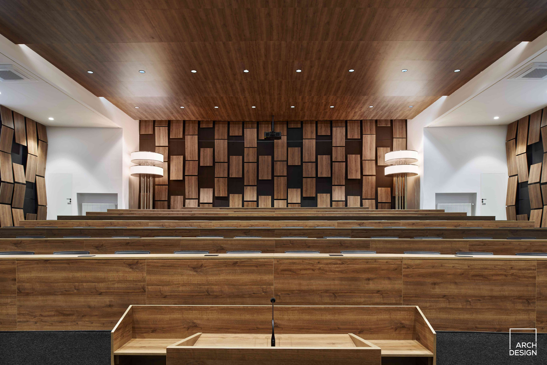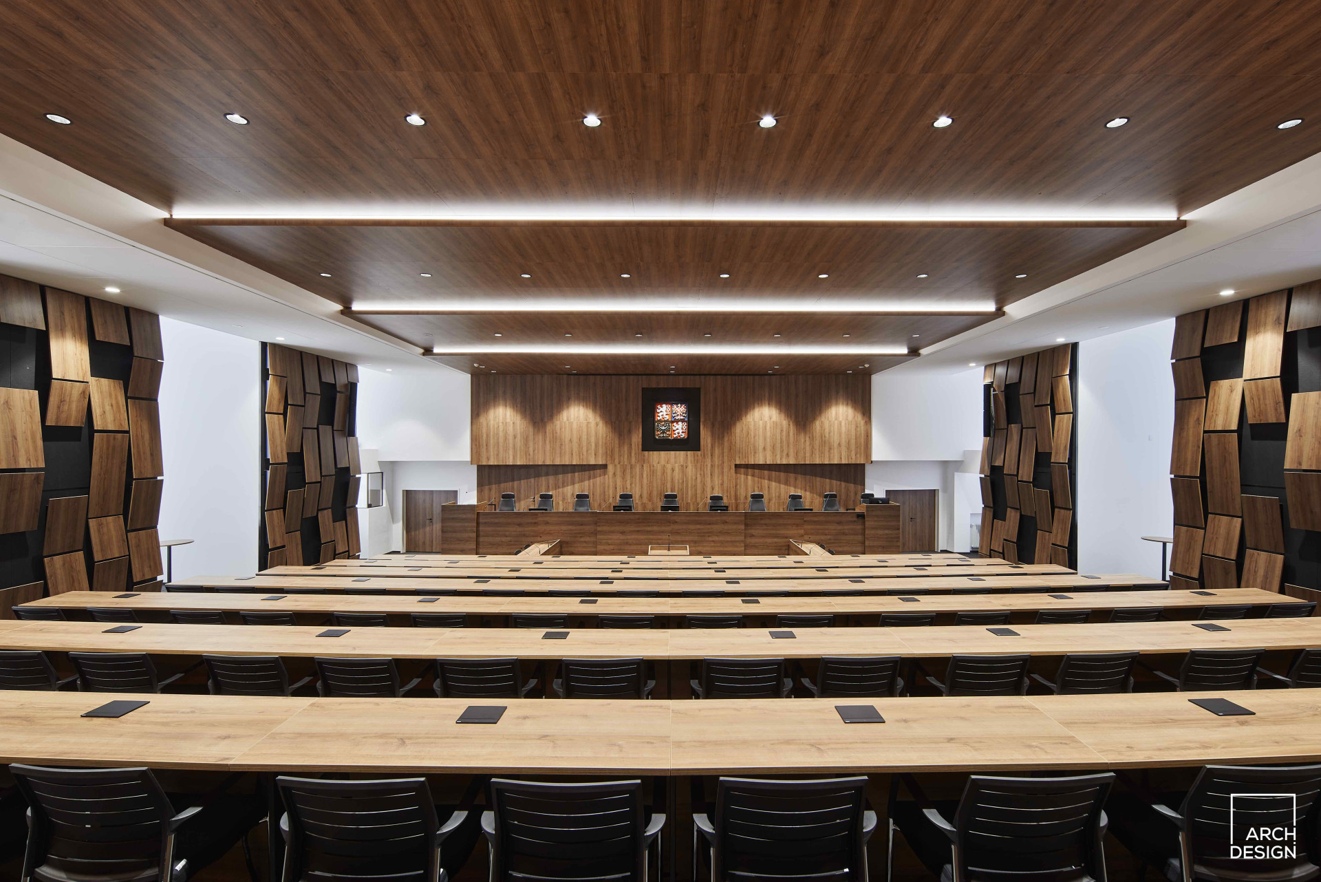 „Rekonstrukce prostoru jednacího sálu z velké části navazuje na původní provozní a dispoziční řešení, rekonstruovaný prostor je však doplněn o soudobé požadavky jak estetického charakteru, tak technického řešení. Celá budova je pod památkovou ochranou, tedy bylo nutné přistupovat k návrhu a realizaci s respektem a pokorou,“ říkají autoři návrhu.