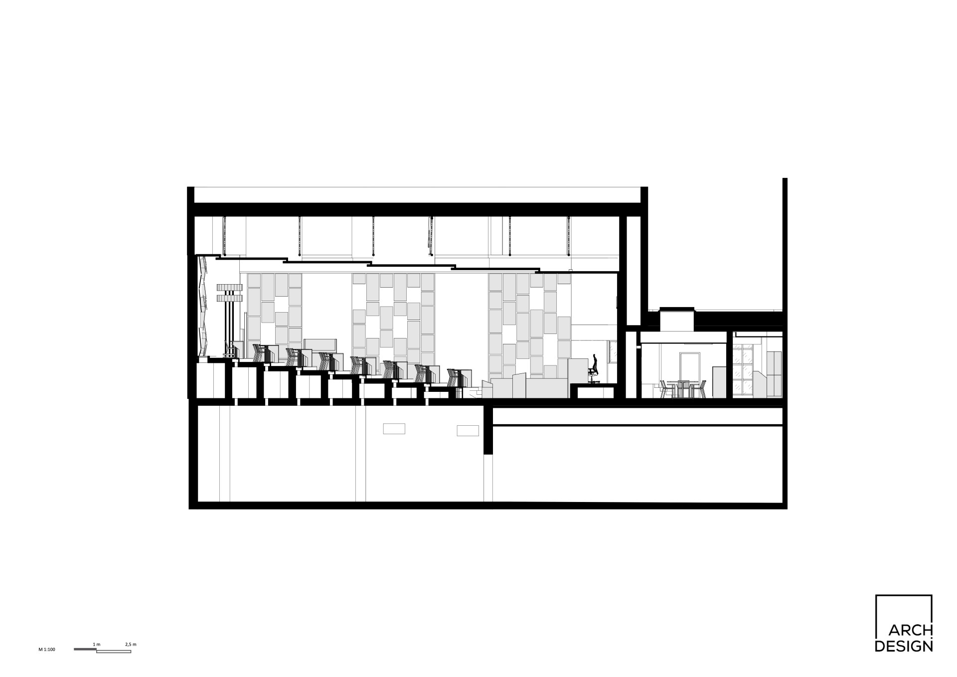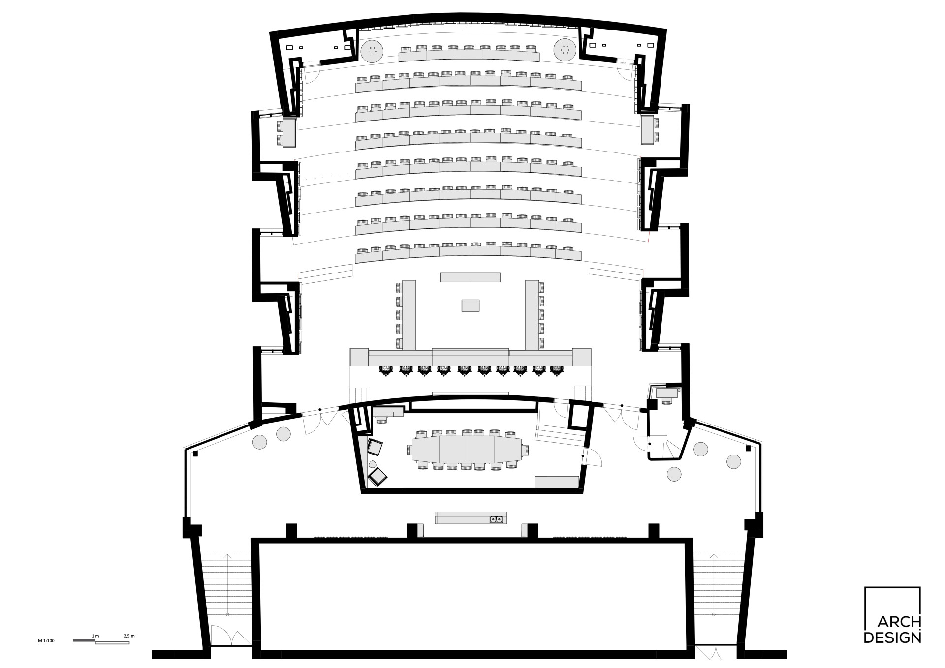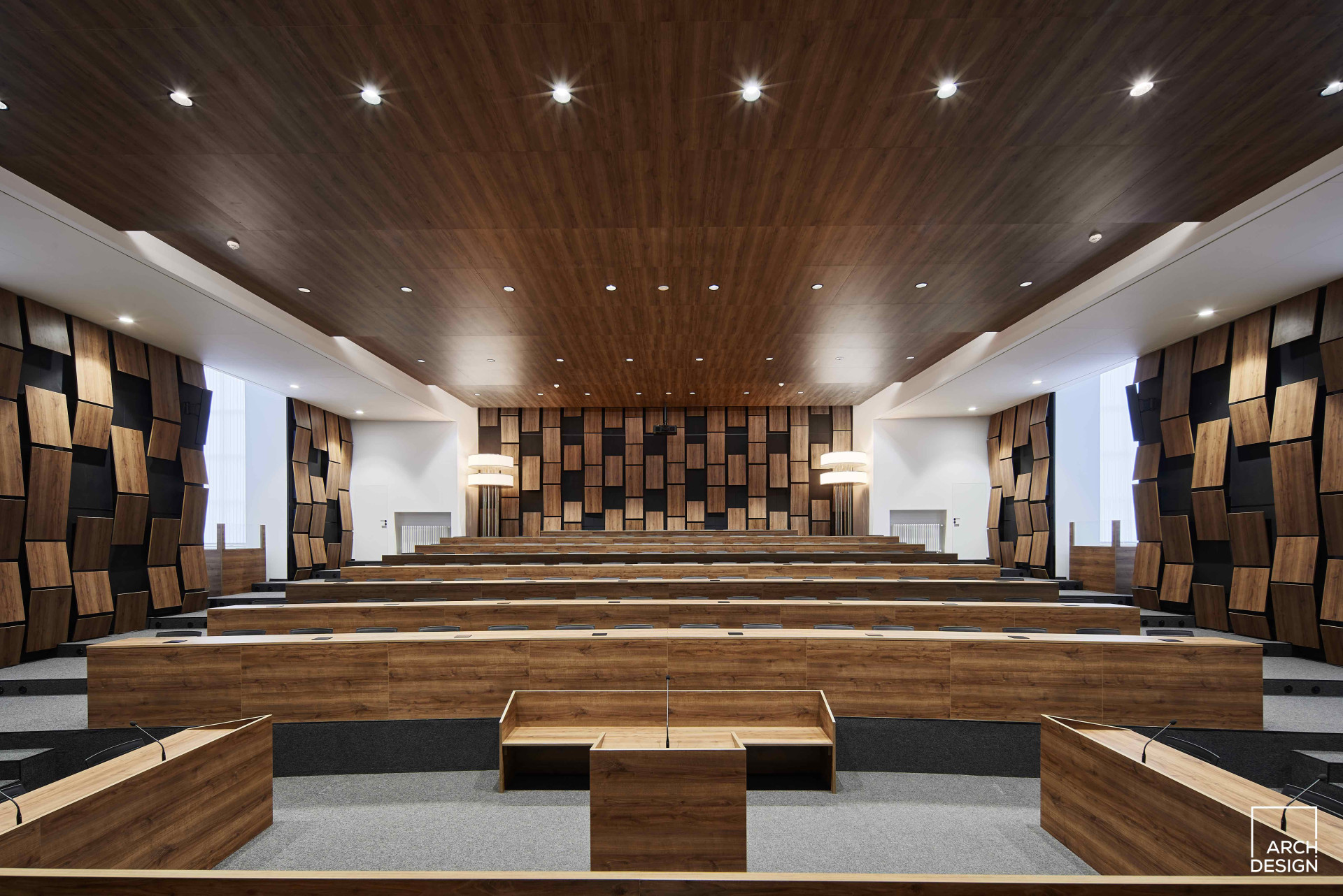 „Rekonstrukce prostoru jednacího sálu z velké části navazuje na původní provozní a dispoziční řešení, rekonstruovaný prostor je však doplněn o soudobé požadavky jak estetického charakteru, tak technického řešení. Celá budova je pod památkovou ochranou, tedy bylo nutné přistupovat k návrhu a realizaci s respektem a pokorou,“ říkají autoři návrhu.
