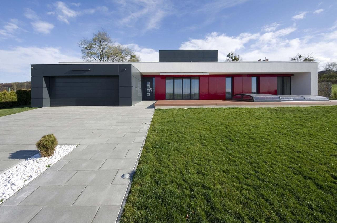 Dům je navržen přísně jednoduše. Koncepcí architekta současně dle vkusu klienta bylo navrhnout dům velice elegantní a tvarově jednoduchý. Byl tedy zvolen základní tvar obdélníku, který je lemován bílou linií. Tato má své praktické opodstatnění, neboť svým předsazením v odpoledních hodinách poskytuje přirozené stínění všem obytným místnostem. Zároveň tuto hlavní hmotu rámuje a vymezuje. K tomuto prvku jsou již přidány pouze dvě doplňkové hmoty a sice menší, která je umístěna nad obývacím pokojem a tvoří vyvýšený prostor nad hlavní obytnou částí domu a druhá hmota, která tvoří garáž a vybíhá z hlavní hmoty vstříc příjezdové cestě.