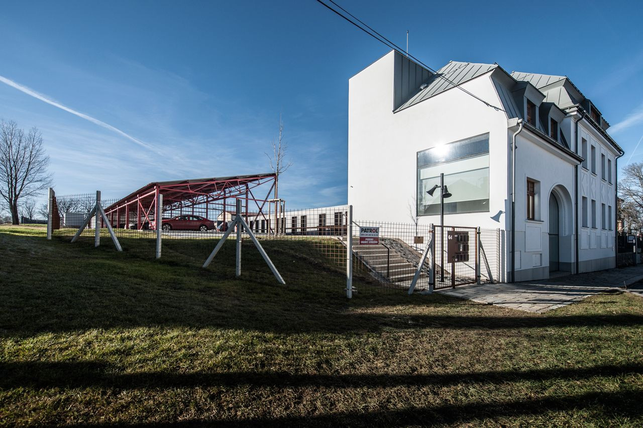 Mjölk architekti, Palmovka Jihlava / Rekonstrukce části průmyslového areálu Jihlavan, boční pohled na parking, hlavní vstup do objektu a fasádu s oknem – foto