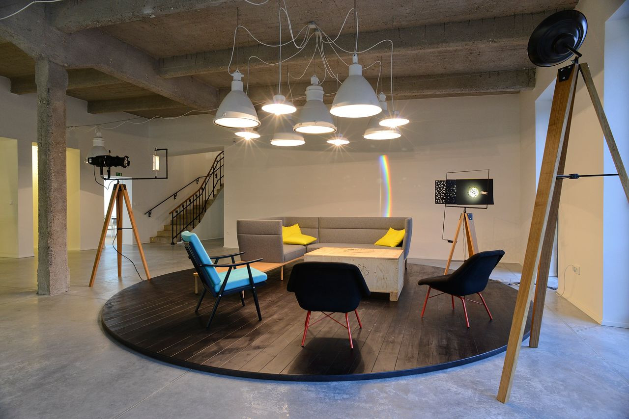 Mjölk architekti, Palmovka Jihlava / Rekonstrukce části průmyslového areálu Jihlavan, lustr vyrobený ze zářivek – foto