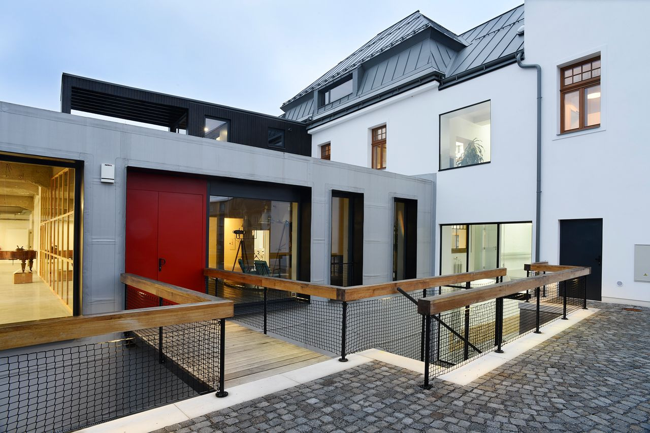 Mjölk architekti, Palmovka Jihlava / Rekonstrukce části průmyslového areálu Jihlavan, hlavní vstup přes lávku – foto