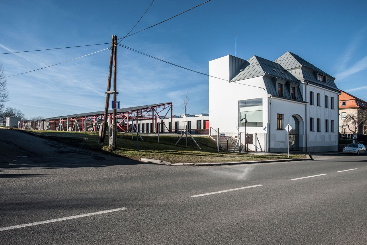 Mjölk architekti, Palmovka Jihlava / Rekonstrukce části průmyslového areálu Jihlavan, pohled ze Znojemské ulice, vlevo repasovaná ocelová hala – foto